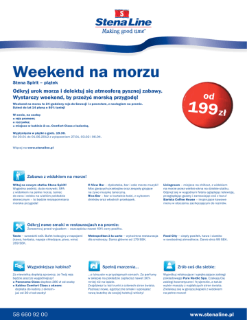 Weekend na morzu Stena Spirit – piątek Odkryj urok morza i delektuj się atmosferą pysznej zabawy. Wystarczy weekend, by przeżyć morską przygodę! Weekend na morzu to 24-godzinny rejs do Szwecji i z powrotem, z noclegiem na promie. Dzieci do lat 14 płyną o 50% taniej! W cenie, na osobę: £ rejs promem; £ rozrywka; £ miejsce w kabinie 2-os. Comfort Class z łazienką. od 199 zł Wypłynięcia w piątki o godz. 19.30. Od 20.01 do 01.06.2012 z wyłączeniem 27.01, 03.02 i 06.04. Więcej na www.stenaline.pl Zabawa z widokiem na morze! Witaj na nowym statku Stena Spirit! Wygodna podróż, dużo rozrywki, SPA z widokiem na pełne morze, taniec do rana i relaks na wielkim pokładzie słonecznym – to będzie niezapomniana morska przygoda! C-View Bar – dyskoteka, bar i całe morze muzyki! Moc gorących przebojów oraz zespoły grające na żywo muzykę taneczną. Riva Bar – bar w kształcie łodzi, z wyborem drinków oraz włoskich przekąsek. Livingroom – miejsce na chillout, z widokiem na morze przez wielkie okna na dziobie statku. Odpręż się w wygodnym fotelu oglądając telewizję, przeglądając gazety i zamawiając coś z baru! Barista Coffee House – inspirujące kawowe menu w otoczeniu zachęcającym do rozmów. Odkryj nowe smaki w restauracjach na promie: Zarezerwuj przed wyjazdem – oszczędzisz nawet 40% ceny posiłku. Taste – szwedzki stół. Bufet kolacyjny z napojami (kawa, herbata, napoje chłodzące, piwo, wino) 269 SEK. Wygodniejsza kabina? Za niewielką dopłatą sprawisz, że Twój rejs będzie jeszcze wygodniejszy! £ Panorama Class dopłata 280 zł od osoby £ Kabina Comfort Class z oknem: dopłata do kabiny z oknem– już od 30 zł od osoby! 58 660 92 00 Metropolitan à la carte – wykwintna restauracja dla smakoszy. Dania główne od 179 SEK. Spełnij marzenia… …o luksusie w przystępnych cenach. Za perfumy w sklepie na pokładzie zapłacisz nawet 30% mniej niż na lądzie. Znajdziesz tu też trunki z czterech stron świata. Poznasz nowe, egzotyczne smaki i upolujesz nową butelkę do swojej kolekcji whisky! Food City – ciepły posiłek, kawa i ciastko w swobodnej atmosferze. Danie dnia 99 SEK. Zrób coś dla siebie: Wypróbuj relaksujące i upiększające zabiegi pokładowego Pure Nordic Spa. Czekają Cię zabiegi kosmetyczne i fryzjerskie, a także wybór masaży z najdalszych stron świata. Zrelaksuj się w gorącej kąpieli z widokiem na pełne morze! www.stenaline.pl Weekend na morzu Stena Spirit – piątek Piątek: 18.30 Odprawa biletowa. 19.30 Wypłynięcie z portu. Z pokładów otwartych możesz podziwiać Gdynię. Wieczorna impreza: 21.00-01.00 Muzyka za żywo w Metropolitan Bar. Tańcz i ciesz się niepowtarzalną atmosferą wieczoru! 22.00-01.00 Czynny stół do Black Jacka w Metropolitan Bar. Sprawdź swoje szczęście! 22.00-03.00 Dyskoteka w C-View Bar, gra DJ. Zaszalej na parkiecie! 01.00-03.00 Black Jack w C-View Bar. Może tym razem sie uda? Sobota rano: 06.30 Już widać pierwsze szkierowe wysepki Karlskrony. Wyjdź na pokłady otwarte i podziwiaj krajobraz. Zrobisz piękne zdjęcia! 07.30-09.00 Postój promu w Karlskronie – nie ma zejścia na ląd. Rozrywkowy dzień na statku: 11.00 Pokaz filmu w C-View bar. Przyjdź i odpocznij po gorącej nocy. 13.00 Zapraszamy na kolejny film na dużym ekranie w C-View Bar. 15.00 Gramy w bingo - emocje i dobra zabawa! Kolejne atrakcje: 16.30-18.30 Happy hour - zapraszamy do naszych barów. 17.00-19.00 Muzyka na żywo w Metropolitan Bar. Czas na kawę, drinka i wirowanie na parkiecie! 17.00 Seans filmowy na dużym ekranie w C-View Bar. Chwila odprężenia dla Ciebie. 17.00-19.00 Trochę hazardu przy stole do Black Jacka w Metropolitan Bar. Może wygrasz fortunę! 16.30-19.00 Ostatnia szansa na zakupy w pokładowym sklepie. Zadbaj o pamiątki! 19.30 Zejście na ląd w Gdyni. Do zobaczenia! Zastrzegamy sobie prawo do zmian w programie. 58 660 92 00 www.stenaline.pl