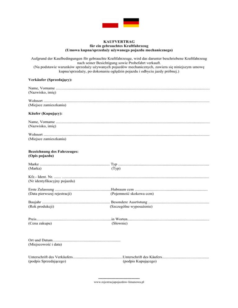 KAUFVERTRAG für ein gebrauchtes Kraftfahrzeug (Umowa kupna/sprzedaży używanego pojazdu mechanicznego) Aufgrund der Kaufbedingungen fϋr gebrauchte Kraftfahrzeuge, wird das darunter beschriebene Kraftfahrzeug nach seiner Besichtigung sowie Probefahrt verkauft. (Na podstawie warunków sprzedaży używanych pojazdów mechanicznych, zawiera się niniejszym umowę kupna/sprzedaży, po dokonaniu oględzin pojazdu i odbyciu jazdy próbnej.) Verkäufer (Sprzedający): Name, Vorname .......................................................................................................................................................... (Nazwisko, imię) Wohnort ...................................................................................................................................................................... (Miejsce zamieszkania) Käufer (Kupujący): Name, Vorname .......................................................................................................................................................... (Nazwisko, imię) Wohnort ...................................................................................................................................................................... (Miejsce zamieszkania) Bezeichnung des Fahrzeuges: (Opis pojazdu) Marke ...................................................................... Typ ........................................................................................... (Marka) (Typ) Kfz.- Ident. Nr. ....... ................................................................................................................................................... (Nr identyfikacyjny pojazdu) Erste Zulassung ........................................................Hubraum ccm ......................................................................... (Data pierwszej rejestracji) (Pojemność skokowa ccm) Baujahr .................................................................... Besondere Ausrϋstung ............................................................. (Rok produkcji) (Szczególne wyposażenie) Preis...........................................................................in Worten.................................................................................. (Cena zakupu) (Słownie) Ort und Datum.................................................................... (Miejscowość i data) Unterschrift des Verkäufers..................................................Unterschrift des Käufers............................................... (podpis Sprzedającego) (podpis Kupującego) ------------------------------www.rejestracjapojazdow-limanowa.pl