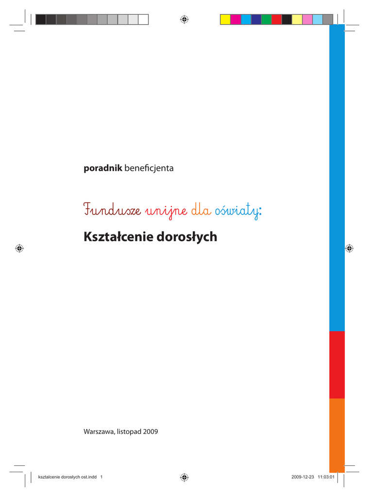 poradnik beneficjenta Fundusze unijne dla oświaty: Kształcenie dorosłych Warszawa, listopad 2009 ksztalcenie dorosłych ost.indd 1 2009-12-23 11:03:01 S Wydawca: Ministerstwo Rozwoju Regionalnego ul. Wspólna 2/4, 00-926 Warszawa www.mrr.gov.pl www.funduszeeuropejskie.gov.pl ISBN: 978-83-7610-157-6 Autor: Irena Wolińska Współpraca: Adriana Niedoszewska Elżbieta Pilch Piotr Stronkowski Redakcja merytoryczna: Ministerstwo Edukacji Narodowej Departament Funduszy Strukturalnych al. J. Ch. Szucha 25, 00-918 Warszawa tel. +48 22 34 74 881, fax +48 22 34 74 883 [email protected] www.efs.men.gov.pl ksztalcenie dorosłych ost.indd 2 2009-12-23 11:03:02 Spis treści 1 Wstęp strona 5 2 Diagnoza kształcenia ustawicznego w Polsce strona 6 Możliwości rozwiązywania problemów poprzez realizację projektów strona 15 Projekty jako sposób rozwiązywania problemów strona 30 Specyficzne wymagania i możliwości związane z poszczególnymi źródłami finansowania strona 39 Przykład wykorzystania różnych źródeł dla wzmocnienia oferty edukacyjnej strona 51 Przydatne adresy strona 53 3 4 5 6 7 ksztalcenie dorosłych ost.indd 3 2009-12-23 11:03:02 1 N śc je ją Po po pr al w N w sp pr kt m pr w cz ro Pr do za je re m W je gł ni ni ksztalcenie dorosłych ost.indd 4 2009-12-23 11:03:02 Fundusze unijne dla oświaty – kształcenie dorosłych 1. Wstęp Niniejszy poradnik ma na celu przedstawienie podstawowych informacji o możliwościach finansowania przedsięwzięć z zakresu kształcenia ustawicznego. Skierowany jest do wszystkich osób pracujących w sektorze kształcenia ustawicznego i poszukujących możliwości sfinansowania swoich pomysłów. Ponieważ poradnik jest adresowany do osób, które zajmują się lub chcą się zająć pozyskiwaniem funduszy na oświatę, zaproponowano układ odpowiadający logice pracy nad projektem – niezależnie od obszaru, w ramach którego może zostać zrealizowany. Poradnik prowadzi Czytelnika przez wszystkie etapy procesu przygotowania projektu. Na początku zamieszczono podstawowe informacje o kształceniu ustawicznym, wskazując najważniejsze problemy i wyzwania, a tym samym pokazując, w jaki sposób można podejść do określenia problemu, którego rozwiązaniu będzie służył projekt. Następnie omówione zostały cele poszczególnych programów, w ramach których przewidziano wspieranie kształcenia ustawicznego. Jeżeli program podejmuje nasz problem, wówczas możemy starać się o pozyskanie środków na konkretny projekt. Jak się do tego zabrać, wyjaśniamy w kolejnym rozdziale, w którym omówione zostały zasady przygotowania projektu, ze wskazaniem najważniejszych, kluczowych elementów. Zwrócenie uwagi na każde z zagadnień poruszanych w tym rozdziale zdecydowanie zwiększa szanse powodzenia naszego przedsięwzięcia. Przygotowując projekt, należy zwrócić baczną uwagę na szczegółowe wymagania dotyczące realizacji projektu w ramach każdego z programów, a w szczególności: zasady składania wniosków, zasady rozliczania wydatków, zasady finansowania projektów itd. Zbagatelizowanie tych zagadnień może utrudnić lub wręcz uniemożliwić realizację projektu. Najważniejsze wymagania w ramach poszczególnych programów zostały zawarte w rozdziale czwartym. W ostatniej części poradnika zostały zaprezentowane przykłady realizowanych projektów. Zakładamy, że przyjęta formuła poradnika/przewodnika najlepiej zobrazuje główne elementy procesu przygotowywania i wdrażania projektów, łatwo ją również uzupełnić, odwołując się do dokumentów, w których poszczególne zagadnienia opisano w sposób szczegółowy. Fundusze unijne dla oświaty – kształcenie dorosłych ksztalcenie dorosłych ost.indd 5 5 2009-12-23 11:03:02 Fundusze unijne dla oświaty – kształcenie dorosłych 2. Diagnoza kształcenia ustawicznego w Polsce Nie ma jednej definicji kształcenia ustawicznego. Termin ten używany jest zamiennie z określeniami: kształcenie permanentne, kształcenie nieustające, oświata ustawiczna, kształcenie przez całe życie (LLL – lifelong learning). Obejmuje proces podnoszenia umiejętności i kwalifikacji ogólnych i zawodowych osób dorosłych, trwający, jak sama nazwa wskazuje, przez całe życie. Realizowane jest w systemie instytucjonalnym, ale organizowanym poza formalnym systemem edukacji, poprzez szkolenia, kursy, konferencje i seminaria. Do kształcenia ustawicznego należy również tzw. kształcenie nieformalne, czyli tzw. samokształcenie, podejmowane indywidualnie (nieinstytucjonalnie) w sposób świadomy lub nieświadomy. Trzecim elementem kształcenia ustawicznego jest kształcenie instytucjonalne, formalne, organizowane w szkołach dla dorosłych i związane z uzyskiwaniem kwalifikacji powszechnie uznawanych w danym systemie prawnym. W metodyce zarządzania cyklem życia projektu (PCM), której stosowanie poleca Komisja Europejska, i która stała się podstawą do opracowania nowego wniosku o dofinansowanie w ramach PO KL, położono szczególny nacisk na etap przygotowania projektu. Na podkreślenie zasługuje wyróżnienie w tej metodyce aż trzech (z sześciu) faz, w których z różnym stopniem szczegółowości dąży się do rozpoznania i zweryfikowania problemu. Po pierwsze: w fazie programowania formułuje się programy, plany, strategie, których obowiązkowym elementem jest diagnoza uzasadniająca obrany kierunek działania. Możemy, a nawet powinniśmy w pierwszej kolejności zapoznać się z analizą leżącą u podstaw powstania programu, w ramach którego chcemy zgłosić do dofinansowania swój projekt. Po drugie: w fazie identyfikacji przeprowadza się analizy, dzięki którym przygotowujący projekt dochodzą do natury problemu, poszukują informacji potwierdzających jego rzeczywiste istnienie i naturę oraz w jaki sposób dany problem jest postrzegany przez interesariuszy. W tej fazie na bazie zidentyfikowanych problemów i ich przyczyn formułuje się cele