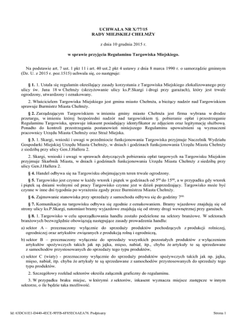 UCHWAŁA NR X/77/15 RADY MIEJSKIEJ CHEŁMŻY z dnia 10 grudnia 2015 r. w sprawie przyjęcia Regulaminu Targowiska Miejskiego. Na podstawie art. 7 ust. 1 pkt 11 i art. 40 ust.2 pkt 4 ustawy z dnia 8 marca 1990 r. o samorządzie gminnym (Dz. U. z 2015 r. poz.1515) uchwala się, co następuje: § 1. 1. Ustala się regulamin określający zasady korzystania z Targowiska Miejskiego zlokalizowanego przy ulicy św. Jana 18 w Chełmży (skrzyżowanie ulicy ks.P.Skargi i drogi przy garażach), który jest trwale ogrodzony, utwardzony i oznakowany. 2. Właścicielem Targowiska Miejskiego jest gmina miasto Chełmża, a bieżący nadzór nad Targowiskiem sprawuje Burmistrz Miasta Chełmży. § 2. Zarządzającym Targowiskiem w imieniu gminy miasto Chełmża jest firma wybrana w drodze przetargu, w imieniu której bezpośredni nadzór nad targowiskiem tj. pobieranie opłat i przestrzeganie Regulaminu Targowiska, sprawuje inkasent posiadający identyfikator ze zdjęciem oraz legitymację służbową. Ponadto do kontroli przestrzegania postanowień niniejszego Regulaminu upoważnieni są wyznaczeni pracownicy Urzędu Miasta Chełmży oraz Straż Miejska. § 3. 1. Skargi, wnioski i uwagi w przedmiocie funkcjonowania Targowiska przyjmuje Naczelnik Wydziału Gospodarki Miejskiej Urzędu Miasta Chełmży, w dniach i godzinach funkcjonowania Urzędu Miasta Chełmży z siedzibą przy ulicy Gen.J.Hallera 2. 2. Skargi, wnioski i uwagi w sprawach dotyczących pobierania opłat targowych na Targowisku Miejskim przyjmuje Skarbnik Miasta, w dniach i godzinach funkcjonowania Urzędu Miasta Chełmży z siedzibą przy ulicy Gen.J.Hallera 2. § 4. Handel odbywa się na Targowisku obejmującym teren trwale ogrodzony. § 5. Targowisko jest czynne w każdy wtorek i piątek w godzinach od 500 do 1500, a w przypadku gdy wtorek i piątek są dniami wolnymi od pracy Targowisko czynne jest w dzień poprzedzający. Targowisko może być czynne w inne dni tygodnia po wyrażeniu zgody przez Burmistrza Miasta Chełmży. § 6. Zajmowanie stanowiska przy sprzedaży z samochodu odbywa się do godziny 700. § 7. Komunikacja na targowisku odbywa się zgodnie z oznakowaniem. Bramy wjazdowe znajdują się od strony ulicy ks.P.Skargi, natomiast bramy wyjazdowe znajdują się od strony drogi wewnętrznej przy garażach. § 8. 1. Targowisko w celu uporządkowania handlu zostało podzielone na sektory branżowe. W sektorach branżowych bezwzględnie obowiązują następujące zasady prowadzenia handlu: a) sektor A – przeznaczony wyłącznie do sprzedaży produktów pochodzących z produkcji rolniczej, ogrodniczej oraz artykułów związanych z produkcją rolną i ogrodniczą, b) sektor B – przeznaczony wyłącznie do sprzedaży wszystkich pozostałych produktów z wyłączeniem artykułów spożywczych takich jak np. jajka, mięso, nabiał, itp., chyba że artykuły te są sprzedawane z samochodów przystosowanych do sprzedaży tego typu produktów, c) sektor C (wiaty) - przeznaczony wyłącznie do sprzedaży produktów spożywczych takich jak np. jajka, mięso, nabiał, itp. chyba że artykuły te są sprzedawane z samochodów przystosowanych do sprzedaży tego typu produktów. 2. Szczegółowy rozkład sektorów określa załącznik graficzny do regulaminu. 3. W przypadku braku miejsc, w którymś z sektorów, inkasent wyznacza miejsce zastępcze w innym sektorze, o ile będzie taka możliwość. Id: 63DC61E1-D440-4ECE-9FFB-6F85EC6AEA78. Podpisany Strona 1 § 9. Nie przewiduje się rezerwacji miejsc, w związku z tym o bezpośredniej kolejności ich zajmowania decyduje kolejność pojawienia się osób handlujących na targowisku. Zajmowanie miejsc na Targowisku oraz ustawianie straganów, ław, stołów i wszelkiego rodzaju sprzętu odbywa się z uwzględnieniem powyższego zapisu według wskazań inkasenta. Wskazane miejsca do sprzedaży nie mogą być odstępowane innym osobom. § 10. Zabrania się lokalizowania stałych obiektów handlowych (kiosków) na płycie Targowiska. § 11. Uprawnionymi do prowadzenia handlu na terenie Targowisku są: osoby fizyczne, osoby prawne i jednostki organizacyjne nie posiadające osobowości prawnej, które uiściły opłatę targową. § 12. Sprzedawcy są zobowiązani do uiszczenia jednorazowej opłaty targowej za korzystanie z miejsca na Targowisku niezwłocznie po wjeździe na Targowisko, zgodnie z obowiązującym cennikiem, który wywieszony jest na tablicy ogłoszeń umieszczonej na budynku zlokalizowanym na Targowisku. § 13. Sprzedający i kupujący powinni bezwzględnie przestrzegać Regulaminu Targowiska, który jest wywieszony na tablicy informacyjnej umieszczonej na budynku zlokalizowanym na Targowisku. § 14. Targowisko jest powszechnym miejscem sprzedaży wszelkich artykułów przemysłowych, spożywczych i rolnych za wyjątkiem towarów, na sprzedaż których wymagane jest uzyskanie zezwolenia odpowiednich organów na podstawie przepisów szczególnych. § 15. Grzyby surowe dziko rosnące i suszone dopuszcza się do sprzedaży na warunkach określonych przepisami o ich obrocie. § 16. Na Targowisku zabrania się: 1) uprawiania gier hazardowych, żebrania i wróżenia; 2) prowadzenia sprzedaży w drodze publicznych losowań lub przetargów; 3) dewastowania urządzeń; 4) parkowania samochodów, które nie mają bezpośredniego związku ze sprzedażą; 5) wprowadzania psów oraz innych zwierząt nie będących przedmiotem sprzedaży; 6) wieszania towarów oraz innych rzeczy na ogrodzeniach i bramach, a także mocowania do nich rowerów i motorów oraz innych środków lokomocji; 7) chodzenia po terenach zielonych – trawnikach oraz wykładania na nich towaru. § 17. Sprzedaż towaru, co do którego zachodzi uzasadnione podejrzenie, że pochodzi on z kradzieży lub innego nielegalnego źródła, będzie wstrzymana przez inkasenta, który bezzwłocznie powiadomi właściwy organ o zaistniałym podejrzeniu. § 18. Sprzedający artykuły spożywcze winien posiadać przy swoim stoisku tabl