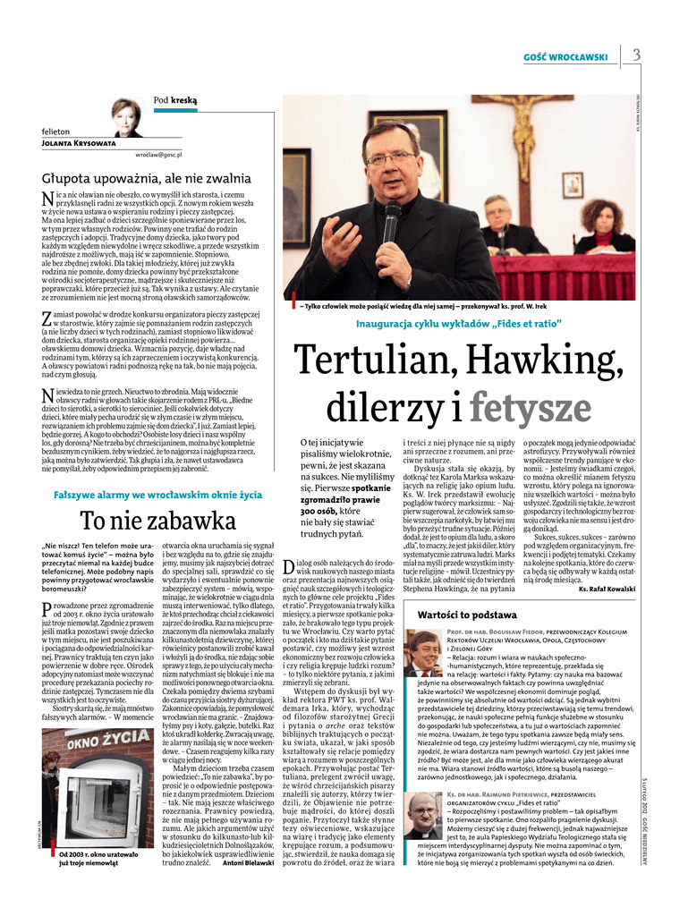 gość wrocławski ks. Rafał Kowalski Pod kreską 3 felieton Jolanta Krysowata [email protected] Głupota upoważnia, ale nie zwalnia N ic a nic oławian nie obeszło, co wymyślił ich starosta, i czemu przyklasnęli radni ze wszystkich opcji. Z nowym rokiem weszła w życie nowa ustawa o wspieraniu rodziny i pieczy zastępczej. Ma ona lepiej zadbać o dzieci szczególnie sponiewierane przez los, w tym przez własnych rodziców. Powinny one trafiać do rodzin zastępczych i adopcji. Tradycyjne domy dziecka, jako twory pod każdym względem niewydolne i wręcz szkodliwe, a przede wszystkim najdroższe z możliwych, mają iść w zapomnienie. Stopniowo, ale bez zbędnej zwłoki. Dla takiej młodzieży, której już zwykła rodzina nie pomoże, domy dziecka powinny być przekształcone w ośrodki socjoterapeutyczne, mądrzejsze i skuteczniejsze niż poprawczaki, które przecież już są. Tak wynika z ustawy. Ale czytanie ze zrozumieniem nie jest mocną stroną oławskich samorządowców. – Tylko człowiek może posiąść wiedzę dla niej samej – przekonywał ks. prof. W. Irek Z amiast powołać w drodze konkursu organizatora pieczy zastępczej w starostwie, który zajmie się pomnażaniem rodzin zastępczych (a nie liczby dzieci w tych rodzinach), zamiast stopniowo likwidować dom dziecka, starosta organizację opieki rodzinnej powierza… oławskiemu domowi dziecka. Wzmacnia pozycję, daje władzę nad rodzinami tym, którzy są ich zaprzeczeniem i oczywistą konkurencją. A oławscy powiatowi radni podnoszą rękę na tak, bo nie mają pojęcia, nad czym głosują. N iewiedza to nie grzech. Nieuctwo to zbrodnia. Mają widocznie oławscy radni w głowach takie skojarzenie rodem z PRL-u. „Biedne dzieci to sierotki, a sierotki to sierociniec. Jeśli cokolwiek dotyczy dzieci, które miały pecha urodzić się w złym czasie i w złym miejscu, rozwiązaniem ich problemu zajmie się dom dziecka”. I już. Zamiast lepiej, będzie gorzej. A kogo to obchodzi? Osobiste losy dzieci i nasz wspólny los, gdy dorosną? Nie trzeba być chrześcijaninem, można być kompletnie bezdusznym cynikiem, żeby wiedzieć, że to najgorsza i najgłupsza rzecz, jaką można było zatwierdzić. Tak głupia i zła, że nawet ustawodawca nie pomyślał, żeby odpowiednim przepisem jej zabronić. Inauguracja cyklu wykładów „Fides et ratio” Tertulian, Hawking, dilerzy i fetysze O tej inicjatywie pisaliśmy wielokrotnie, pewni, że jest skazana na sukces. Nie myliliśmy się. Pierwsze spotkanie zgromadziło prawie 300 osób, które nie bały się stawiać trudnych pytań. Fałszywe alarmy we wrocławskim oknie życia To nie zabawka „Nie niszcz! Ten telefon może uratować komuś życie” – można było przeczytać niemal na każdej budce telefonicznej. Może podobny napis powinny przygotować wrocławskie boromeuszki? P Od 2003 r. okno uratowało już troje niemowląt D ialog osób należących do środowisk naukowych naszego miasta oraz prezentacja najnowszych osiągnięć nauk szczegółowych i teologicznych to główne cele projektu „Fides et ratio”. Przygotowania trwały kilka miesięcy, a pierwsze spotkanie pokazało, że brakowało tego typu projektu we Wrocławiu. Czy warto pytać o początek i kto ma dziś takie pytanie postawić, czy możliwy jest wzrost ekonomiczny bez rozwoju człowieka i czy religia krępuje ludzki rozum? – to tylko niektóre pytania, z jakimi zmierzyli się zebrani. Wstępem do dyskusji był wykład rektora PWT ks. prof. Waldemara Irka, który, wychodząc od filozofów starożytnej Grecji i pytania o arche oraz tekstów biblijnych traktujących o początku świata, ukazał, w jaki sposób kształtowały się relacje pomiędzy wiarą a rozumem w poszczególnych epokach. Przywołując postać Tertuliana, prelegent zwrócił uwagę, że wśród chrześcijańskich pisarzy znaleźli się autorzy, którzy twierdzili, że Objawienie nie potrzebuje mądrości, do której doszli poganie. Przytoczył także słynne tezy oświeceniowe, wskazujące na wiarę i tradycję jako elementy krępujące rozum, a podsumowując, stwierdził, że nauka domaga się powrotu do źródeł, oraz że wiara o początek mogą jedynie odpowiadać astrofizycy. Przywoływali również współczesne trendy panujące w ekonomii. – Jesteśmy świadkami czegoś, co można określić mianem fetyszu wzrostu, który polega na ignorowaniu wszelkich wartości – można było usłyszeć. Zgodzili się także, że wzrost gospodarczy i technologiczny bez rozwoju człowieka nie ma sensu i jest drogą donikąd. Sukces, sukces, sukces – zarówno pod względem organizacyjnym, frekwencji i podjętej tematyki. Czekamy na kolejne spotkania, które do czerwca będą się odbywały w każdą ostatnią środę miesiąca. Ks. Rafał Kowalski Wartości to podstawa Prof. dr hab. Bogusław Fiedor, przewodniczący Kolegium Rektorów Uczelni Wrocławia, Opola, Częstochowy i Zielonej Góry – Relacja: rozum i wiara w naukach społeczno-humanistycznych, które reprezentuję, przekłada się na relację: wartości i fakty. Pytamy: czy nauka ma bazować jedynie na obserwowalnych faktach czy powinna uwzględniać także wartości? We współczesnej ekonomii dominuje pogląd, że powinniśmy się absolutnie od wartości odciąć. Są jednak wybitni przedstawiciele tej dziedziny, którzy przeciwstawiają się temu trendowi, przekonując, że nauki społeczne pełnią funkcje służebne w stosunku do gospodarki lub społeczeństwa, a tu już o wartościach zapomnieć nie można. Uważam, że tego typu spotkania zawsze będą miały sens. Niezależnie od tego, czy jesteśmy ludźmi wierzącymi, czy nie, musimy się zgodzić, że wiara dostarcza nam pewnych wartości. Czy jest jakieś inne źródło? Być może jest, ale dla mnie jako człowieka wierzącego akurat nie ma. Wiara stanowi źródło wartości, które są busolą naszego – zarówno jednostkowego, jak i społecznego, działania. Ks. dr hab. Rajmund Pietkiewicz, pr