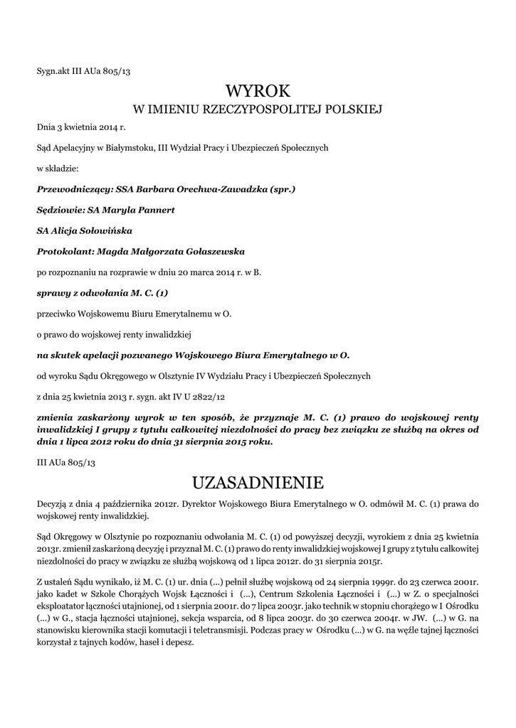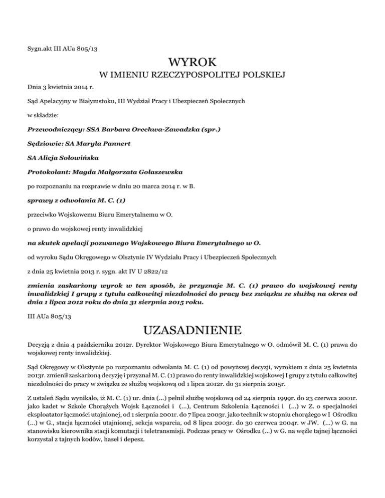 Sygn.akt III AUa 805/13 WYROK W IMIENIU RZECZYPOSPOLITEJ POLSKIEJ Dnia 3 kwietnia 2014 r. Sąd Apelacyjny w Białymstoku, III Wydział Pracy i Ubezpieczeń Społecznych w składzie: Przewodniczący: SSA Barbara Orechwa-Zawadzka (spr.) Sędziowie: SA Maryla Pannert SA Alicja Sołowińska Protokolant: Magda Małgorzata Gołaszewska po rozpoznaniu na rozprawie w dniu 20 marca 2014 r. w B. sprawy z odwołania M. C. (1) przeciwko Wojskowemu Biuru Emerytalnemu w O. o prawo do wojskowej renty inwalidzkiej na skutek apelacji pozwanego Wojskowego Biura Emerytalnego w O. od wyroku Sądu Okręgowego w Olsztynie IV Wydziału Pracy i Ubezpieczeń Społecznych z dnia 25 kwietnia 2013 r. sygn. akt IV U 2822/12 zmienia zaskarżony wyrok w ten sposób, że przyznaje M. C. (1) prawo do wojskowej renty inwalidzkiej I grupy z tytułu całkowitej niezdolności do pracy bez związku ze służbą na okres od dnia 1 lipca 2012 roku do dnia 31 sierpnia 2015 roku. III AUa 805/13 UZASADNIENIE Decyzją z dnia 4 października 2012r. Dyrektor Wojskowego Biura Emerytalnego w O. odmówił M. C. (1) prawa do wojskowej renty inwalidzkiej. Sąd Okręgowy w Olsztynie po rozpoznaniu odwołania M. C. (1) od powyższej decyzji, wyrokiem z dnia 25 kwietnia 2013r. zmienił zaskarżoną decyzję i przyznał M. C. (1) prawo do renty inwalidzkiej wojskowej I grupy z tytułu całkowitej niezdolności do pracy w związku ze służbą wojskową od 1 lipca 2012r. do 31 sierpnia 2015r. Z ustaleń Sądu wynikało, iż M. C. (1) ur. dnia (...) pełnił służbę wojskową od 24 sierpnia 1999r. do 23 czerwca 2001r. jako kadet w Szkole Chorążych Wojsk Łączności i (...), Centrum Szkolenia Łączności i (...) w Z. o specjalności eksploatator łączności utajnionej, od 1 sierpnia 2001r. do 7 lipca 2003r. jako technik w stopniu chorążego w I Ośrodku (...) w G., stacja łączności utajnionej, sekcja wsparcia, od 8 lipca 2003r. do 30 czerwca 2004r. w JW. (...) w G. na stanowisku kierownika stacji komutacji i teletransmisji. Podczas pracy w Ośrodku (...) w G. na węźle tajnej łączności korzystał z tajnych kodów, haseł i depesz. W czasie pełnienia przez wnioskodawcę służby zaginął tajny dokument. Wnioskodawca został obciążony odpowiedzialnością za zaginięcie dokumentu i dowiedział się, że grozi mu za to kara więzienia. W ocenie odwołującego wykonywana przez niego praca była stresująca, wywierała negatywny wpływ na stan jego zdrowia. Wnioskodawca czuł się stale obserwowany i obawiał się podsłuchów. Ze względu na problemy emocjonalne M. C., dowódca jednostki podjął decyzję o przeniesieniu wnioskodawcy „na kompanię”. Z J.W. w G. M. C. został na własną prośbę przeniesiony z dniem 8 lipca 2003r. do J.W. w G.. Zmiana otoczenia nie wpłynęła na poprawę jego stanu zdrowia. W dniu 14 kwietnia zgłosił się do lekarza wojskowego. W historii choroby z Ambulatorium Publicznego ZOZ J.W. Nr (...) w G. wpisano: „pacjent skarży się na drżenie kończyn po przyjściu do pracy, niepokój w trakcie służb wewnętrznych, czuje się dobrze tylko na swoim stanowisku…”. W tym dniu M. C. otrzymał zwolnienie ze służb przez 10 dni. Przy następnej wizycie w dniu 23 kwietnia 2004r. wpisano: „ nadal utrzymuje się niepokój, bóle żołądkowe, trudności w koncentracji adaptacji do zadań w pracy, „dziwny w kontakcie”, obs. szpitalna?”. Udzielono zwolnienia lekarskiego od 23 kwietnia do 2 maja 2004r. M. C. (1) odszedł ze służby z dniem 30 czerwca 2004r. Terenowa Wojskowa Komisja Lekarska w E. orzeczeniem z dnia 7 października 2004r. stwierdziła u wnioskodawcy zaburzenia lękowe wymagające diagnostyki i terapii § 66 bp i uznała wnioskodawcę za czasowo niezdolnego do służby wojskowej na okres 24 miesięcy. Kolejnym orzeczeniem z dnia 20 października 2006r. (...) w E. rozpoznała u M. C. zespół paranoidalny §70 p.5, zaliczyła badanego do kategorii zdrowia (...) i uznała za trwale i całkowicie niezdolnego do czynnej służby wojskowej. Wnioskodawca przebywał na leczeniu w Szpitalu (...) w S. od 22 lutego 2007r. do 4 kwietnia 2007r., od 6 czerwca 2009r. do 2 lipca 2009r., od 2 lipca 2009r. do 24 lipca 2009r. na Pododdziale Dziennym (...), od 3 lipca 2011r. do 16 września 2011r. od 18 lutego 2012r. do 6 marca 2012r. z rozpoznaniem „E20.0 schizofrenia paranoidalna”. W dniu 25 lipca 2012r. M. C. złożył wniosek o wojskową rentę inwalidzką. Terenowa Wojskowa Komisja Lekarska orzeczeniem z dnia 27 sierpnia 2012r. rozpoznała u niego schorzenia wymienione w §70 pkt. 5 załącznika do rozporządzenia Ministra Obrony Narodowej z dnia 8 stycznia 2010r. w sprawie orzekania o zdolności do zawodowej służby wojskowej oraz właściwości z trybu postępowania wojskowych komisji lekarskich w tych sprawach (Dz.U. nr 15 poz. 80), powodujące niezdolność do służby wojskowej oraz schorzenia współistniejące wymienione w §1 pkt. 7. Zdaniem Komisji wymienione schorzenia nie pozostają w związku ze służbą. Komisja zaliczyła badanego do pierwszej grupy inwalidztwa z ogólnego stanu zdrowia od 27 sierpnia 2012r. i nie zaliczyła do żadnej grupy w związku ze służbą wojskową, wyznaczając termin badania kontrolnego na sierpień 2015r. Po rozpoznaniu odwołania wniesionego przez M. C. Rejonowa Komisja Lekarska w W. orzeczeniem z dnia 9 listopada 2012r. utrzymała w mocy zaskarżone orzeczenie (...) w E. z dnia 27 sierpnia 2012r. Powyższe orzeczenie stało się podstawą wydania przez Dyrektora Wojskowego Biura Emerytalnego w O. decyzji z dnia 4 października 2012r. odmawiającej prawa do wojskowej renty inwalidzkiej. W uzasadnieniu decyzji, powołując się na art.19 ustawy z dnia 10 grudnia 1993r. o zaopatrzeniu emerytalnym żołnierzy zawodowych i ich rodzin (Dz.U. z 2004r. Nr 8 poz. 66, ze zm.) wskazano, że inwalidztwo wnioskodawcy istnieje od dnia 27 sierpnia 2012r. (zgodnie z orzeczeniem (...) w E. z dnia 27 sierpnia 2012r.), z zawodowej służby wojskowej wniosk