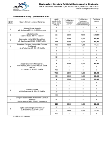 Streszczenie oceny i porównanie ofert numer oferty Nazwa (firma) i adres wykonawcy 1 Rokosz Michał Accordo ul. Bednorza 27/15, 43-200 Pszczyna 2 Jolanta Basista Siepraw 1205, 32-447 Siepraw 3 Czerwonka Michał ZRW Doradztwo ul. Narutowicza 67/16, 20-017 Lublin 4 Sebastian Cienkosz Małopolskie Centrum Profilaktyki ul. Wadowicka 12, 30-415 Kraków 5 6 7 8 Zespół Ekspertów Manager s.c. Piotr Pelczar, Ewa Górska-Pelczar, Jacek Pelczar ul. Szeroka 2, 31-053 Kraków Ewa Pohorecka ul. Hoffmanowej 1, 30-419 Kraków Grzegorz Zdebski E&G Krakowskie Centrum Rozwoju Sieciechowice 268b, 32-095 Iwanowice Inplus Consulting Iwona Przewor ul. Niecała 4/5a,20-080 Lublin x: oferta odrzucona; część zamówienia, której oferta dotyczy Punktacja w kryterium „cena” Punktacja w kryterium „doświadczenie kadry trenerskiej” Punktacja razem IV x x x XI x x x XI 60,00 40,00 100,00 VI 60,00 0,00 60,00 VII 60,00 0,00 60,00 VII 40,66 4,00 44,66 XI x x x I x x x II x x x III x x x IV x x x V 60,00 0,00 60,00 VI x x x VII x x x VIII 60,00 0,00 60,00 IX 60,00 0,00 60,00 X 60,00 0,00 60,00 XI x x x I x x x II x x x IV x x x VII x x x III x x x III 60,00 0,00 60,00 IV x x x VI 25,44 0,00 25,44 VII x x x