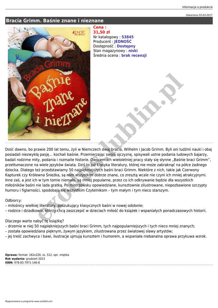 Informacje o produkcie Utworzono 03-03-2017 Bracia Grimm. Baśnie znane i nieznane Cena : 31,50 zł .lu bl in .p l Nr katalogowy : 53845 Producent : JEDNOŚĆ Dostępność : Dostępny Stan magazynowy : niski Średnia ocena : brak recenzji od us Dość dawno, bo prawie 200 lat temu, żyli w Niemczech dwaj bracia, Wilhelm i Jacob Grimm. Byli oni ludźmi nauki i obaj posiadali niezwykłą pasję… kochali baśnie. Przemierzając swoją ojczyznę, spisywali ustne podania ludowych bajarzy, badali rodzime mity, podania i rozmaite historie. Owocem ich wieloletniej pracy stały się słynne „Baśnie braci Grimm”, przetłumaczone na wiele języków świata. Dziś to już klasyka literatury, której nie może zabraknąć na półce żadnego dziecka. Dlatego też przedstawiamy 50 najpiękniejszych baśni braci Grimm. Niektóre z nich, takie jak Czerwony Kapturek czy Królewna Śnieżka, są nam wszystkim dobrze znane, co zresztą wcale nie czyni ich mniej atrakcyjnymi. Inne zaś, a jest ich w tym tomie niemało, są mniej popularne, przez co ich odkrywanie będzie dla wszystkich miłośników baśni nie lada gratką. Po mistrzowsku opowiedziane, kunsztownie zilustrowane, niepozbawione szczypty humoru i figlarności, spodobają się wszystkim Czytelnikom – tym małym i tym nieco starszym. ex Odbiorcy: – miłośnicy wielkiej literatury, poszukujący klasycznych baśni w nowej odsłonie; – rodzice i dziadkowie, którzy chcą zaszczepić w dzieciach miłość do książek i wspaniałych ponadczasowych historii. Dlaczego warto nabyć tę książkę? – drzemie w niej 50 najpiękniejszych baśni braci Grimm, tych najpopularniejszych i tych nieco mniej znanych; – została opowiedziana pięknym, żywym językiem, zilustrowana przez światowej sławy artystów; – jej treść zachwyca i bawi, ilustracje ujmują kunsztem i humorem, a wspaniała niebanalna oprawa przykuwa wzrok. Oprawa: format: 162x220, ss. 512, opr. miękka Rok wydania: grudzień 2015 ISBN: 978-83-7971-146-8 Wygenerowano w programie www.oscGold.com