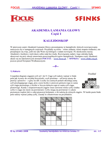 FOCUS AKADEMIA ŁAMANIA GŁOWY – Część I SFINKS AKADEMIA ŁAMANIA GŁOWY Część I KALEJDOSKOP W pierwszej części Akademii Łamania Głowy prezentujemy te łamigłówki, których rozwiązywania nauczycie się w następnych częściach. Przykłady są różne – różne zadania, różne stopnie trudności, nie przejmujcie się więc, jeśli nie uda Wam się któregoś z zadań rozwiązać. Po ukończeniu naszej Akademii z każdym z nich dacie sobie radę bez trudu. Rozwiązania zadań z tego odcinka będą ukazywać się przy okazji omawiania poszczególnych typów łamigłówek. Następna część Akademii ukaże się na internetowych stronach FOCUSA - www.focus.pl, i SFINKSA – www.sfinks.org.pl jeszcze przed Świętami Wielkanocnymi. --0-1) Kakuro Przykład Uzupełnij diagram ciągami cyfr od 1 do 9. Ciągi cyfr należy wpisać w białe pola jak wyrazy do zwykłej krzyżówki, czyli poziomo – od lewej strony do prawej i pionowo – z góry na dół. Liczby na czarnych polach określają sumę cyfr przylegającego ciągu, przy czym liczba w prawym górnym rogu to suma cyfr ciągu poziomego, a liczba w lewym dolnym rogu to suma cyfr ciągu pionowego. Każdy z nieprzerwanych ciągów musi zawierać różne cyfry (żadna cyfra w ciągu nie może się powtarzać). Cyfry mogą się powtarzać w całym poziomym rzędzie lub w całej pionowej kolumnie, o ile należą do różnych ciągów. W każde puste białe pole należy wpisać jedną cyfrę. Zasady te zilustrowano na przykładzie. © by SFINKS 2008 Szukamy kandydata na mistrza świata !!! str. 1/7 FOCUS AKADEMIA ŁAMANIA GŁOWY – Część I SFINKS 2) Hashi Hashi to japońska łamigłówka, która w opinii wielu osób jest jeszcze bardziej wciągająca niż sudoku. Pełna nazwa tej łamigłówki w języku japońskim brzmi Hashiwokakero, co oznacza budowanie mostów. Nazwa łamigłówki ma ścisły związek z jej ideą. W diagramie w postaci kółek z liczbami przedstawione są wyspy. Trzeba te wyspy połączyć mostami tak, aby z dowolnej wyspy można było przedostać się poprzez te mosty na każdą inną. Obowiązują przy tym następujące zasady: - liczby na wyspach określają ile dokładnie mostów ma być przyłączonych do danej wyspy, - mosty można prowadzić tylko w kierunkach poziomym i pionowym (równolegle do ramek rysunku), - każdy most musi łączyć dwie wyspy, - mosty nie mogą się przecinać ani nie mogą przechodzić przez wyspy, - dwie wyspy mogą być połączone między sobą najwyżej dwoma mostami. Zasady te zilustrowano na prostym przykładzie obok. © by SFINKS 2008 Szukamy kandydata na mistrza świata !!! Przykład str. 2/7 FOCUS AKADEMIA ŁAMANIA GŁOWY – Część I SFINKS 3) Hitori Przykład W każdej kratce diagramu jest jedna cyfra. Skreśl część cyfr w diagramie tak, aby w każdym rzędzie i w każdej kolumnie żadna z cyfr nie występowała więcej niż jeden raz. Pola ze skreślonymi cyframi nie mogą się stykać bokami. Pola z nieskreślonymi cyframi muszą tworzyć jedną spójną całość tak, aby każde pole z nieskreśloną cyfrą stykało się z tą całością przynajmniej jednym bokiem. Zasady te zilustrowano na przykładzie (białe cyfry na czarnym to te, które w przykładzie należało skreślić). 4) Sudoku Wypełnij diagram cyframi (do jednej pustej kratki wpisuj jedną cyfrę) od 1 do 9 tak, aby w każdej pionowej kolumnie i w każdym poziomym rzędzie oraz w każdym z dziewięciu kwadratów 3 x 3 kratki obwiedzionych grubszą linią znajdowało się 9 różnych cyfr. © by SFINKS 2008 Szukamy kandydata na mistrza świata !!! str. 3/7 FOCUS AKADEMIA ŁAMANIA GŁOWY – Część I SFINKS 5) Killer sudoku Wypełnij diagram cyframi od 1 do 9 wpisując do każdej kratki jedną cyfrę, w ten sposób, aby w każdym rzędzie, w każdej kolumnie oraz w każdym z obwiedzionych grubszą linią sektorów 3×3 znalazło się 9 różnych cyfr. Suma cyfr wewnątrz każdego z obszarów zaznaczonych linią przerywaną musi być równa liczbie wpisanej w rogu tego obszaru. Wewnątrz tych obszarów nie mogą powtarzać się takie same cyfry. 6) Pokropek Narysuj w diagramie jedną pętlę składającą się z prostych odcinków łączących sąsiednie kropki. Pętla musi być zamknięta, nie może się przecinać, a jej fragmenty nie mogą się ze sobą stykać. Od pętli nie mogą odchodzić żadne inne linie. Liczby w diagramie mówią przez ile boków kwadraciku (wyznaczonego przez cztery kropki wokół liczby) przechodzi pętla. © by SFINKS 2008 Szukamy kandydata na mistrza świata !!! str. 4/7 FOCUS AKADEMIA ŁAMANIA GŁOWY – Część I SFINKS 7) Bitwa morska Przykład Rozmieść w diagramie 10 okrętów dokładnie takich jak pod diagramem. Okręty nie mogą się ze sobą stykać, tzn. kratki należące do dwóch różnych okrętów nie mogą się dotykać nawet rogami. W jednej kratce może się znajdować tylko jeden element okrętu. Liczby u dołu i z prawej strony planu pokazują ile w danym rzędzie lub kolumnie ma być kratek, w których jest część okrętu. Powyższe zasady zilustrowano na przykładzie obok. © by SFINKS 2008 Szukamy kandydata na mistrza świata !!! str. 5/7 FOCUS AKADEMIA ŁAMANIA GŁOWY – Część I SFINKS 8) Obrazek logiczny Przykład Zaczernij niektóre z kratek tak, żeby utworzyły one pewien obrazek. Grupa kratek to kratki, które leżą w jednej linii (stykając się bokami) i są wszystkie zaczernione, a między nimi nie ma żadnych białych kratek. Grupy występująca w jednej linii oddzielone są od siebie przynajmniej jedną białą kratką. Liczby umieszczone z lewej strony podają po ile kratek w danym rzędzie liczą kolejne grupy kratek (od lewej strony do prawej). Liczby u góry diagramu podają po ile kratek w danej kolumnie liczą kolejne grupy kratek (od góry do dołu). Zasady te zilustrowano na przykładzie. Koniec pierwszej części Akademii Łamania Głowy. W następnej części – sposoby na rozwiązywanie kakuro. --0-- MISTR
