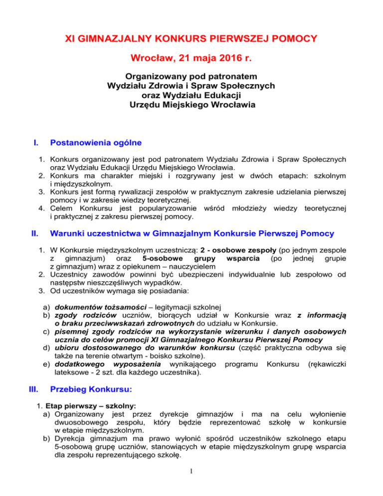 XI GIMNAZJALNY KONKURS PIERWSZEJ POMOCY Wrocław, 21 maja 2016 r. Organizowany pod patronatem Wydziału Zdrowia i Spraw Społecznych oraz Wydziału Edukacji Urzędu Miejskiego Wrocławia I. Postanowienia ogólne 1. Konkurs organizowany jest pod patronatem Wydziału Zdrowia i Spraw Społecznych oraz Wydziału Edukacji Urzędu Miejskiego Wrocławia. 2. Konkurs ma charakter miejski i rozgrywany jest w dwóch etapach: szkolnym i międzyszkolnym. 3. Konkurs jest formą rywalizacji zespołów w praktycznym zakresie udzielania pierwszej pomocy i w zakresie wiedzy teoretycznej. 4. Celem Konkursu jest popularyzowanie wśród młodzieży wiedzy teoretycznej i praktycznej z zakresu pierwszej pomocy. II. Warunki uczestnictwa w Gimnazjalnym Konkursie Pierwszej Pomocy 1. W Konkursie międzyszkolnym uczestniczą: 2 - osobowe zespoły (po jednym zespole z gimnazjum) oraz 5-osobowe grupy wsparcia (po jednej grupie z gimnazjum) wraz z opiekunem – nauczycielem 2. Uczestnicy zawodów powinni być ubezpieczeni indywidualnie lub zespołowo od następstw nieszczęśliwych wypadków. 3. Od uczestników wymaga się posiadania: a) dokumentów tożsamości – legitymacji szkolnej b) zgody rodziców uczniów, biorących udział w Konkursie wraz z informacją o braku przeciwwskazań zdrowotnych do udziału w Konkursie. c) pisemnej zgody rodziców na wykorzystanie wizerunku i danych osobowych ucznia do celów promocji XI Gimnazjalnego Konkursu Pierwszej Pomocy d) ubioru dostosowanego do warunków konkursu (część praktyczna odbywa się także na terenie otwartym - boisko szkolne). e) dodatkowego wyposażenia wynikającego programu Konkursu (rękawiczki lateksowe - 2 szt. dla każdego uczestnika). III. Przebieg Konkursu: 1. Etap pierwszy – szkolny: a) Organizowany jest przez dyrekcje gimnazjów i ma na celu wyłonienie dwuosobowego zespołu, który będzie reprezentować szkołę w konkursie w etapie międzyszkolnym. b) Dyrekcja gimnazjum ma prawo wyłonić spośród uczestników szkolnego etapu 5-osobową grupę uczniów, stanowiących w etapie międzyszkolnym grupę wsparcia dla zespołu reprezentującego szkołę. 1 Skład reprezentacji szkolnej należy przesłać w terminie do 08 maja 2016r. do Koordynatora XI Gimnazjalnego Konkursu Pierwszej Pomocy wyłącznie pocztą elektroniczną na adres: [email protected] Zgłoszenie szkoły powinno zawierać (wzór zał. 1): a) nazwę, adres, e-mail i numer telefonu placówki zgłaszającej zespół; b) imię i nazwisko opiekuna zespołu wraz telefonem kontaktowym i adresem skrzynki e-mail; c) imiona, nazwiska, daty urodzenia lub numer PESEL uczestników d) imiona, nazwiska, daty urodzenia lub numer PESEL członków Gimnazjalnej Grupy Wsparcia 2. Etap drugi - międzyszkolny miejski: a) XI Gimnazjalny Konkurs Pierwszej Pomocy odbędzie się 21 maja 2016r. (sobota) w Liceum Ogólnokształcącym Nr I przy ul. Poniatowskiego 9 we Wrocławiu b) W dniu XI GKPP opiekunowie podczas rejestracji przedkładają Komisji Rejestracyjnej oświadczenia i zgody (zał. 2. i 3.) oraz potwierdzają zgłoszenie zespołu lub informują o zaistniałej zmianie uczestników. c) Organizatorami XI Gimnazjalnego Konkursu Pierwszej Pomocy jest Stowarzyszenie Nauczycieli INWIT, Straż Miejska wraz z Grupą Wolontariuszy Pierwszej Pomocy – studentów i uczniów szkół ponadgimnazjalnych Koordynatorem XI GKPP p. Katarzyna Gietner – nauczycielka w Liceum Ogólnokształcącym Nr I we Wrocławiu Sekretarzem XI GKPP jest p. Karol Iwanowski – nauczyciel w Zespole Szkół Ekonomiczno – Administracyjnych we Wrocławiu. d) W Konkursie międzyszkolnym uczestniczą zwycięzcy etapów szkolnych e) Harmonogram konkursu zostanie przesłany do 15.05.2016r. drogą mailową do szkół, które prześlą zgłoszenie udziału w XI GKPP IV. Konkurencje 1. Stacje zadań praktycznych Zespół zajmuje stanowisko na stacji oczekiwania i czeka na zaproszenie na stację symulacji akcji udzielenia pierwszej pomocy. W tym czasie nie może podglądać tego, co robią inne zespoły. Każdy zespół wybiera swojego kapitana. Opiekun wraz z grupą wsparcia dla zespołu reprezentującego szkołę mają prawo oglądania działań zespołu, każda podpowiedź słowna, lub inna kończy się dyskwalifikacją drużyny. Na każdej stacji tylko kapitan ma prawo rozmawiać z sędziami. 2. Test oraz zadania opisowe 3. Zadania modułowe dla Grupy Wsparcia 4. Konkurs – niespodzianka V. Punktacja 1. Pierwsze miejsce zajmuje zespół, który uzyska największą liczbę punktów na stacjach symulacji wypadkowych i stacji sprawdzającej wiedzę teoretyczną. 2. Sposób punktacji w ramach symulacji wypadkowej przedstawiony jest przy jej omawianiu. 2 VI. Postanowienia końcowe: 1. Organizatorzy Konkursu nie ponoszą odpowiedzialności materialnej z tytułu wypadków, urazów i szkód w mieniu powstałych podczas trwania konkurencji zawodów. 2. Za dyscyplinę zespołu i grupy wsparcia oraz szkody wyrządzone przez członka zespołu odpowiada jego opiekun. 3. Uczestników i opiekunów obowiązują przepisy niniejszego regulaminu oraz postanowienia organizatora, a także sędziów poszczególnych konkurencji. 4. W przypadku naruszenia powyższych postanowień, sędzia główny ma prawo zdyskwalifikować zespół. 5. Ostateczna interpretacja postanowień niniejszego regulaminu należy do organizatora. 3 Załącznik 1 – FORMULARZ ZGŁOSZENIOWY XI GKPP 2016 Proszę wypełnić tabele WIELKĄ czcionką ARIAL (Zapis w programie Microsoft Word 97-2003) Nazwa szkoły: Adres szkoły: E –mail: Telefon: Nazwisko i imię opiekuna: E- mail: Lp. 1. Telefon kontaktowy: Gimnazjalny Zespół Pierwszej Pomocy Nazwisko i imię Data urodzenia Nr PESEL Gimnazjalna Grupa Wsparcia Nazwisko i imię Data urodzenia Nr PESEL 2. Lp. 1. 2. 3. 4. 5. 4 Załącznik 2 – Zgoda opiekunów prawnych ..................................................... (miejscowość, data) Oświadczenie i zgoda Ja niżej podpisany/a, ...................................................