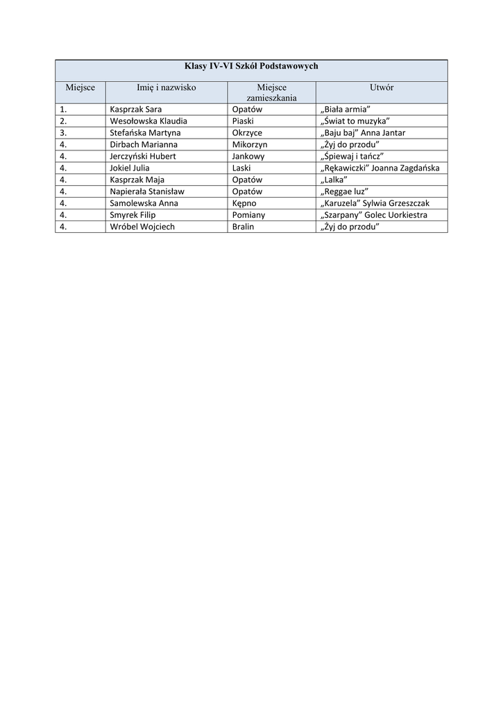 Klasy IV-VI Szkół Podstawowych Miejsce 1. 2. 3. 4. 4. 4. 4. 4. 4. 4. 4. Imię i nazwisko Kasprzak Sara Wesołowska Klaudia Stefańska Martyna Dirbach Marianna Jerczyński Hubert Jokiel Julia Kasprzak Maja Napierała Stanisław Samolewska Anna Smyrek Filip Wróbel Wojciech Miejsce zamieszkania Opatów Piaski Okrzyce Mikorzyn Jankowy Laski Opatów Opatów Kępno Pomiany Bralin Utwór „Biała armia” „Świat to muzyka” „Baju baj” Anna Jantar „Żyj do przodu” „Śpiewaj i tańcz” „Rękawiczki” Joanna Zagdańska „Lalka” „Reggae luz” „Karuzela” Sylwia Grzeszczak „Szarpany” Golec Uorkiestra „Żyj do przodu”