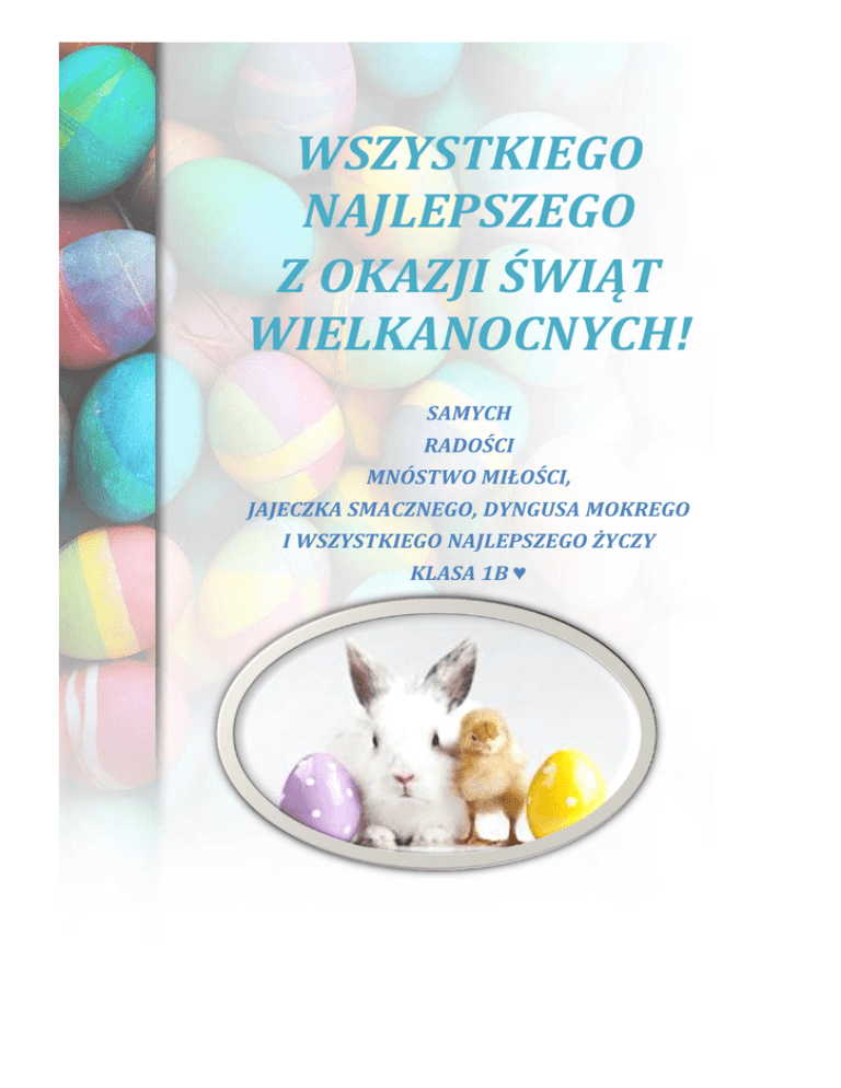 WSZYSTKIEGO NAJLEPSZEGO Z OKAZJI ŚWIĄT WIELKANOCNYCH! SAMYCH RADOŚCI MNÓSTWO MIŁOŚCI, JAJECZKA SMACZNEGO, DYNGUSA MOKREGO I WSZYSTKIEGO NAJLEPSZEGO ŻYCZY KLASA 1B ♥