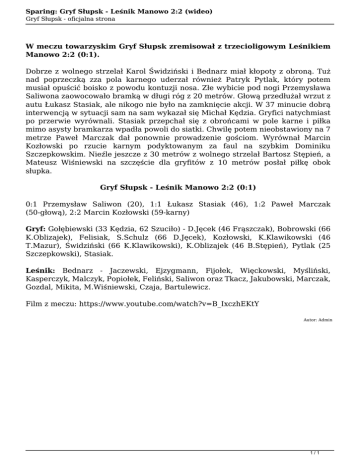 Sparing: Gryf Słupsk - Leśnik Manowo 2:2 (wideo) Gryf Słupsk - oficjalna strona W meczu towarzyskim Gryf Słupsk zremisował z trzecioligowym Leśnikiem Manowo 2:2 (0:1). Dobrze z wolnego strzelał Karol Świdziński i Bednarz miał kłopoty z obroną. Tuż nad poprzeczką zza pola karnego uderzał również Patryk Pytlak, który potem musiał opuścić boisko z powodu kontuzji nosa. Złe wybicie pod nogi Przemysława Saliwona zaowocowało bramką w długi róg z 20 metrów. Głową przedłużał wrzut z autu Łukasz Stasiak, ale nikogo nie było na zamknięcie akcji. W 37 minucie dobrą interwencją w sytuacji sam na sam wykazał się Michał Kędzia. Gryfici natychmiast po przerwie wyrównali. Stasiak przepchał się z obrońcami w pole karne i piłka mimo asysty bramkarza wpadła powoli do siatki. Chwilę potem nieobstawiony na 7 metrze Paweł Marczak dał ponownie prowadzenie gościom. Wyrównał Marcin Kozłowski po rzucie karnym podyktowanym za faul na szybkim Dominiku Szczepkowskim. Nieźle jeszcze z 30 metrów z wolnego strzelał Bartosz Stępień, a Mateusz Wiśniewski na szczęście dla gryfitów z 10 metrów posłał piłkę obok słupka. Gryf Słupsk - Leśnik Manowo 2:2 (0:1) 0:1 Przemysław Saliwon (20), 1:1 Łukasz Stasiak (46), 1:2 Paweł Marczak (50-głową), 2:2 Marcin Kozłowski (59-karny) Gryf: Gołębiewski (33 Kędzia, 62 Szuciło) - D.Jęcek (46 Frąszczak), Bobrowski (66 K.Oblizajek), Felisiak, S.Schulz (66 D.Jęcek), Kozłowski, K.Klawikowski (46 T.Mazur), Świdziński (66 K.Klawikowski), K.Oblizajek (46 B.Stępień), Pytlak (25 Szczepkowski), Stasiak. Leśnik: Bednarz - Jaczewski, Ejzygmann, Fijołek, Więckowski, Myśliński, Kasperczyk, Malczyk, Popiołek, Feliński, Saliwon oraz Tkacz, Jakubowski, Marczak, Gozdal, Mikita, M.Wiśniewski, Czaja, Bartulewicz. Film z meczu: https://www.youtube.com/watch?v=B_IxczhEKtY Autor: Admin 1/1