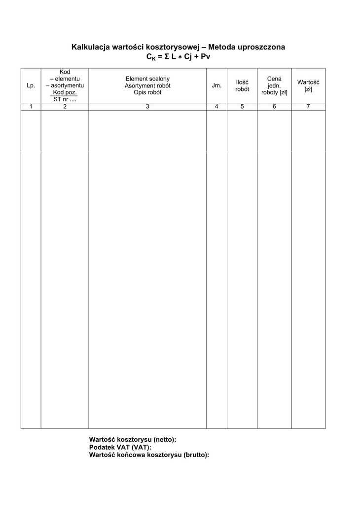 Kalkulacja wartości kosztorysowej – Metoda uproszczona CK = Σ L ∗ Cj + Pv Lp. 1 Kod – elementu – asortymentu Kod poz. ST nr .... 2 Element scalony Asortyment robót Opis robót Jm. Ilość robót Cena jedn. roboty [zł] Wartość [zł] 3 4 5 6 7 Wartość kosztorysu (netto): Podatek VAT (VAT): Wartość końcowa kosztorysu (brutto):