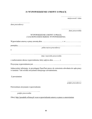 31 WYPOWIEDZENIE UMOWY O PRACĘ ………….......…………….. miejscowość i data ………………………….. dane pracodawcy …………………………… dane pracownika WYPOWIEDZENIE UMOWY O PRACĘ Z ZACHOWANIEM OKRESU WYPOWIEDZENIA Wypowiadam umowę o pracę zawartą dnia …...……............................. r. w .........……………..... pomiędzy.........................................................................................................………………........... pełna nazwa pracodawcy a …………………………………........................................................................................................ imię i nazwisko pracownika z zachowaniem okresu wypowiedzenia, który upływa dnia .............. r. Przyczyną wypowiedzenia jest ………………..……………............................................................ Jednocześnie informuję, że przysługuje Panu/Pani prawo do wniesienia odwołania do sądu pracy w terminie 7 dni od dnia otrzymania niniejszego zawiadomienia. Z poważaniem ............................... podpis pracodawcy Potwierdzam otrzymanie wypowiedzenia ………………………………………..... podpis pracownika Zdroj: http://poradnik.wfirma.pl/-wzor-wypowiedzenie-umowy-o-prace-z-omowieniem 80 PREKLADOVÝ SLOVNÍČEK dane údaje okres wypowiedzenia výpovedná lehota otrzymać dostať, prijať pracodawca zamestnávateľ sąd pracy pracovný súd umowa o pracę pracovná zmluva wnieść (złożyć) odwołanie podať odvolanie wypowiedzieć vypovedať, zrušiť wypowiedzenie «zawiadomienie o rozwiązaniu jakiejś umowy» výpoveď «zrušenie právneho alebo iného pomeru; písomnosť o tom» wypowiedzenie umowy o pracę z zachowaniem okresu wypowiedzenia výpoveď, vypovedanie (zrušenie) pracovnej zmluvy s dodržaním výpovednej lehoty zawarty uzavretý zawiadomienie oznámenie z poważaniem s úctou 81