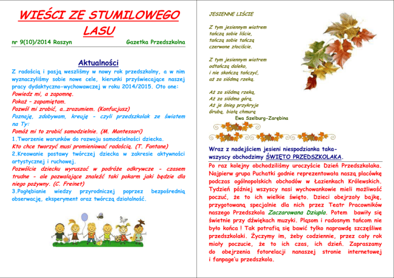 WIEŚCI ZE STUMILOWEGO LASU nr 9(10)/2014 Raszyn Gazetka Przedszkolna Aktualności Z radością i pasją weszliśmy w nowy rok przedszkolny, a w nim wyznaczyliśmy sobie nowe cele, kierunki przyświecające naszej pracy dydaktyczno-wychowawczej w roku 2014/2015. Oto one: Powiedz mi, a zapomnę. Pokaż – zapamiętam. Pozwól mi zrobić, a…zrozumiem. (Konfucjusz) Poznaję, zdobywam, kreuję - czyli przedszkolak ze światem na Ty: Pomóż mi to zrobić samodzielnie. (M. Montessori) JESIENNE LIŚCIE Z tym jesiennym wiatrem tańczą sobie liście, tańczą sobie tańczą czerwone złociście. Z tym jesiennym wiatrem odtańczą daleko, i nie skończą tańczyć, aż za siódmą rzeką. Aż za siódmą rzeką, Aż za siódma górą, Aż je śnieg przykryje Grubą, białą chmurą Ewa Szelburg-Zarębina 1.Tworzenie warunków do rozwoju samodzielności dziecka. Kto chce tworzyć musi promieniować radością. (T. Fontane) 2.Kreowanie postawy twórczej dziecka w zakresie aktywności artystycznej i ruchowej. Pozwólcie dziecku wyruszać w podróże odkrywcze - czasem trudne - ale pozwalające znaleźć taki pokarm jaki będzie dla niego pożywny. (C. Freinet) 3.Pogłębianie wiedzy przyrodniczej poprzez bezpośrednią obserwację, eksperyment oraz twórczą działalność. Wraz z nadejściem jesieni niespodzianka takawszyscy obchodzimy ŚWIĘTO PRZEDSZKOLAKA. Po raz kolejny obchodziliśmy uroczyście Dzień Przedszkolaka. Najpierw grupa Puchatki godnie reprezentowała naszą placówkę podczas ogólnopolskich obchodów w Łazienkach Królewskich. Tydzień później wszyscy nasi wychowankowie mieli możliwość poczuć, że to ich wielkie święto. Dzieci obejrzały bajkę, przygotowaną specjalnie dla nich przez Teatr Pracowników naszego Przedszkola Zaczarowana Dziupla. Potem bawiły się świetnie przy dźwiękach muzyki. Pląsom i radosnym tańcom nie było końca ! Tak potrafią się bawić tylko naprawdę szczęśliwe przedszkolaki. Życzymy im, żeby codziennie, przez cały rok miały poczucie, że to ich czas, ich dzień. Zapraszamy do obejrzenia fotorelacji nanaszej stronie internetowej i fanpage’u przedszkola. Podsłuchane jednym uchem: To był miesiąc… Po fantastycznych wakacjach Maleństwa, Skrzaty i Motylki rozpoczęły swoją przygodę z przedszkolem. Dla innych dzieci także zaczął się ważny czas, pełen niespodzianek i nowości nowych grup, nowych sal, nowych przyjaźni. Dołączyły do nas Pani Natalia Wierzbicka (pomoc w grupie Maleństwa), Pani Monika Tyburska (wychowawca w grupie Maleństwa) raz Pani Ola Kruk (wychowawca w grupie Mądre Sowy) Pierwszego września, przedszkolaki zostały powitane w progu przez Kubusia Puchatka. Na wszystkich dziecięcych buziach pojawiały się uśmiechy. Potem podczas koncertu muzycznego z Guciem i Dudusiem, przy dźwiękach gitary hawajskiej, dzieci radośnie pożegnały lato i weszły w rytm przedszkolnej, bajkowej rzeczywistości. Tu każdy dzień jest niezwykły, niezapomniany, a godziny mijają zbyt szybko. Przedszkolaki stają się coraz mądrzejsze, dzielniejsze, zdobywając wciąż nowe umiejętności, odkrywając nowe talenty, a wszystko to stanowi dla nich doskonałą zabawę. We wrześniu dzieci podziwiały wyczyny klauna Pana Kluseczki podczas przedstawienia: „Kolorowy Świat Cyrkowy”, radośnie obchodziły Dzień Przedszkolaka, który jest bardzo ważnym świętem w naszym kalendarzu. Dziecięcy śmiech rozbrzmiewał jednak znacznie częściej, niemal bez przerwy, w przedszkolnych murach i na placu zabaw. Bo też powodów codziennie było sporo. Ważne, że tutaj wszystkie dzieci czują się dobrze, bezpiecznie, no i zawsze tryskają radością oraz zdrową energią. Podczas zabawy Przemek wydaje komendę: -Raz, dwa, trzy i wyszybszamy ten pociąg! Poli znudziła się zabawa na zjeżdżalni, spytała więc: -Proszę pani, na których jeszcze urządach możemy się bawić? Przemek chciał rozkładać sztućce do obiadu, jednak tego dnia był dyżur Kasi: -Przemku, wkrótce będzie twoja kolej- pocieszała go pani -Wkrótce to będę tatą stwierdził filozoficznie chłopiec. W październiku: -po raz kolejny będziemy uroczyście obchodzić urodziny Kubusia Puchatka (14 października); -weźmiemy udział w jesiennych uroczystościach - Dniu Drzewa (16 października) i Dniu Jabłka (23 października); -posłuchamy koncertu muzycznego „Zabawy dawnej Warszawy” (6 października); -obejrzymy spektakl „Jesienny musical” (17 października); -pośpiewamy, potańczymy na przedszkolnym przeglądzie tańców i piosenek ludowych (29 października); -pobawimy się z rodzicami podczas zajęć otwartych; -czeka nas mnóstwo fantastycznych, niezapomnianych przygód. -zachęcamy do odwiedzania naszej galerii na facebooku. Zespół Przedszkola „W Stumilowym Lesie” w Raszynie