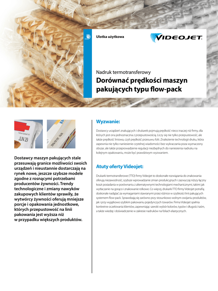 Ulotka użytkowa Nadruk termotransferowy Dorównać prędkości maszyn pakujących typu flow-pack Wyzwanie: Dostawcy urządzeń znakujących i drukarek pojmują prędkość nieco inaczej niż firmy, dla których jest ona jednoznaczna z przepustowością. Liczy się nie tylko przepustowość, ale także prędkość liniowa, czyli prędkość przesuwu folii. Znalezienie technologii druku, która zapewnia nie tylko naniesienie czytelnej wiadomości bez wykraczania poza wyznaczony obszar, ale także przeprowadzenie regulacji niezbędnych do naniesienia nadruku na kolejnym opakowaniu, może być prawdziwym wyzwaniem. Dostawcy maszyn pakujących stale przesuwają granice możliwości swoich urządzeń i nieustannie dostarczają na rynek nowe, jeszcze szybsze modele zgodne z rosnącymi potrzebami producentów żywności. Trendy technologiczne i zmiany nawyków zakupowych klientów sprawiły, że wytwórcy żywności oferują mniejsze porcje i opakowania jednostkowe, których przepustowość na linii pakowania jest wyższa niż w przypadku większych produktów. Atuty oferty Videojet: Drukarki termotransferowe (TTO) firmy Videojet to doskonałe rozwiązania do znakowania: oferują niezawodność, szybsze wprowadzanie zmian produkcyjnych i zazwyczaj niższy łączny koszt posiadania w porównaniu z alternatywnymi technologiami mechanicznymi, takimi jak wytłaczanie na gorąco i znakowanie rolkowe. Co więcej, drukarki TTO firmy Videojet potrafią doskonale nadążać za wymaganiami stawianymi przez różnice w szybkości linii pakujących systemem flow-pack. Sprawdzają się zarówno przy stosunkowo wolnym owijaniu produktów, jak i przy wyjątkowo szybkim pakowaniu pojedynczych towarów. Firma Videojet spełnia konkretne oczekiwania klientów, zapewniając szeroki wybór kolorów, typów i długości taśm, a także wiedzę i doświadczenie w zakresie nadruków na foliach elastycznych. Drukarki termotransferowe (TTO) Współdziałanie drukarek TTO z maszynami pakującymi typu flow-pack Drukarki termotransferowe nanoszą oznaczenia bezpośrednio na elastyczny materiał opakowania. Na liniach pakujących systemem flowpack drukowanie odbywa się, gdy folia jest w ruchu (patrz poniżej). Drukarka zamontowana jest w pobliżu miejsca pakowania i znajduje się na wsporniku przytwierdzonym bezpośrednio do maszyny pakującej typu flow-pack. Folia (nr 1) przesuwa się między głowicą drukującą (nr 2) a taśmą nasączoną tuszem (nr 3) i rolką drukarki (nr 4). Wszystkie te elementy są zamocowane na wsporniku i tworzą moduł drukarki TTO. Głowica drukująca jest ustawiona prostopadle do kierunku przesuwania się folii. Gdy maszyna pakująca prześle odpowiedni sygnał (na przykład żądanie naniesienia oznaczenia), następuje dociśnięcie głowicy drukującej, taśmy z tuszem i folii opakowania do rolki i rozpoczyna się drukowanie. Zależnie od zawartości kodu, który ma zostać nadrukowany, następuje podgrzanie wybranych elementów głowicy. Zetknięcie z nimi powoduje, że barwny tusz, którym nasączona jest taśma (nr 5), zostaje przeniesiony na materiał opakowania. Gdy tylko drukowanie zostaje ukończone, głowica wraca do położenia początkowego. Podawanie taśmy Podawanie materiału 2 Nadruk termotransferowy (TTO) jest technologią drukowania, która poza przyjaznością dla operatora i całego środowiska produkcyjnego gwarantuje także czystość i porządek. Nie używa się tu rozpuszczalników, a odpady taśm nie zawierają substancji niebezpiecznych, więc można je usuwać jak zwykłe śmieci. Proste programowanie i zmienne dane na opakowaniach Głowica drukująca o wysokiej rozdzielczości umożliwia drukowanie tekstu, grafiki, numerów partii, bieżących dat i kodów kreskowych. W celu zmaksymalizowania wykorzystywanej powierzchni taśmy kody drukowane przy użyciu technologii TTO powinny być na ogół ustawione w kierunku zamknięć opakowania (w poprzek). Za wyjątkiem nadrukowywania kodów o dużej wysokości oraz zastosowania drukarek, które posiadają funkcję oszczędzania taśmy radialnej, prostopadłe ustawienie głowicy drukującej w stosunku do toru ruchu opakowań powodowałoby, że przy innym kierunku drukowania część taśmy pozostałaby niewykorzystana. Dzięki funkcji oszczędzania taśmy radialnej firmy mają do dyspozycji całą szerokość taśmy, przy czym pozycja nanoszenia kodów na poszczególnych produktach zmienia się w zakresie wyznaczonym przez tę szerokość. Wielu producentów żywności musi ponadto zwracać uwagę na konieczność nadrukowywania informacji o składnikach. Obowiązujące w znacznej liczbie krajów przepisy wymagają wskazania na opakowaniu informacji o konkretnych składnikach, tak aby konsumenci będący alergikami mogli podejmować świadome decyzje dotyczące zakupu poszczególnych produktów. Drukarki termotransferowe Videojet pozwalają producentom spełnić na szczeblu globalnym obowiązujące w przemyśle spożywczym minimalne wymogi w zakresie etykietowania, a ponadto zmniejszyć liczbę jednostek magazynowych wstępnie zadrukowanej folii opakowaniowej. Drukarki TTO firmy Videojet mogą działać z prędkością liniową do 1000 mm na sekundę i umożliwiają znakowanie nawet 350 opakowań na minutę. Drukarki TTO zapewniają wysoką rozdzielczość, co jest jedną z ich największych zalet: najbardziej zaawansowane urządzenia tego typu są w stanie uzyskać gęstość 300 punktów na cal (DPI) lub 12 punktów na milimetr. 3 Kwestia integracji Drukarki TTO muszą być zintegrowane z urządzeniami pakującymi. Dlatego przy zakupie drukarek TTO powinno się starannie rozważyć kwestię zintegrowania ich z nowymi lub istniejącymi maszynami pakującymi typu flow-pack. Mimo takiej samej funkcjonalności maszyny pakujące typu flow-pack poszczególnych producentów różnią się budową, co może powodować konieczność stosowania specjalnych wsporników montażowych i innych akcesoriów. Dlatego tak ważne jest zna