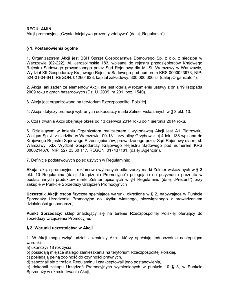 REGULAMIN Akcji promocyjnej „Czysta Inicjatywa prezenty zdobywa” (dalej „Regulamin”). § 1. Postanowienia ogólne 1. Organizatorem Akcji jest BSH Sprzęt Gospodarstwa Domowego Sp. z o.o. z siedzibą w Warszawie (02-222), Al. Jerozolimskie 183, wpisana do rejestru przedsiębiorców Krajowego Rejestru Sądowego prowadzonego przez Sąd Rejonowy dla M. St. Warszawy w Warszawie, Wydział XII Gospodarczy Krajowego Rejestru Sądowego pod numerem KRS 0000023973, NIP: 524-01-04-641, REGON: 012604823, kapitał zakładowy: 300 000 000 zł, (dalej „Organizator”). 2. Akcja, ani żaden ze elementów Akcji, nie jest loterią w rozumieniu ustawy z dnia 19 listopada 2009 roku o grach hazardowych (Dz. U. 2009, nr 201, poz. 1540). 3. Akcja jest organizowana na terytorium Rzeczpospolitej Polskiej. 4. Akcja dotyczy promocji wybranych odkurzaczy marki Zelmer wskazanych w § 3 pkt. 10. 5. Czas trwania Akcji obejmuje okres od 13 czerwca 2014 roku do 1 sierpnia 2014 roku. 6. Działającym w imieniu Organizatora realizatorem i wykonawcą Akcji jest A1 Piotrowski, Wielgus Sp. J. z siedzibą w Warszawie, 00-131 przy ulicy Grzybowskiej 4 lok. 138 wpisana do Krajowego Rejestru Sądowego Przedsiębiorców, prowadzonego przez Sąd Rejonowy dla m. st. Warszawy, XIX Wydział Gospodarczy Krajowego Rejestru Sądowego pod numerem KRS 0000214676, NIP: 527 23 60 117, REGON: 017437181, (dalej „Agencja”). 7. Definicje podstawowych pojęć użytych w Regulaminie: Akcja: akcja promocyjno - reklamowa wybranych odkurzaczy marki Zelmer wskazanych w § 3 pkt. 10 Regulaminu (dalej „Urządzenia Promocyjne”) polegająca na przyznaniu prezentu w postaci innych produktów marki Zelmer opisanych w §4 Regulaminu (dalej „Prezent”) przy zakupie w Punkcie Sprzedaży Urządzeń Promocyjnych Uczestnik Akcji: osoba fizyczna spełniająca warunki określone w § 2, nabywająca w Punkcie Sprzedaży Urządzenia Promocyjne do użytku własnego, niezwiązanego z prowadzeniem działalności gospodarczej. Punkt Sprzedaży: sklep znajdujący się na terenie Rzeczpospolitej Polskiej oferujący do sprzedaży Urządzenia Promocyjne. § 2. Warunki uczestnictwa w Akcji 1. W Akcji mogą wziąć udział Uczestnicy Akcji, którzy spełniają jednocześnie następujące warunki: a) ukończyli 18 rok życia, b) posiadają miejsce stałego zamieszkania na terytorium Rzeczpospolitej Polskiej, c) posiadają pełną zdolność do czynności prawnych, d) zapoznali się z treścią Regulaminu i zaakceptowali jego postanowienia, e) dokonali zakupu Urządzeń Promocyjnych wymienionych w punkcie 10 § 3, w Punkcie Sprzedaży w okresie trwania Akcji, f) wybrali prawidłową odpowiedź na zadane pytanie promocyjne wskazane w formularzu zgłoszeniowym akcji zgodnie z procedurą opisaną w § 3 Regulaminu, g) dokonali zgłoszenia zakupu zgodnie z procedurą opisaną w § 3 Regulaminu. 2. W Akcji nie mogą uczestniczyć właściciele, udziałowcy, współwłaściciele lub osoby zatrudnione w jakiejkolwiek formie prawnej w Punktach Sprzedaży prowadzących sprzedaż Urządzeń Promocyjnych i członkowie rodzin w/w osób. Przez członków rodziny, o których mowa powyżej, rozumie się: wstępnych, zstępnych, rodzeństwo, małżonków, małżonków rodzeństwa, rodziców małżonków, krewni w linii bocznej do II stopnia i osoby pozostające w stosunku przysposobienia. 3. Udział w Akcji i podanie danych osobowych na potrzeby przeprowadzenia Akcji jest całkowicie dobrowolne, ale niezbędne do wzięcia udziału w Akcji. 4. Akcja nie łączy się z innymi akcjami promocyjnymi organizowanymi przez Organizatora. § 3. Zasady Akcji 1. W Akcji może wziąć udział Uczestnik Akcji, który kupi w Punkcie Sprzedaży w terminie od 13.06.2014 r. do 1.08.2014 r. Urządzenia Promocyjne oraz spełni warunki uczestnictwa w Akcji określone w § 2 niniejszego Regulaminu. 2. Prezent, określony w § 4 Regulaminu, otrzyma Uczestnik Akcji, który kupi w terminie od 13.06.2014 r. do 1.08.2014 r. Urządzenia Promocyjne w Punkcie Sprzedaży i prześle listem poleconym na adres Agencji wskazany w § 1 pkt. 6 z dopiskiem „Czysta Inicjatywa” albo zarejestruje przez stronę www.czystainicjatywazelmer.pl następujące dokumenty (dalej „Zgłoszenie”): - wypełniony i podpisany własnoręcznie i czytelnie kupon z ulotki albo w przypadku rejestracji przez stronę www.czystainicjatywazelmer.pl wypełniony formularz zgłoszeniowy, a także wybierze prawidłową odpowiedź na zadane pytanie zawarte w treści w/w kuponu lub formularza zgłoszeniowego, - kopię faktury VAT lub kopię paragonu lub inny dowód potwierdzający zakup Urządzenia Promocyjnego, - kopię pierwszej strony karty gwarancyjnej wystawionej przez Organizatora Akcji do Urządzeń Promocyjnych lub kopię kodu kreskowego z opakowania. 3. Termin nadsyłania Zgłoszeń pocztowych upływa 7 dni od dnia zakończenia akcji tj. dnia 8.08.2014 roku (decyduje data stempla pocztowego), chyba, że pula prezentów wyczerpie się przed końcem Akcji, wówczas dzień wyczerpania puli prezentów jest dniem zakończenia Akcji. Organizator niezwłocznie poinformuje o wyczerpaniu się puli prezentów za pośrednictwem strony www.czystainicjatywazelmer.pl. 4. Prawidłowo wypełnione Zgłoszenie powinno zawierać dane osobowe Uczestnika Akcji w postaci imienia i nazwiska, daty urodzenia, adresu zamieszkania wraz z kodem pocztowym, numeru telefonu kontaktowego, adresu e-mail, własnoręcznego podpisu (tylko w przypadku zgłoszeń pocztowych), dane dotyczące modeli Urządzeń Promocyjnych, a także wskazaną prawidłową odpowiedź na zadane pytanie w formularzu zgłoszeniowym Akcji lub w treści kuponu. 5. Zgłoszenie Urządzeń Promocyjnych zakupionych przed 13 czerwca 2014 roku i po 1 sierpnia 2014 roku nie będą rozpatrywane. 6. Prezent będzie wysyłany każdorazowo do Uczestnika Akcji po otrzymaniu przez Agencję Zgłoszenia określonego w § 3 pkt. 2 nadesłanego przez Uczestnika oraz po potwierdzeniu przez Agencję jego z