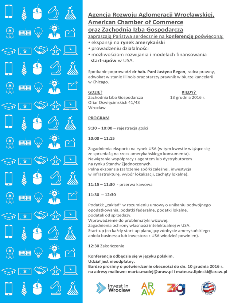 Agencja Rozwoju Aglomeracji Wrocławskiej, American Chamber of Commerce oraz Zachodnia Izba Gospodarcza zapraszają Państwa serdecznie na konferencję poświęconą: • ekspansji na rynek amerykański • prowadzeniu działalności • możliwościom rozwijania i modelach finansowania start-upów w USA. Spotkanie poprowadzi dr hab. Pani Justyna Regan, radca prawny, adwokat w stanie Illinois oraz starszy prawnik w biurze kancelarii w Chicago. GDZIE? Zachodnia Izba Gospodarcza Ofiar Oświęcimskich 41/43 Wrocław KIEDY? 13 grudnia 2016 r. PROGRAM 9:30 – 10:00 – rejestracja gości 10:00 – 11:15 Zagadnienia eksportu na rynek USA (w tym kwestie wiążące się ze sprzedażą na rzecz amerykańskiego konsumenta). Nawiązanie współpracy z agentem lub dystrybutorem na rynku Stanów Zjednoczonych. Pełna ekspansja (założenie spółki zależnej, inwestycja w infrastrukturę, wybór lokalizacji, zachęty lokalne). 11:15 – 11:30 - przerwa kawowa 11:30 – 12:30 Podatki: „zakład” w rozumieniu umowy o unikaniu podwójnego opodatkowania, podatki federalne, podatki lokalne, podatek od sprzedaży. Wprowadzenie do problematyki wizowej. Zagadnienia ochrony własności intelektualnej w USA. Start-up (co każdy start-up planujący zdobycie amerykańskiego anioła businessu lub inwestora z USA wiedzieć powinien). 12:30 Zakończenie Konferencja odbędzie się w języku polskim. Udział jest nieodpłatny. Bardzo prosimy o potwierdzenie obecności do dn. 10 grudnia 2016 r. na adresy mailowe: [email protected] i [email protected]