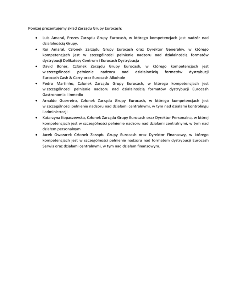 Poniżej prezentujemy skład Zarządu Grupy Eurocash: Luis Amaral, Prezes Zarządu Grupy Eurocash, w którego kompetencjach jest nadzór nad działalnością Grupy. Rui Amaral, Członek Zarządu Grupy Eurocash oraz Dyrektor Generalny, w którego kompetencjach jest w szczególności pełnienie nadzoru nad działalnością formatów dystrybucji Delikatesy Centrum i Eurocash Dystrybucja David Boner, Członek Zarządu Grupy Eurocash, w którego kompetencjach jest w szczególności pełnienie nadzoru nad działalnością formatów dystrybucji Eurocash Cash & Carry oraz Eurocash Alkohole Pedro Martinho, Członek Zarządu Grupy Eurocash, w którego kompetencjach jest w szczególności pełnienie nadzoru nad działalnością formatów dystrybucji Eurocash Gastronomia i Inmedio Arnaldo Guerreiro, Członek Zarządu Grupy Eurocash, w którego kompetencjach jest w szczególności pełnienie nadzoru nad działami centralnymi, w tym nad działami kontrolingu i administracji Katarzyna Kopaczewska, Członek Zarządu Grupy Eurocash oraz Dyrektor Personalna, w której kompetencjach jest w szczególności pełnienie nadzoru nad działami centralnymi, w tym nad działem personalnym Jacek Owczarek Członek Zarządu Grupy Eurocash oraz Dyrektor Finansowy, w którego kompetencjach jest w szczególności pełnienie nadzoru nad formatem dystrybucji Eurocash Serwis oraz działami centralnymi, w tym nad działem finansowym.