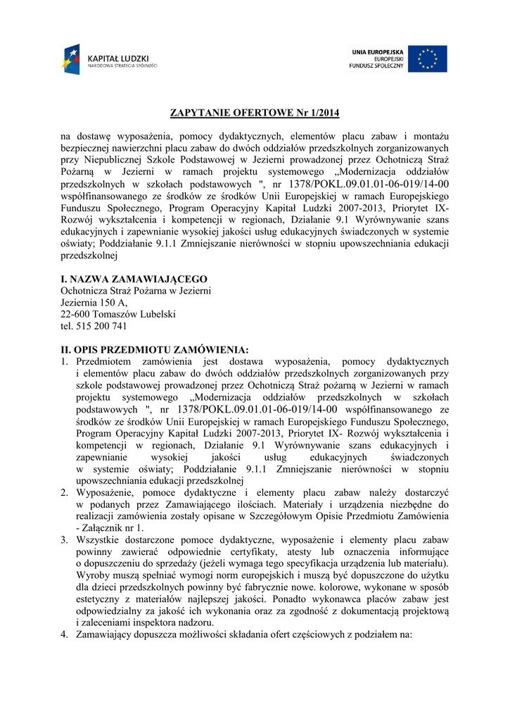 ZAPYTANIE OFERTOWE Nr 1/2014 na dostawę wyposażenia, pomocy dydaktycznych, elementów placu zabaw i montażu bezpiecznej nawierzchni placu zabaw do dwóch oddziałów przedszkolnych zorganizowanych przy Niepublicznej Szkole Podstawowej w Jezierni prowadzonej przez Ochotniczą Straż Pożarną w Jezierni w ramach projektu systemowego „Modernizacja oddziałów przedszkolnych w szkołach podstawowych ", nr 1378/POKL.09.01.01-06-019/14-00 współfinansowanego ze środków ze środków Unii Europejskiej w ramach Europejskiego Funduszu Społecznego, Program Operacyjny Kapitał Ludzki 2007-2013, Priorytet IXRozwój wykształcenia i kompetencji w regionach, Działanie 9.1 Wyrównywanie szans edukacyjnych i zapewnianie wysokiej jakości usług edukacyjnych świadczonych w systemie oświaty; Poddziałanie 9.1.1 Zmniejszanie nierówności w stopniu upowszechniania edukacji przedszkolnej I. NAZWA ZAMAWIAJĄCEGO Ochotnicza Straż Pożarna w Jezierni Jeziernia 150 A, 22-600 Tomaszów Lubelski tel. 515 200 741 II. OPIS PRZEDMIOTU ZAMÓWIENIA: 1. Przedmiotem zamówienia jest dostawa wyposażenia, pomocy dydaktycznych i elementów placu zabaw do dwóch oddziałów przedszkolnych zorganizowanych przy szkole podstawowej prowadzonej przez Ochotniczą Straż pożarną w Jezierni w ramach projektu systemowego „Modernizacja oddziałów przedszkolnych w szkołach podstawowych ", nr 1378/POKL.09.01.01-06-019/14-00 współfinansowanego ze środków ze środków Unii Europejskiej w ramach Europejskiego Funduszu Społecznego, Program Operacyjny Kapitał Ludzki 2007-2013, Priorytet IX- Rozwój wykształcenia i kompetencji w regionach, Działanie 9.1 Wyrównywanie szans edukacyjnych i zapewnianie wysokiej jakości usług edukacyjnych świadczonych w systemie oświaty; Poddziałanie 9.1.1 Zmniejszanie nierówności w stopniu upowszechniania edukacji przedszkolnej 2. Wyposażenie, pomoce dydaktyczne i elementy placu zabaw należy dostarczyć w podanych przez Zamawiającego ilościach. Materiały i urządzenia niezbędne do realizacji zamówienia zostały opisane w Szczegółowym Opisie Przedmiotu Zamówienia - Załącznik nr 1. 3. Wszystkie dostarczone pomoce dydaktyczne, wyposażenie i elementy placu zabaw powinny zawierać odpowiednie certyfikaty, atesty lub oznaczenia informujące o dopuszczeniu do sprzedaży (jeżeli wymaga tego specyfikacja urządzenia lub materiału). Wyroby muszą spełniać wymogi norm europejskich i muszą być dopuszczone do użytku dla dzieci przedszkolnych powinny być fabrycznie nowe. kolorowe, wykonane w sposób estetyczny z materiałów najlepszej jakości. Ponadto wykonawca placów zabaw jest odpowiedzialny za jakość ich wykonania oraz za zgodność z dokumentacją projektową i zaleceniami inspektora nadzoru. 4. Zamawiający dopuszcza możliwości składania ofert częściowych z podziałem na: CZEŚĆ I – dostawa i montaż elementów placu zabaw oraz bezpiecznej nawierzchni placu zabaw. CZEŚĆ II – dostosowanie toalety do potrzeb dzieci (podgrzewacz wody). CZĘŚĆ III – dostawa wyposażenia AGD (odkurzacz, pralka). CZĘŚĆ IV – dostawa wyposażenia do utrzymania czystości powierzchni płaskich (zestaw do sprzątania – wózek). CZĘŚĆ V – dostawa i montaż wyposażenia – mebli, wyposażenia wypoczynkowego i innych (gaśnica, apteczka, pólka na kubeczki wraz z haczykami na ręczniki). CZĘŚĆ VI – dostawa materiałów plastycznych CZĘŚĆ VII – dostawa zabawek i pomocy dydaktycznych. CZĘŚĆ VIII – dostawa i montaż sprzętu ITC i innych (tablica interaktywna, oprogramowanie do tablicy, radio odtwarzacz CD). CZĘŚĆ IX – dostawa i montaż zabudowy grzejników. 5. Wszelkie użyte w opisie przedmiotu zamówienia nazwy, typy i pochodzenie wyposażenia, pomocy dydaktycznych nie są dla wykonawców wiążące, mają jedynie charakter pomocniczy. W wypadku użytych w opisie nazw. Zamawiający dopuszcza stosowanie produktów „równoważnych", gdzie produkt równoważny oznacza taki produkt, który ma takie same cechy, funkcje oraz parametry i standardy jakościowe oraz atest. 6. Wyposażenie, pomoce dydaktyczne i elementy placu zabaw i inne określone w Załączniku nr 1 należy dostarczyć do miejsca realizacji projektu tj. - Niepubliczna Szkoła Podstawowa w Jezierni 7. Zamawiający – Ochotnicza Straż Pożarna w Jezierni - nie będzie pokrywał kosztów związanych z dostarczeniem wyposażenia, pomocy dydaktycznych i elementów placu zabaw do miejsca realizacji projektu (dostawy, przesyłki, transportu). 8. Wykonawca przedłoży Zamawiającemu fakturę VAT. Faktura winna wyszczególnić poszczególne produkty, wraz z cenami jednostkowymi, kwotą podatku VAT oraz kwotą brutto. 9. Zamówienie obejmuje dostawę, transport, załadunek i rozładunek pozycji wymienionych w załączniku nr 1. a w przypadku elementów placu zabaw i bezpiecznej nawierzchni placu również ich montaż. III. TERMIN WYKONANIA ZAMÓWIENIA Termin wykonania przedmiotu zamówienia: 30 dni od daty podpisania umowy. IV. OPIS SPOSOBU PRZYGOTOWYWANIA OFERT 1. Każdy wykonawca może złożyć tylko jedną ofertę. 2. Wykonawca składając ofertę pozostaje nią związany przez okres 30 dni. Bieg terminu związania ofertą rozpoczyna się wraz z upływem terminu składania ofert, licząc od dnia składania ofert włącznie. 2. Wykonawca samodzielnie lub na wniosek zamawiającego może przedłużyć termin związania ofertą, z tym, że zamawiający może tylko raz, co najmniej na 3 dni przed upływem terminu związania ofertą, zwrócić się do wykonawców o wyrażenie zgody na przedłużenie tego terminu o oznaczony okres, nie dłuższy jednak niż 60 dni. 3. Oferta musi być złożona w formie pisemnej bezpośrednio do Zamawiającego osobiście, przesłana za pomocą poczty lub kuriera. 4. Wszystkie strony oferty powinny być ponumerowane i podpisane przez osobę upoważnioną. 5. Ofertę należy umieścić w zamkniętej kopercie zaadresowanej i opisanym według poniższego wzoru: