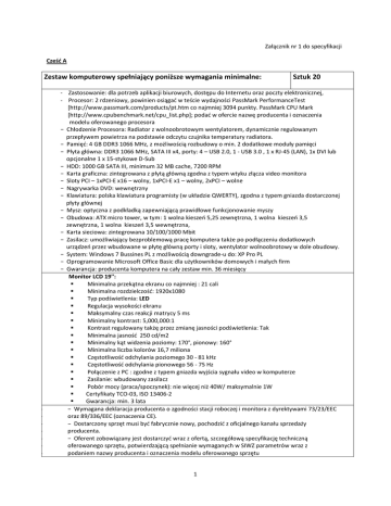 Załącznik nr 1 do specyfikacji Cześć A Zestaw komputerowy spełniający poniższe wymagania minimalne: - Sztuk 20 - Zastosowanie: dla potrzeb aplikacji biurowych, dostępu do Internetu oraz poczty elektronicznej, - Procesor: 2 rdzeniowy, powinien osiągać w teście wydajności PassMark PerformanceTest [http://www.passmark.com/products/pt.htm co najmniej 3094 punkty. PassMark CPU Mark [http://www.cpubenchmark.net/cpu_list.php]; podać w ofercie nazwę producenta i oznaczenia modelu oferowanego procesora − Chłodzenie Procesora: Radiator z wolnoobrotowym wentylatorem, dynamicznie regulowanym przepływem powietrza na podstawie odczytu czujnika temperatury radiatora. − Pamięć: 4 GB DDR3 1066 MHz, z możliwością rozbudowy o min. 2 dodatkowe moduły pamięci − Płyta główna: DDR3 1066 MHz, SATA III x4, porty: 4 – USB 2.0, 1 - USB 3.0 , 1 x RJ-45 (LAN), 1x DVI lub opcjonalne 1 x 15-stykowe D-Sub − HDD: 1000 GB SATA III, minimum 32 MB cache, 7200 RPM − Karta graficzna: zintegrowana z płytą główną zgodna z typem wtyku złącza video monitora − Sloty PCI – 1xPCI-E x16 – wolny, 1xPCI-E x1 – wolny, 2xPCI – wolne − Nagrywarka DVD: wewnętrzny − Klawiatura: polska klawiatura programisty (w układzie QWERTY), zgodna z typem gniazda dostarczonej płyty głównej − Mysz: optyczna z podkładką zapewniającą prawidłowe funkcjonowanie myszy − Obudowa: ATX micro tower, w tym: 1 wolna kieszeń 5,25 zewnętrzna, 1 wolna kieszeń 3,5 zewnętrzna, 1 wolna kieszeń 3,5 wewnętrzna, − Karta sieciowa: zintegrowana 10/100/1000 Mbit − Zasilacz: umożliwiający bezproblemową pracę komputera także po podłączeniu dodatkowych urządzeń przez wbudowane w płytę główną porty i sloty, wentylator wolnoobrotowy w dole obudowy. − System: Windows 7 Bussines PL z możliwością downgrade-u do: XP Pro PL − Oprogramowanie Microsoft Office Basic dla użytkowników domowych i małych firm − Gwarancja: producenta komputera na cały zestaw min. 36 miesięcy Monitor LCD 19'': Minimalna przekątna ekranu co najmniej : 21 cali Minimalna rozdzielczość: 1920x1080 Typ podświetlenia: LED Regulacja wysokości ekranu Maksymalny czas reakcji matrycy 5 ms Minimalny kontrast: 5,000,000:1 Kontrast regulowany takżę przez zmianę jasności podświetlenia: Tak Minimalna jasność 250 cd/m2 Minimalny kąt widzenia poziomy: 170°, pionowy: 160° Minimalna liczba kolorów 16,7 miliona Częstotliwość odchylania poziomego 30 - 81 kHz Częstotliwość odchylania pionowego 56 - 75 Hz Połączenie z PC : zgodne z typem gniazda wyjścia sygnału video w komputerze Zasilanie: wbudowany zasilacz Pobór mocy (praca/spoczynek): nie więcej niż 40W/ maksymalnie 1W Certyfikaty TCO-03, ISO 13406-2 Gwarancja: min. 3 lata − Wymagana deklaracja producenta o zgodności stacji roboczej i monitora z dyrektywami 73/23/EEC oraz 89/336/EEC (oznaczenia CE). − Dostarczony sprzęt musi być fabrycznie nowy, pochodzić z oficjalnego kanału sprzedaży producenta. − Oferent zobowiązany jest dostarczyć wraz z ofertą, szczegółową specyfikację techniczną oferowanego sprzętu, potwierdzającą spełnianie wymaganych w SIWZ parametrów wraz z podaniem nazwy producenta i oznaczenia modelu oferowanego sprzętu 1 Usługa: 1. Sprzęt należy dostarczyć, skonfigurować i zainstalować w sieciach komputerowych w jednostkach organizacyjnych Ośrodka. 2. Dysk powinien być podzielony na trzy partycje. 3. Trzecia partycja nie powinna być sformatowana. 4. Dwie partycje należy sformatować jako NTFS. 5. Na komputerach należy zainstalować System Windows XP (konfigurację przekaże pracownik Działu Analiz i Informatyki). 6. Na komputerach należy zainstalować program MSOffice dostarczony w ramach przetargu oraz wykonać jego aktywację - jeżeli wersja licencji ją przewiduje. 7. Na komputerach należy zainstalować wszystkie najnowsze poprawki programów: Windows Internet Explorer, Office. 8. Na komputerach należy zainstalować najnowsze wersje sterowników 9. System nie może być zainstalowany poprzez przekopiowanie obrazu dysku. Program należy zaktywować. 10. Komputery nie mogą być zabezpieczone plombami – musi istnieć możliwość rozbudowy sprzętu we własnym zakresie. 11. Należy dostarczyć dokumentację opisującą konfigurację zainstalowanego sprzętu i oprogramowania. Zakup monochromatycznych drukarek laserowych Wymagania minimalne - Sztuk 4 Technologia Druku Druk Laserowy Maksymalna prędkość druku 33 strony/min Czas do wydrukowania pierwszej strony 8s Technologia procesora ARM Pamięć 128 MB Możliwość rozbudowy pamięci Tak Max wielkość pamięci 384 MB Max rozdzielczość druku 1200 x 1200 dpi Języki drukowania PCL5e, PCL6, emulacja postscript poziom 3 z automatycznym przełączaniem języków Czcionki 45 skalowanych czcionek TrueType 35 czcionek PostScript Normatywny cykl pracy 50000 stron miesięcznie Zalecana ilość stron drukowanych miesięcznie 750 - 3000 2 Marginesy boczne wydruku Nie więcej niż - górny: 4 mm, lewy: 4 mm, prawy: 4 mm, dolny: 4 mm Ilość podajników 2 Wielkość podajnika numer 1 arkusze 50 Wielkość podajnika numer 2 arkusze 250 Format obsługiwanych nośników [ podajnik1 ] A4, A5, A6, B5, koperty (C5,DL), od 76 x 127 do 216 x 356mm Gramatura nośnika dla podajnika 1 od 60 do 163 g/m² (prosta ścieżka prowadzenia papieru dla nośników specjalnych) Format obsługiwanych nośników [ podajnik2 ] A4, A5, A6, B5, od 105 x 148 do 216 x 356 mm Gramatura nośnika dla podajnika 2 od 60 do 120 g/m² (ze standardowym pojemnikiem wyjściowym) Pojemność odbiornika nośników Co najmniej 150 arkuszy. Koperty: co najmniej 5 kopert. Folie przezroczyste: co najmniej 75 ark.; Odbiornik papieru na co najmniej 150 arkuszy Drukowanie obustronne Automatycznie Nośniki Papier (typu bond, o niskiej lub wysokiej gramaturze, zwykły, ekologiczny, szorstki), koperty, etykiety, kartony, folia do przeźroczy,nośniki o wysokiej gramaturze Interfejsy Hi-Speed USB 