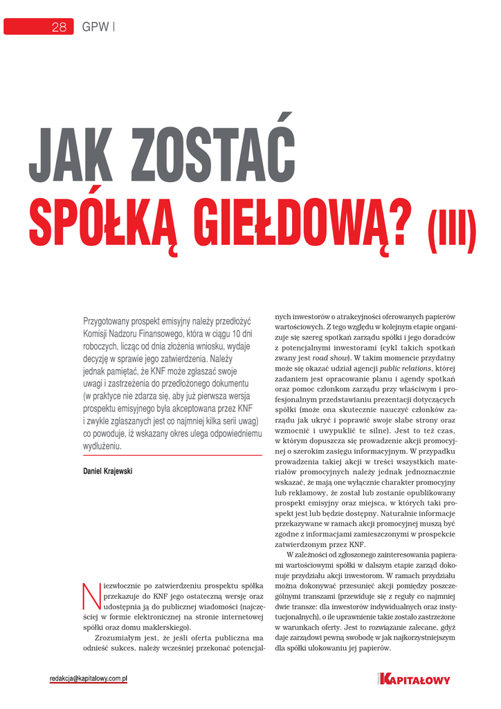 28 GPW | JAK ZOSTAĆ SPÓŁKĄ GIEŁDOWĄ? (III) Przygotowany prospekt emisyjny należy przedłożyć Komisji Nadzoru Finansowego, która w ciągu 10 dni roboczych, licząc od dnia złożenia wniosku, wydaje decyzję w sprawie jego zatwierdzenia. Należy jednak pamiętać, że KNF może zgłaszać swoje uwagi i zastrzeżenia do przedłożonego dokumentu (w praktyce nie zdarza się, aby już pierwsza wersja prospektu emisyjnego była akceptowana przez KNF i zwykle zgłaszanych jest co najmniej kilka serii uwag) co powoduje, iż wskazany okres ulega odpowiedniemu wydłużeniu. Daniel Krajewski iezwłocznie po zatwierdzeniu prospektu spółka przekazuje do KNF jego ostateczną wersję oraz udostępnia ją do publicznej wiadomości (najczęściej w formie elektronicznej na stronie internetowej spółki oraz domu maklerskiego). Zrozumiałym jest, że jeśli oferta publiczna ma odnieść sukces, należy wcześniej przekonać potencjal- N nych inwestorów o atrakcyjności oferowanych papierów wartościowych. Z tego względu w kolejnym etapie organizuje się szereg spotkań zarządu spółki i jego doradców z potencjalnymi inwestorami (cykl takich spotkań zwany jest road show). W takim momencie przydatny może się okazać udział agencji public relations, której zadaniem jest opracowanie planu i agendy spotkań oraz pomoc członkom zarządu przy właściwym i profesjonalnym przedstawianiu prezentacji dotyczących spółki (może ona skutecznie nauczyć członków zarządu jak ukryć i poprawić swoje słabe strony oraz wzmocnić i uwypuklić te silne). Jest to też czas, w którym dopuszcza się prowadzenie akcji promocyjnej o szerokim zasięgu informacyjnym. W przypadku prowadzenia takiej akcji w treści wszystkich materiałów promocyjnych należy jednak jednoznacznie wskazać, że mają one wyłącznie charakter promocyjny lub reklamowy, że został lub zostanie opublikowany prospekt emisyjny oraz miejsca, w których taki prospekt jest lub będzie dostępny. Naturalnie informacje przekazywane w ramach akcji promocyjnej muszą być zgodne z informacjami zamieszczonymi w prospekcie zatwierdzonym przez KNF. W zależności od zgłoszonego zainteresowania papierami wartościowymi spółki w dalszym etapie zarząd dokonuje przydziału akcji inwestorom. W ramach przydziału można dokonywać przesunięć akcji pomiędzy poszczególnymi transzami (przewiduje się z reguły co najmniej dwie transze: dla inwestorów indywidualnych oraz instytucjonalnych), o ile uprawnienie takie zostało zastrzeżone w warunkach oferty. Jest to rozwiązanie zalecane, gdyż daje zarządowi pewną swobodę w jak najkorzystniejszym dla spółki ulokowaniu jej papierów. | GPW Po dokonaniu najbardziej czasochłonnych etapów (a zwłaszcza związanego ze sporządzeniem i uzyskaniem zatwierdzenia prospektu przez KNF), kolejny krok w drodze na GPW sprowadza się do zawarcia umowy z Krajowym Depozytem Papierów Wartościowych. Przedmiotem takiej umowy jest rejestracja papierów wartościowych spółki w depozycie papierów wartościowych, czyli tzw. ich dematerializacja (tj. zamiana papierów wartościowych z postaci materialnej na zapis elektroniczny). Zawarcie umowy z KDPW następuje co do zasady pod warunkiem dopuszczenia papierów wartościowych spółki do obrotu na rynku regulowanym oraz po dostarczeniu przez emitenta dokumentów potwierdzających spełnienie tego warunku. Przed zawarciem takiej umowy spółka zobowiązana jest do złożenia dokumentów z akcji do depozytu prowadzonego przez firmę inwestycyjną (dom maklerski) lub KDPW. Prawa ze zdematerializowanych papierów wartościowych powstają z chwilą zapisania ich po raz pierwszy na rachunku papierów wartościowych i przysługują osobie będącej posiadaczem tego rachunku. Jak zostało to wskazane w części I niniejszego opracowania (zob. miesięcznik KAPITAŁOWY, grudzień 2012), zawarcie umowy o rejestrację akcji w depozycie papierów wartościowych wymaga upoważnienia zawartego w uchwale walnego zgromadzenia spółki. Po zakończeniu oferty publicznej oraz zawarciu z KDPW warunkowej umowy o rejestrację akcji spółki w depozycie, spółka składa do GPW wniosek o dopuszczenie jej akcji do obrotu na rynku regulowanym. Uchwałę w sprawie dopuszczenia do obrotu giełdowego akcji spółki, zarząd GPW powinien podjąć w terminie 14 dni od dnia złożenia stosownego wniosku. Zgodnie z Regulaminem GPW rozpoznając wniosek o dopuszczenie instrumentów finansowych do obrotu giełdowego, zarząd GPW bierze pod uwagę: 1) sytuację finansową emitenta i jej prognozę, a zwłaszcza rentowność, płynność i zdolność do obsługi zadłużenia, jak również inne czynniki mające wpływ na wyniki finansowe emitenta; 2) perspektywy rozwoju emitenta, a zwłaszcza ocenę możliwości realizacji zamierzeń inwestycyjnych z uwzględnieniem źródeł ich finansowania; 3) doświadczenie oraz kwalifikacje członków organów zarządzających i nadzorczych emitenta; 4) warunki, na jakich emitowane były instrumenty finansowe i ich zgodność z zasadami publicznego charakteru obrotu giełdowego; 5) bezpieczeństwo obrotu giełdowego i interes jego uczestników. Podjęcie uchwały o dopuszczeniu papierów wartościowych emitenta do obrotu giełdowego materializuje warunek niezbędny do rejestracji akcji spółki w depozycie (skutkiem którego następuje zniesienie formy dokumentu z akcji). Z chwilą dematerializacji spółka uzyskuje status spółki publicznej (stosownie do art. 4 pkt. 20 ustawy o ofercie publicznej spółką publicz- ną jest spółka, w której co najmniej jedna akcja jest zdematerializowana w rozumieniu przepisów ustawy o obrocie) i tym samym zaczyna co do zasady podlegać obowiązkom informacyjnym określonym głównie w ustawie o ofercie publicznej oraz w rozporządzeniu Ministra Finansów z dnia 19 lutego 2009 r. w sprawie informacji bieżących i okresowych przekazywanych przez emitentów papierów wartościowych oraz warunków uznawania za