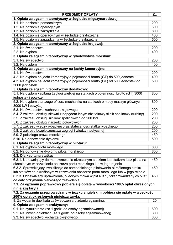 PRZEDMIOT OPŁATY ZŁ 1. Opłata za egzamin teoretyczny w żegludze międzynarodowej 1.1. Na poziomie pomocniczym 200 1.2. Na poziomie operacyjnym 600 1.3. Na poziomie zarządzania 800 1.4. Na poziomie operacyjnym w żegludze przybrzeżnej 400 1.5. Na poziomie zarządzania w żegludze przybrzeżnej 500 2. Opłata za egzamin teoretyczny w żegludze krajowej: 2.1. Na świadectwo 200 2.2. Na dyplom 400 3. Opłata za egzamin teoretyczny w rybołówstwie morskim: 3.1. Na świadectwo 200 3.2. Na dyplom 400 4. Opłata za egzamin teoretyczny na jachty komercyjne: 4.1. Na świadectwo 200 4.2. Na dyplom na jacht komercyjny o pojemności brutto (GT) do 500 jednostek 400 4.3. Na dyplom na jacht komercyjny o pojemności brutto (GT) od 500 jednostek do 500 3000 jednostek 5. Opłata za egzamin teoretyczny dodatkowy: 5.1. Na dyplom kapitana żeglugi wielkiej na statkach o pojemności brutto (GT) 3000 800 jednostek i powyżej 5.2. Na dyplom starszego oficera mechanika na statkach o mocy maszyn głównych 800 3000 kW i powyżej 5.3. Na świadectwo kucharza okrętowego 200 5.4. Z zakresu obsługi siłowni z napędem innym niż tłokowy silnik spalinowy (turbiny) 200 5.5. Z zakresu obsługi silników spalinowych do 200 kW 200 5.6. Z zakresu obsługi narzędzi połowowych 200 5.7. Z zakresu wiedzy rybackiej oraz stateczności statku rybackiego 200 5.8. Z zakresu bezpieczeństwa żeglugi i wiedzy nautycznej 200 5.9. Z polskiego prawa morskiego 450 5.10. Na odnowienie dyplomu 500 6. Opłata za egzamin teoretyczny w pilotażu: 6.1. Na dyplom pilota morskiego 800 6.2. Na odnowienie dyplomu pilota morskiego 800 6.3. Dla kapitana statku: 6.3.1. Uprawniający do manewrowania określonym statkiem lub statkami bez pilota na 450 określonym w zezwoleniu obszarze portu morskiego lub w jego rejonie 6.3.2. Sprawdzający kwalifikacje do samodzielnego pilotowania określonego statku 450 lub statków na określonym w zezwoleniu obszarze portu morskiego lub w jego rejonie 6.3.3. Odnawiający uprawnienia, o których mowa w pkt 6.3.1, przeprowadzany co 5 lat 450 od daty otrzymania pierwszego zezwolenia 7.1. Za egzamin poprawkowy pobiera się opłatę w wysokości 100% opłat określonych niniejszą taryfą. 7.2. Za egzamin przeprowadzany w języku angielskim pobiera się opłatę w wysokości 200% opłat określonych niniejszą taryfą. 8. Za wydanie duplikatu zaświadczenia o zdaniu egzaminu. 20 9. Opłata za egzamin praktyczny: 9.1. Na symulatorze (za 1 godz. od osoby egzaminowanej). 600 9.2. Na innych obiektach (za 1 godz. od osoby egzaminowanej). 300 9.3. Na świadectwo kucharza okrętowego. 300