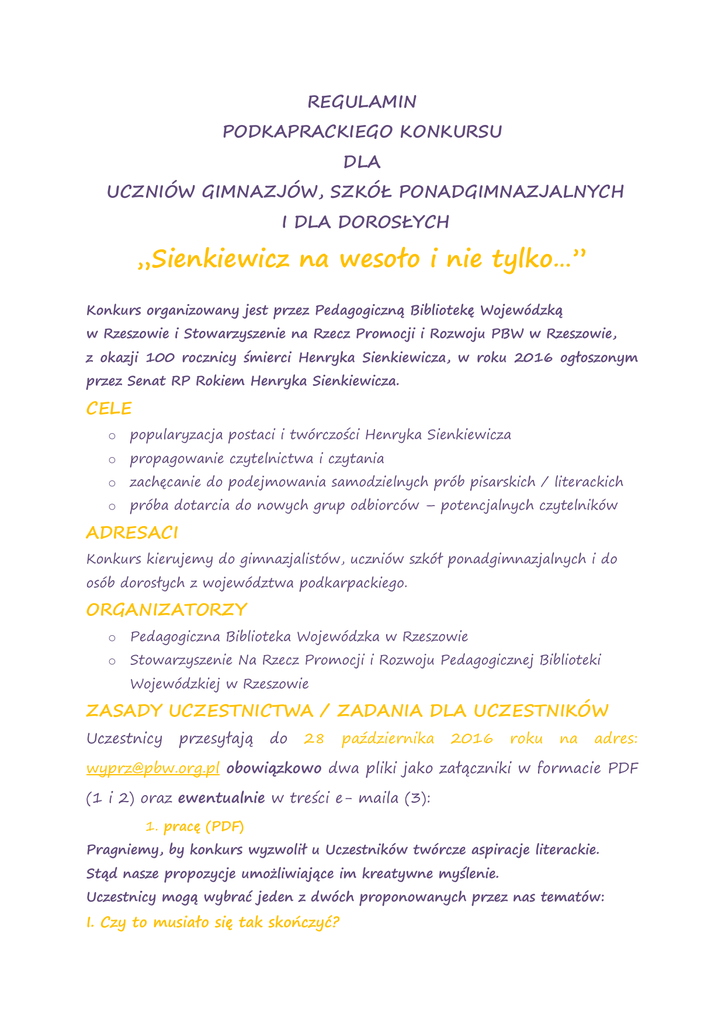 REGULAMIN PODKAPRACKIEGO KONKURSU DLA UCZNIÓW GIMNAZJÓW, SZKÓŁ PONADGIMNAZJALNYCH I DLA DOROSŁYCH „Sienkiewicz na wesoło i nie tylko…” Konkurs organizowany jest przez Pedagogiczną Bibliotekę Wojewódzką w Rzeszowie i Stowarzyszenie na Rzecz Promocji i Rozwoju PBW w Rzeszowie, z okazji 100 rocznicy śmierci Henryka Sienkiewicza, w roku 2016 ogłoszonym przez Senat RP Rokiem Henryka Sienkiewicza. CELE o popularyzacja postaci i twórczości Henryka Sienkiewicza o propagowanie czytelnictwa i czytania o zachęcanie do podejmowania samodzielnych prób pisarskich / literackich o próba dotarcia do nowych grup odbiorców – potencjalnych czytelników ADRESACI Konkurs kierujemy do gimnazjalistów, uczniów szkół ponadgimnazjalnych i do osób dorosłych z województwa podkarpackiego. ORGANIZATORZY o Pedagogiczna Biblioteka Wojewódzka w Rzeszowie o Stowarzyszenie Na Rzecz Promocji i Rozwoju Pedagogicznej Biblioteki Wojewódzkiej w Rzeszowie ZASADY UCZESTNICTWA / ZADANIA DLA UCZESTNIKÓW Uczestnicy przesyłają do 28 października 2016 roku na adres: [email protected] obowiązkowo dwa pliki jako załączniki w formacie PDF (1 i 2) oraz ewentualnie w treści e- maila (3): 1. pracę (PDF) Pragniemy, by konkurs wyzwolił u Uczestników twórcze aspiracje literackie. Stąd nasze propozycje umożliwiające im kreatywne myślenie. Uczestnicy mogą wybrać jeden z dwóch proponowanych przez nas tematów: I. Czy to musiało się tak skończyć? [Zadanie: po pierwsze krótko streść oryginalne, sienkiewiczowskie zakończenie jednej z trzech wybranych przez Ciebie powieści Henryka Sienkiewicza wchodzących w skład słynnej Trylogii („Ogniem i mieczem”, „Potop”, „Pan Wołodyjowski”) oraz napisz swoje jej zakończenie. Staraj się przy tym zachować styl i język Sienkiewicza charakterystyczny dla Trylogii.] II. Trójkąt miłosny to takie … pospolite, ale … [Zadanie: napisz dowcipne dialogi pomiędzy wybranymi postaciami Trylogii w postaci wymiany e- maili, esemesów. Staraj się naśladować styli i język Sienkiewicza charakterystyczny dla Trylogii. Do wyboru masz jedną z trzech par bohaterów spośród trzech znanych z Trylogii miłosnych trójkątów, tj.: Skrzetuski, Helena i Bohun (z „Ogniem i mieczem”) Kmicic, Oleńka i Bogusław Radziwiłł (z „Potopu”) Wołodyjowski, Basia i Azja Tuhajbejowicz (z „Pana Wołodyjowskiego”)] 2. metryczkę (PDF) zawierającą: Nick / pseudonim, imię i nazwisko, adres zamieszkania, e- mail (ew. dodatkowo telefon kontaktowy), w przypadku uczniów dodatkowo: nazwa szkoły, klasa, imię i nazwisko opiekuna pracy. 3. w treści e- maila dodatkowe, nieobowiązkowe informacje, np.: w jaki sposób dowidzieli o konkursie, dlaczego zdecydowali się wziąć w nim udział, czy wcześniej czytali Sienkiewicza? coś o sobie i ewentualne zastrzeżenie odnośnie dwóch ostatnich punktów Oświadczenia, tj. nie zamieszczania na stronie internetowej biblioteki w relacji z konkursu: wizerunku czy imienia i nazwiska. Uwaga: Osoby, które nie posługują się edytorem tekstu, nie posiadają adresu e- mail mogą dostarczyć pracę napisaną odręcznie lub na maszynie do pisania na adres Wypożyczalni Pedagogicznej Biblioteki Wojewódzkiej w Rzeszowie, ul Gałęzowskiego 4. KRYTERIA OCENY PRAC KONKURSOWYCH o zgodność z wymogami dla danego zadania o oryginalność ujęcia tematu, ciekawa forma o poprawność językowa (poprawność pod względem stylistycznym, gramatycznym, ortograficznym) o jasność przekazu, trafność sformułowań, prostota o różnorodność słownika i składni o w zadaniu drugim obecność elementów humorystycznych HARMONOGRAM KONKURSU o I ETAP: CZERWIEC- WRZESIEŃ 2016 r. [Zapowiedź konkursu: czas na przeczytanie utworu Henryka Sienkiewicza, wybór tematu i przemyślenie formy pracy] o II ETAP: WRZESIEŃ - PAŹDZIERNIK 2016 [Ogłoszenie konkursu, czas na nadsyłanie prac i ocenę jury) o III ETAP: LISTOPAD 2016 - PODANIE WYNIKÓW o [Wyniki zostaną ogłoszone na stronie internetowej i FB Pedagogicznej Biblioteki Wojewódzkiej w Rzeszowie] o IV ETAP: GRUDZIEŃ 2016- UROCZYSTE ROZDANIENAGRÓD [O konkretnym terminie, tj.: dacie i godzinie powiadomimy w ogłoszeniu na stronie internetowej biblioteki]. AUTORSTWO PRAC KONKURSOWYCH Nadesłanie prac jest równoznaczne z oświadczeniem autora, że: posiada pełnię praw autorskich i przenosi je na Organizatora w zakresie niezbędnym do publikacji i /lub innego rozpowszechniania. Oznacza to konkretnie, że podpisuje się pod Oświadczeniem następującej treści: „Oświadczam, że: o przesłana przeze mnie na ten konkurs praca jest moją intelektualną własnością, o napisałam /-łem ją samodzielnie, nie skopiowałam /-łem jej o zgadzam się na zamieszczenie tej pracy na stronie internetowej Pedagogicznej Biblioteki Wojewódzkiej w Rzeszowie w formacie PDF, podpisanej wybranym przeze mnie Nickiem /godłem o zgadzam się na zamieszczenie mojego zdjęcia z relacji z wręczenia nagród na stronie i FB Pedagogicznej Biblioteki Wojewódzkiej w Rzeszowie o zgadzam się na podanie moich danych osobowych (imienia i nazwiska) w relacji z przebiegu konkursu na stronie internetowej i FB Pedagogicznej Biblioteki Wojewódzkiej w Rzeszowie” OCHRONA DANYCH OSOBOWYCH Organizator zapewnia, że dane osobowe uczestników konkursu będą wykorzystywane zgodnie z warunkami określonymi w USTAWIE O OCHRONIE DANYCH OSOBOWYCH (DZ. U. 2014.1182). Dane osobowe uczestników konkursu będą przetwarzane wyłącznie w celach: przeprowadzenia konkursu, wyłonienia zwycięzcy i przyznania nagrody. NAGRODY I ICH FUNDATORZY Dla laureatów przewidziano atrakcyjne nagrody książkowe, które ufundowało Stowarzyszenie Na Rzecz Promocji i Rozwoju Pedagogicznej Biblioteki Wojewódzkiej w Rzeszowie. KONTAKT Wypożyczalnia Książek i Zbiorów Audiowizualnych PBW Rzeszów 35-074 Rzeszów, ul. Gałęzowskiego 4 tel. (17) 862-04-73 e-mail: [email protected] e- mail: [email protected] e- mail: [email protect