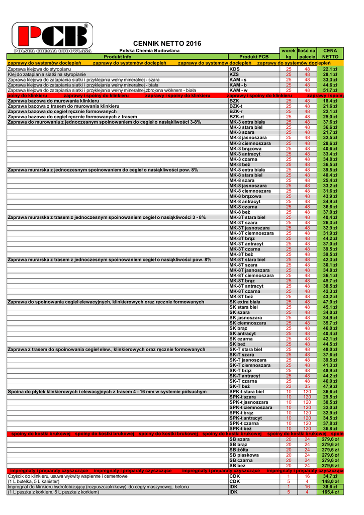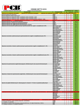 CENNIK NETTO 2016 Polska Chemia Budowlana worek Ilość na CENA Produkt Info Produkt PCB kg palecie NETTO zaprawy do systemów dociepleń zaprawy do systemów dociepleń zaprawy do systemów dociepleń zaprawy do systemów dociepleń Zaprawa klejowa do styropianu KDS 25 48 22,1 zł Klej do zatapiania siatki na styropianie KZS 25 48 28,1 zł Zaprawa klejowa do zatapiania siatki i przyklejania wełny mineralnej - szara KAM - s 25 48 33,3 zł Zaprawa klejowa do zatapiania siatki i przyklejania wełny mineralnej - biała KAM - b 25 48 44,6 zł Zaprawa klejowa do zatapiania siatki i przyklejania wełny mineralnej,zbrojona włóknem - biała KAM - w 25 48 51,7 zł y i spoiny do klinkieru zaprawy i spoiny do klinkieru zaprawy i spoiny do klinkieru zaprawy i spoiny do klinkieru zaprawy i spoiny do klink Zaprawa bazowa do murowania klinkieru BZK 25 48 18,4 zł Zaprawa bazowa z trasem do murowania klinkieru BZK-t 25 48 21,6 zł Zaprawa bazowa do cegieł ręcznie formowanych BZK-r 25 48 22,1 zł Zaprawa bazowa do cegieł ręcznie formowanych z trasem BZK-rt 25 48 25,0 zł Zaprawa do murowania z jednoczesnym spoinowaniem do cegieł o nasiąkliwości 3-8% MK-3 extra biała 25 48 37,6 zł MK-3 stara biel 25 48 36,6 zł MK-3 szara 25 48 21,7 zł MK-3 jasnoszara 25 48 32,5 zł MK-3 ciemnoszara 25 48 28,6 zł MK-3 brązowa 25 48 40,6 zł MK-3 antracyt 25 48 33,4 zł MK-3 czarna 25 48 34,8 zł MK-3 beż 25 48 36,5 zł Zaprawa murarska z jednoczesnym spoinowaniem do cegieł o nasiąkliwości pow. 8% MK-8 extra biała 25 48 39,5 zł MK-8 stara biel 25 48 40,4 zł MK-8 szara 25 48 25,4 zł MK-8 jasnoszara 25 48 33,2 zł MK-8 ciemnoszara 25 48 31,6 zł MK-8 brązowa 25 48 43,9 zł MK-8 antracyt 25 48 34,9 zł MK-8 czarna 25 48 36,6 zł MK-8 beż 25 48 37,0 zł Zaprawa murarska z trasem z jednoczesnym spoinowaniem cegieł o nasiąkliwości 3 - 8% MK-3T stara biel 25 48 40,4 zł MK-3T szara 25 48 26,3 zł MK-3T jasnoszara 25 48 32,9 zł MK-3T ciemnoszara 25 48 31,9 zł MK-3T brąz 25 48 44,2 zł MK-3T antracyt 25 48 37,0 zł MK-3T czarna 25 48 39,5 zł MK-3T beż 25 48 39,5 zł Zaprawa murarska z trasem z jednoczesnym spoinowaniem cegieł o nasiąkliwości pow. 8% MK-8T stara biel 25 48 42,3 zł MK-8T szara 25 48 30,1 zł MK-8T jasnoszara 25 48 34,8 zł MK-8T ciemnoszara 25 48 36,1 zł MK-8T brąz 25 48 45,7 zł MK-8T antracyt 25 48 38,5 zł MK-8T czarna 25 48 42,3 zł MK-8T beż 25 48 43,2 zł Zaprawa do spoinowania cegieł elewacyjnych, klinkierowych oraz ręcznie formowanych SK extra biała 25 48 47,0 zł SK stara biel 25 48 45,1 zł SK szara 25 48 34,0 zł SK jasnoszara 25 48 34,9 zł SK ciemnoszara 25 48 35,7 zł SK brąz 25 48 46,0 zł SK antracyt 25 48 40,4 zł SK czarna 25 48 42,1 zł SK beż 25 48 44,5 zł Zaprawa z trasem do spoinowania cegieł elew., klinkierowych oraz ręcznie formowanych SK-T stara biel 25 48 48,0 zł SK-T szara 25 48 37,6 zł SK-T jasnoszara 25 48 39,5 zł SK-T ciemnoszara 25 48 41,3 zł SK-T brąz 25 48 48,9 zł SK-T antracyt 25 48 44,2 zł SK-T czarna 25 48 46,0 zł SK-T beż 23 35 47,9 zł Spoina do płytek klinkierowych i elewacyjnych z trasem 4 - 16 mm w systemie półsuchym SPK-t stara biel 10 120 36,6 zł SPK-t szara 10 120 29,5 zł SPK-t jasnoszara 10 120 30,5 zł SPK-t ciemnoszara 10 120 32,0 zł SPK-t brąz 10 120 32,9 zł SPK-t antracyt 10 120 34,5 zł SPK-t czarna 10 120 37,8 zł SPK-t beż 10 120 36,8 zł spoiny do kostki brukowej spoiny do kostki brukowej spoiny do kostki brukowej spoiny do kostki brukowej spoiny do kostki brukowej spoiny do kost SB szara 20 24 279,6 zł SB brąz 20 24 279,6 zł SB żółta 20 24 279,6 zł SB piaskowa 20 24 279,6 zł SB czarna 20 24 279,6 zł SB beż 20 24 279,6 zł impregnaty i preparaty czyszczące impregnaty i preparaty czyszczące impregnaty i preparaty czyszczące impregnaty i preparaty czyszczące Czyścik do klinkieru, usuwa wykwity wapienne i cementowe CDK 1 16 34,7 zł (1 L butelka, 5 L kanister) CDK 5 4 148,0 zł Impregnat do klinkieru hydrofobizujący (rozpuszczalnikowy) do cegły maszynowej, betonu IDK 1 16 38,6 zł (1 L puszka z korkiem, 5 L puszka z korkiem) IDK 5 4 165,4 zł Impregnat do klinkieru hydrofobizujący i oleofobizujący do cegły ręcznie formowanej (1 L butelka , 5 L kanister) Pasta - usuwacz oleju silnikowego do kostki brukowej i betonowej (rozpuszczalnik) 1L Impregnat do kostki brukowej i betonowej hydrofobizujący i oleofobizujący (1 L butelka, 5 L kanister) Impregnat do gresu, marmuru i kamienia naturalnego hydro i oleofobizujący ( 0,25 L puszka , 1 L puszka , 5 L puszka ) IDK-r 1 16 44,8 zł IDK-r 5 4 201,0 zł UOK 1 4 131,6 zł IKB 1 16 42,0 zł IKB 5 4 186,4 zł IDG 0,25 8 38,6 zł IDG 1 4 117,0 zł IDG 5 4 566,5 zł Olej do klinkieru ODK 1 16 51,2 zł (1 L butelka, 5 L kanister) ODK 5 4 244,9 zł dzkowy garażowy system posadzkowy garażowy system posadzkowy garażowy system posadzkowy garażowy system posadzko Dwuskładnikowy systemowy środek gruntujący A+B GSP-G 5 48 543,9 zł Dwuskładnikowa systemowa posadzka barwiona w masie A+B GSP-P 3 48 421,1 zł Systemowe confetti akrylowe czarno-białe 50/50 GSP-C 1 48 182,7 zł Dwuskładnikowy systemowy lakier bezbarwny połysk GSP-LP 3 48 683,5 zł owe do płytek zaprawy klejowe do płytek zaprawy klejowe do płytek zaprawy klejowe do płytek zaprawy klejowe do płytek zaprawy k Zaprawa klejowa klasy C1 TE FK 25 48 26,7 zł Zaprawa klejowa klasy C1 TE do gresu FK + 25 48 37,6 zł Zaprawa klejowa klasy C2 TE na ogrzewanie podłogowe FK-e 25 48 44,3 zł Pachnąca zaprawa klejowa wysokoelastyczna klasy C2 TE " płytka na płytkę" FFK-wanilia 12,5 96 35,0 zł Zaprawa klejowa wysokoelastyczna klasy C2 TE " płytka na płytkę" FFK 25 48 54,1 zł Zaprawa klejowa szybkowiążąca wysokoelastyczna klasy C2 TF " ruch pieszy po 4h" FFK-s 25 48 109,0 zł Zaprawa klejowa wysokoelastyczna klasy C2 TE z trasem - biała FFK-tb 25 48 87,7 zł Klej do płytek klinkierowych i elewacyjnych klasy C2 TE S2 KPK 25 48 54,1 zł Klej do dociepleń z płytką elewacyjną PC