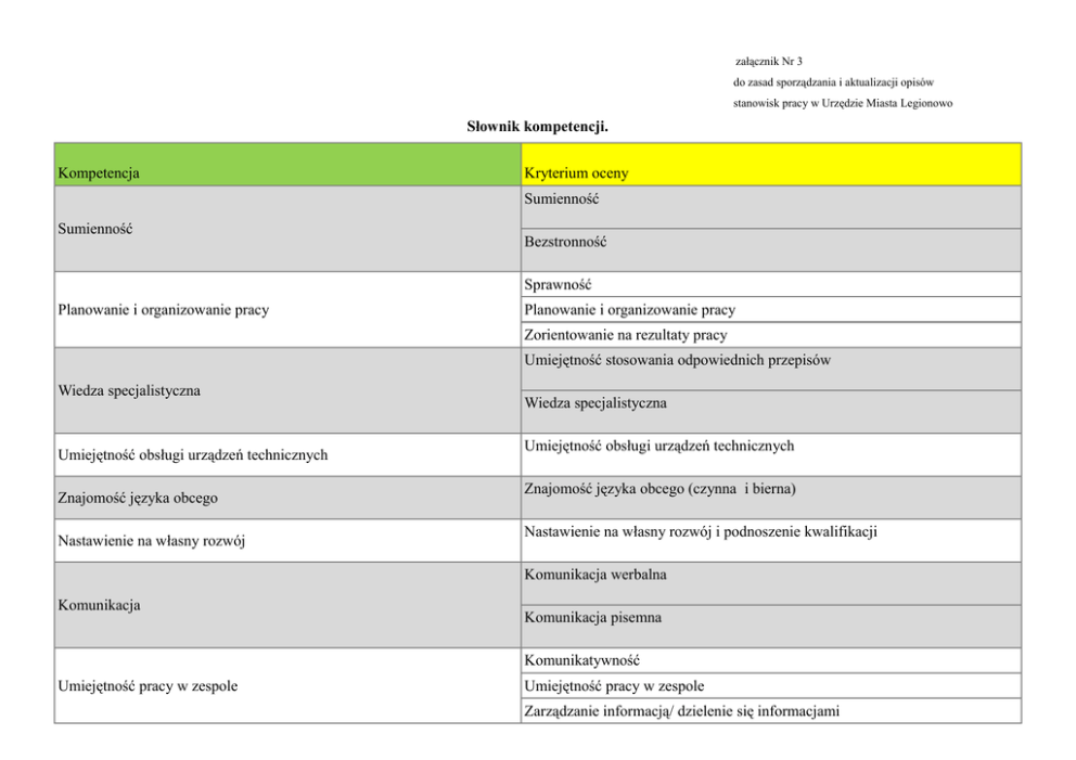 załącznik Nr 3 do zasad sporządzania i aktualizacji opisów stanowisk pracy w Urzędzie Miasta Legionowo Słownik kompetencji. Kompetencja Kryterium oceny Sumienność Sumienność Bezstronność Sprawność Planowanie i organizowanie pracy Planowanie i organizowanie pracy Zorientowanie na rezultaty pracy Umiejętność stosowania odpowiednich przepisów Wiedza specjalistyczna Umiejętność obsługi urządzeń technicznych Znajomość języka obcego Nastawienie na własny rozwój Wiedza specjalistyczna Umiejętność obsługi urządzeń technicznych Znajomość języka obcego (czynna i bierna) Nastawienie na własny rozwój i podnoszenie kwalifikacji Komunikacja werbalna Komunikacja Komunikacja pisemna Komunikatywność Umiejętność pracy w zespole Umiejętność pracy w zespole Zarządzanie informacją/ dzielenie się informacjami Pozytywne podejście do klienta Umiejętność negocjowania Zarządzanie zasobami Pozytywne podejście do klienta Umiejętność negocjowania Zarządzanie zasobami Zarządzanie personelem Zarządzanie personelem Zarządzanie wprowadzaniem zmian Podejmowanie decyzji Radzenie sobie w sytuacjach kryzysowych Zarządzanie jakością realizowanych zadań Zarządzanie wprowadzaniem zmian Podejmowanie decyzji Radzenie sobie w sytuacjach kryzysowych Inicjatywa Inicjatywa i kreatywność Myślenie strategiczne Umiejętności analityczne Kreatywność Myślenie strategiczne Umiejętności analityczne Sumienność Wykonywanie obowiązków dokładnie, skrupulatnie i solidnie. Obiektywne rozpoznanie sytuacji. Wykorzystywanie tylko wiarygodnych i sprawdzonych faktów, informacji i danych Aspekty Poziomy (A) (B) (C) (D) (E) Selekcjonowanie Nie wie z jakich źródeł korzystać właściwych danych i w celu pozyskania potrzebnych informacji informacji i danych na jego stanowisku pracy lub korzysta z niesprawdzonych źródeł informacji. Zna podstawowe źródła informacji niezbędne na stanowisku pracy. W razie problemów ze znalezieniem danych czy informacji, pyta o to innych. Korzysta tylko z wiarygodnych źródeł informacji (np.: otrzymanych od przełożonego). Znajduje adekwatne informacje w zależności od potrzeby (np.: znajduje źródło danych, które zawiera wszystkie niezbędne informacje, zamiast łączyć te same informacje z różnych źródeł). Weryfikuje jakość/ rzetelność nowych danych (np.: w razie wątpliwości co do rzetelności informacji prosi o pomoc eksperta). Wskazuje większość źródeł informacji w danym zakresie. Pomaga innym pozyskiwać dane i informacje oraz oceniać ich rzetelność. Doradza innym gdzie szukać informacji i danych oraz pomaga pozyskać informacje z danego zakresu i ocenić ich rzetelność (np.: dzieli się informacjami, do których ma dostęp ze względu na swoją wiedzę ekspercką). Znajduje i pozyskuje dla urzędu nowe źródła informacji lub/ i tworzy standardy/ narzędzia ich pozyskiwania (np.: tworzy koncepcje baz wiedzy używanych w urzędzie). Prezentowanie danych Przedstawia dane w sposób nieczytelny i niejasny. Nie zachowuje oczekiwanej struktury ich prezentowania. Nie prosi innych o radę w tym zakresie nawet jeśli ma wątpliwości. Przedstawia zgromadzone informacje i dane w sposób prosty i przejrzysty. W razie wątpliwości prosi o pomoc w nadaniu struktury i priorytetów zebranym informacjom. Przedstawia informacje w czytelny, przejrzysty i zrozumiały sposób. Odpowiednio dopasowuje formę prezentowania do rodzaju danych/ zadania. Wybiera dane istotne pod kątem celu ich prezentowania (np.: przekazuje współpracownikowi informacje zgodne z jego potrzebami i istotne w danym przypadku). Dokonuje spójnej interpretacji oraz przedstawia dane i informacje w kontekście funkcjonowania urzędu/ danej jednostki z zachowaniem priorytetów. Wyjaśnia innym w jaki sposób adekwatnie przedstawiać dane (np.: pomaga przygotowywać współpracownikom prezentacje). Proponuje rozwiązania w zakresie prezentowania danych w całym urzędzie. Wskazuje dane, które należy prezentować w zakresie komunikacji wewnętrznej lub/ i zewnętrznej (np.: jak i które dane osobowe prezentować poza urzędem). Poziom jakości wykonywanych zadań Bardzo często popełnia błędy nawet przy wykonywaniu rutynowych czynności. W zadaniach rutynowych błędy popełnia rzadko. Zdarza mu się popełniać błędy w zadaniach związanych z nowymi obszarami, wynikające z braku doświadczenia w danym zakresie. Bardzo rzadko popełnia błędy. Jeśli mu się zdarzą to raczej w nietypowych sytuacjach i szybko je dostrzega oraz skupia na ich poprawie. Przed przedstawieniem informacji sprawdza ich jakość. Wskazuje innym pracownikom w jaki sposób podnosić jakość wykonywanych zadań. Wskazuje sprawdzone rozwiązania chroniące przed popełnianiem danego rodzaju błędów. Tworzy procedury i regulacje, które pomagają zapobiegać popełnianiu błędów w danym obszarze. Wdraża rozwiązania podnoszące jakość wykonywanych zadań. Planowanie i organizowanie pracy Planowanie działań i organizowanie pracy w celu efektywnego wykonania zadań. Ustalanie priorytetów działania, efektywne wykorzystywanie czasu, tworzenie możliwych do realizacji planów działania. Przyjmowanie odpowiedzialności w trakcie realizacji zadań i wywiązywanie się z zobowiązań. Aspekty Poziomy (A) (B) (C) (D) (E) Organizowanie pracy Nie organizuje czasu pracy, nie dotrzymuje terminów wykonywania pracy. Planuje kolejność wykonywania czynności w ramach zleconego zadania. Dotrzymuje terminów wykonania większości zlecanych zadań. Ocenia wykonywane zadania pod kątem ich pilności i wagi. Proponuje optymalne rozwiązania w zakresie planowania terminów wykonywania zadań oraz podziału czynności przy nich niezbędnych. Efektywnie organizuje czas pracy, używając przy tym narzędzi zarządzania czasem. Korzysta z zasobów stworzonych wcześniej przez innych, pomagających zwiększać efektywność pracy. Dotrzymuje wyznaczanych mu terminów. Planuje 
