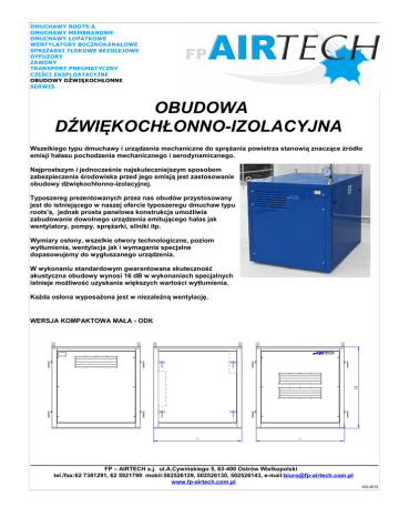 DMUCHAWY ROOTS'A DMUCHAWY MEMBRANOWE DMUCHAWY ŁOPATKOWE WENTYLATORY BOCZNOKANAŁOWE SPRĘŻARKI TŁOKOWE BEZOLEJOWE DYFUZORY ZAWORY TRANSPORT PNEUMATYCZNY CZĘŚCI EKSPLOATACYJNE OBUDOWY DŹWIĘKOCHŁONNE SERWIS OBUDOWA DŹWIĘKOCHŁONNO-IZOLACYJNA Wszelkiego typu dmuchawy i urządzenia mechaniczne do sprężania powietrza stanowią znaczące źródło emisji hałasu pochodzenia mechanicznego i aerodynamicznego. Najprostszym i jednocześnie najskuteczniejszym sposobem zabezpieczenia środowiska przed jego emisją jest zastosowanie obudowy dźwiękochłonno-izolacyjnej. Typoszereg prezentowanych przez nas obudów przystosowany jest do istniejącego w naszej ofercie typoszeregu dmuchaw typu roots'a, jednak prosta panelowa konstrukcja umożliwia zabudowanie dowolnego urządzenia emitującego hałas jak wentylatory, pompy, sprężarki, silniki itp. Wymiary osłony, wszelkie otwory technologiczne, poziom wytłumienia, wentylacja jak i wymagania specjalne dopasowujemy do wygłuszanego urządzenia. W wykonaniu standardowym gwarantowana skuteczność akustyczna obudowy wynosi 16 dB w wykonaniach specjalnych istnieje możliwość uzyskania większych wartości wytłumienia. Każda osłona wyposażona jest w niezależną wentylację. WERSJA KOMPAKTOWA MAŁA - ODK FP – AIRTECH s.j. ul.A.Cywińskiego 5, 63-400 Ostrów Wielkopolski tel./fax:62 7381291, 62 5921799 mobil:502526129, 502526130, 502526143, e-mail:[email protected] www.fp-airtech.com.pl W2-2015 DMUCHAWY ROOTS'A DMUCHAWY MEMBRANOWE DMUCHAWY ŁOPATKOWE WENTYLATORY BOCZNOKANAŁOWE SPRĘŻARKI TŁOKOWE BEZOLEJOWE DYFUZORY ZAWORY TRANSPORT PNEUMATYCZNY CZĘŚCI EKSPLOATACYJNE OBUDOWY DŹWIĘKOCHŁONNE SERWIS WERSJA KOMPAKTOWA DUŻA - ODK WERSJA WYDŁUŻONA - ODI ODK TYP WYMIAR 100 101 125 130 210 ODI 270 700 1000 100 112 114 125 130 270 900 A 809 1056 1181 1331 1431 2362 2362 2793 1400 1600 1700 1800 2100 2800 3400 B 760 1056 1181 1331 1431 1431 1431 2362 850 H 900 1068 1192 1458 1769 2142 2267 2680 950 1050 1200 1300 1510 2250 2800 950 1050 1150 1290 1450 2000 Wymiary podano w mm. Masa zależy od zastosowanego materiału dźwiękochłonnego i podawana jest indywidualnie dla konkretnego typu osłony. Dostawca zastrzega sobie prawo wprowadzania zmian konstrukcyjnych i materiałowych, oraz osiągów i wyglądu oferowanych maszyn w miarę ich udoskonalania. FP – AIRTECH s.j. ul.A.Cywińskiego 5, 63-400 Ostrów Wielkopolski tel./fax:62 7381291, 62 5921799 mobil:502526129, 502526130, 502526143, e-mail:[email protected] www.fp-airtech.com.pl W2-2015