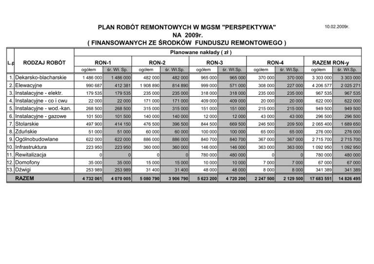 10.02.2009r. PLAN ROBÓT REMONTOWYCH W MGSM "PERSPEKTYWA" NA 2009r. ( FINANSOWANYCH ZE ŚRODKÓW FUNDUSZU REMONTOWEGO ) Planowane nakłady ( zł ) L.p. RODZAJ ROBÓT RON-1 ogółem 1. Dekarsko-blacharskie RON-2 śr. Wł. Sp. ogółem RON-3 śr. Wł.Sp. ogółem RON-4 śr. Wł.Sp. ogółem RAZEM RON-y śr. Wł.Sp. ogółem śr. Wł.Sp. 1 486 000 1 486 000 482 000 482 000 965 000 965 000 370 000 370 000 3 303 000 3 303 000 2. Elewacyjne 990 687 412 381 1 908 890 814 890 999 000 571 000 308 000 227 000 4 206 577 2 025 271 3. Instalacyjne - elektr. 179 535 179 535 235 000 235 000 318 000 318 000 235 000 235 000 967 535 967 535 22 000 22 000 171 000 171 000 409 000 409 000 20 000 20 000 622 000 622 000 5. Instalacyjne - wod.-kan. 268 500 268 500 315 000 315 000 151 000 151 000 215 000 215 000 949 500 949 500 6. Instalacyjne - gazowe 101 500 101 500 140 000 140 000 12 000 12 000 43 000 43 000 296 500 296 500 7. Stolarskie 497 900 414 150 476 500 396 500 844 500 669 500 246 500 209 500 2 065 400 1 689 650 8. Zduńskie 51 000 51 000 60 000 60 000 100 000 100 000 65 000 65 000 276 000 276 000 622 000 622 000 886 000 886 000 840 700 840 700 367 000 367 000 2 715 700 2 715 700 10. Infrastruktura 223 950 223 950 360 000 360 000 146 000 146 000 363 000 363 000 1 092 950 1 092 950 11. Rewitalizacja 0 0 0 0 780 000 480 000 0 0 780 000 480 000 35 000 35 000 15 000 15 000 10 000 10 000 7 000 7 000 67 000 67 000 253 989 253 989 31 400 31 400 48 000 48 000 8 000 8 000 341 389 341 389 4 732 061 4 070 005 5 080 790 3 906 790 5 623 200 4 720 200 2 247 500 2 129 500 17 683 551 14 826 495 4. Instalacyjne - co i cwu 9. Ogólnobudowlane 12. Domofony 13. Dźwigi RAZEM