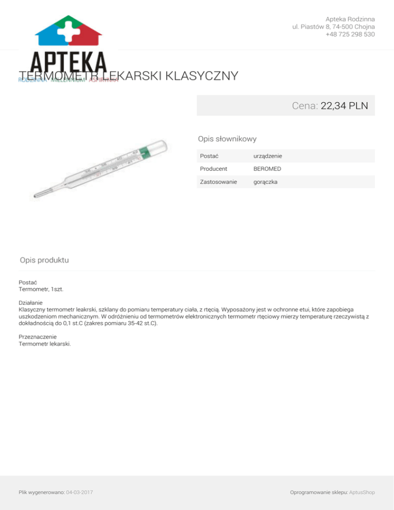 Apteka Rodzinna ul. Piastów 8, 74-500 Chojna +48 725 298 530 TERMOMETR LEKARSKI KLASYCZNY Cena: 22,34 PLN Opis słownikowy Postać urządzenie Producent BEROMED Zastosowanie gorączka Opis produktu Postać Termometr, 1szt. Działanie Klasyczny termometr leakrski, szklany do pomiaru temperatury ciała, z rtęcią. Wyposażony jest w ochronne etui, które zapobiega uszkodzeniom mechanicznym. W odróżnieniu od termometrów elektronicznych termometr rtęciowy mierzy temperaturę rzeczywistą z dokładnością do 0,1 st.C (zakres pomiaru 35-42 st.C). Przeznaczenie Termometr lekarski. Plik wygenerowano: 04-03-2017 Powered by TCPDF (www.tcpdf.org) Oprogramowanie sklepu: AptusShop
