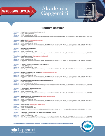 WROCŁAW EDYCJA 3. Akademia Capgemini Program spotkań Wykład: Data: Godzina: Miejsce: Bezpieczeństwo aplikacji webowych 24.04.2014 (czwartek) 18:00 (czas trwania: 1,5h) Sala Kongresowa 10D, Centrum Kongresowe Politechniki Wrocławskiej, Bud. D-20, ul. Janiszewskiego 8, 50-372 Warsztat: Data: Godzina: Miejsce: Agile City (Wymagana rejestracja!) 06.05.2014 (wtorek) 15:30 (czas trwania: 4,5h) Capgemini Software Solutions Center, Bud. Millenium Tower II, 11. Piętro, ul. Strzegomska 42B, 53-611 Wrocław Wykład: Data: Godzina: Miejsce: Domain-Driven Design 07.05.2014 (środa) 18:00 (czas trwania: 1,5h) Sala Kongresowa 10D, Centrum Kongresowe Politechniki Wrocławskiej, Bud. D-20, ul. Janiszewskiego 8, 50-372 Warsztat: Data: Godzina: Miejsce: Java Coderetreat (Wymagana rejestracja!) 10.05.2014 (sobota) 09:00 (czas trwania: 7h) Capgemini Software Solutions Center, Bud. Millenium Tower II, 11. Piętro, ul. Strzegomska 42B, 53-611 Wrocław Wykład: Data: Godzina: Miejsce: Projekty Agile w zespołach rozproszonych 14.05.2014 (środa) 18:00 (czas trwania: 1,5 h) Sala Kongresowa 10D, Centrum Kongresowe Politechniki Wrocławskiej, Bud. D-20, ul. Janiszewskiego 8, 50-372 Warsztat: Data: Godzina: Miejsce: DDD czyli Direct Dron Delivery (Wymagana rejestracja!) 20.05.2014 (wtorek) 14:00 (czas trwania: 6h) Capgemini Software Solutions Center, Bud. Millenium Tower II, 11. Piętro, ul. Strzegomska 42B, 53-611 Wrocław Wykład: Data: Godzina: Miejsce: Architektura Biznesowych Rozwiązań Mobilnych 21.05.2014 (środa) 18:00 (czas trwania: 1,5h) Sala Kongresowa 10D, Centrum Kongresowe Politechniki Wrocławskiej, Bud. D-20, ul. Janiszewskiego 8, 50-372 Wykład: Data: Godzina: Miejsce: Performance w bazach danych 28.05.2014 (środa) 18:00 (czas trwania: 1,5h) Sala Kongresowa 10D, Centrum Kongresowe Politechniki Wrocławskiej, Bud. D-20, ul. Janiszewskiego 8, 50-372 Warsztat: Data: Godzina: Miejsce: Rapid Design & Visualization (Wymagana rejestracja!) 29.05.2014 (czwartek) 16:00 (czas trwania: 4h) Capgemini Software Solutions Center, Bud. Millenium Tower II, 11. Piętro, ul. Strzegomska 42B, 53-611 Wrocław Warsztat: Data: Godzina: Miejsce: Scala w Sieci (Wymagana rejestracja!) 03.06.2014 (wtorek) 15:00 (czas trwania: 5h) Capgemini Software Solutions Center, Bud. Millenium Tower II, 11. Piętro, ul. Strzegomska 42B, 53-611 Wrocław Wykład: Data: Godzina: Miejsce: Integracja Danych – ETL w Informatica Power Center 04.06.2014 (środa) 18:00 (czas trwania: 1,5h) Sala Kongresowa 10D, Centrum Kongresowe Politechniki Wrocławskiej, Bud. D-20, ul. Janiszewskiego 8, 50-372 Szczegóły, zapisy oraz aktualizacje na naszej stronie: www.pl.capgemini-sdm.com/akademiawroclaw