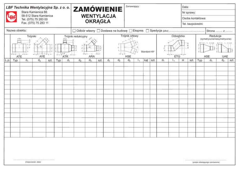 LBF Technika Wentylacyjna Sp. z o. o. Stara Kamienica 66 58-512 Stara Kamienica Tel. (075) 75 283 00 Fax. (075) 75 283 11 ZAMÓWIENIE Zamawiający: Data: Nr sprawy: WENTYLACJA OKRĄGŁA Nazwa obiektu: Odbiór własny Trójniki Osoba kontaktowa: Tel. bezpośredni: Dostawa na budowę Spedycja (jaka) .............................................. Strona ......... z ......... Ekspres Trójnik orłowy Odsadzka Redukcje (symetryczne/niesymetryczne) H Trójnik redukcyjny Standard 45o L.p. ATE Typ d1 AYE d3 szt. .................................................................................... (miejscowość, data) Typ ATR d1 d2 ARA d3 szt. d1 d2 HSE d3 l1 kąt szt. d1 ETG l1 H szt. Typ ASE d1 UAE d2 szt. .................................................................................... (podpis składającego zamówienie)