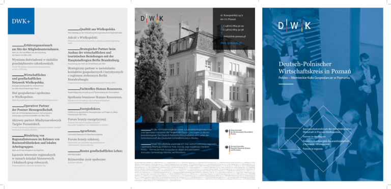 ul. Konopnickiej 14/2 DWK+ 60-771 Poznań ¬ T/ (+48 61) 864 30 40 Qualität aus Wielkopolska. F/ (+48 61) 864 30 58 ¬ Aktiv beteiligt an der Entwicklung einer gemeinsamen Regionalmarke. E/ [email protected] ¬ Jakość z Wielkopolski. Erfahrungsaustausch am Sitz der Mitgliedsunternehmen. Mehr als 100 mal effektiv seit der Gründung des Vereins im März 2003. Wymiana doświadczeń w siedzibie przedsiębiorstw członkowskich. Ponad 100 spotkań od powstania Stowarzyszenia w marcu 2003 roku. Wirtschaftliches und gesellschaftliches Netzwerk Wielkopolska. Kompakt bereitgestellt für Unternehmen aus dem deutschsprachigen Raum. Aktywne uczestnictwo w tworzeniu i rozwoju wspólnej regionalnej marki. Strategischer Partner beim Ausbau der wirtschaftlichen und touristischen Beziehungen mit der Hauptstadtregion Berlin Brandenburg. Strategiczny partner w zacieśnianiu kontaktów gospodarczych i turystycznych z regionem stołecznym Berlin Brandenburgia. Fachtreffen Human Ressources. Także dla przedsiębiorstw z obszarów niemieckojęzycznych. Regularne benchmarkingi oraz wymiana doświadczeń przez kierowników działów personalnych. Spotkania branżowe Human Ressources. Energiediskurs. Mehr als 50 Produktpräsentationen, Fachsymposien, Schulungen und Branchentreffen seit März 2003. Fachforum zu gesetzlichen Neuregelungen und Fragen zu deren Umsetzung in die Praxis. Aktywny partner Międzynarodowych Targów Poznańskich. Forum branży energetycznej. Bündelung von Regionalinteressen im Rahmen von Businessfrühstücken und lokalen Arbeitsgruppen. Mehr als 50 mal erfolgreich durchgeführt. Łączenie interesów regionalnych w ramach śniadań biznesowych i lokalnych grup roboczych. Przeprowadzone z sukcesem ponad 50 razy. Polsko – Niemieckie Koło Gospodarcze w Poznaniu Zorganizowanie ponad 20 paneli tematycznych od roku 2003. Regelmäßges Benchmarking und Themendialog der Personalleiter. Ponad 50 prezentacji produktów, sympozjów, szkoleń i spotkań branżowych od marca 2003 roku. Deutsch-Polnischer Wirtschaftskreis in Poznań Ausrichtung von mehr als 20 Fachforen seit 2003. Sieć gospodarcza i społeczna w Wielkopolsce. Operativer Partner der Posener Messegesellschaft. dwk-poznan.pl Dyskusje dot. nowych regulacji prawnych oraz pytań związanych z ich wdrażaniem w praktyce. Agrarforum. Informelles Netzwerk für Branchenmitglieder. Forum branży rolniczej. Nieformalna sieć kontaktów dla przedsiębiorstw członkowskich z branży rolniczej. Buntes gesellschaftliches Leben: WIR SIND DABEI! An die 100 Fördermitglieder sowie ausgewählte Regionalpartner und Sponsoren inanzieren die Tätigkeit des Kreises und tragen zu dessen praxisbezogener. Der Deutsch-Polnische Wirtschaftskreis steht unter der Schirmherrschaft des Deutschen Generalkonsulats in Breslau. Ponad 100 członków wspierających oraz wybrani partnerzy regionalni i sponsorzy finansują działalność Koła, tworząc jego wyjątkowy charakter. Polsko – Niemieckie Koło Gospodarcze objęte jest patronatem Konsulatu Generalnego Niemiec we Wrocławiu. Różnorodne życie społeczne: JESTEŚMY OBECNI! Agencja Reklamowa Czekolada • Air Liquide Polska Sp. z o. o. • Angelika Menze Sp. z o. o. • Anton Röhr Logistyka Sp. z o. o. • Bader Kara Praca Tymczasowa Sp. z o. o. • BIMs PLUS Fachowy Handel Hurtowy Sp. z o. o. • BRE Bank S.A. • BSJP Brockhuis Jurczak Prusak Sp. k. • Buma Lubań Sp. z o. o. • Centrum Obsługi Biznesu Sp. z o.o.( Sheraton) • CITTI GV-Partner Polska Sp. z o. o. • Clavey Maintenance Service Sp. z o. o. • Craiss Logistyka Sp. z o. o. • Deloitte Audyt Sp. z o. o. • Democo Sp. z o. o. • Deutsche Leasing Polska S.A. • Deutsch-Polnisches Kooperationsbüro der Sparkassen • ECORRECT Andreas Hilker • EEW Energy from Waste Polska Sp. z o. o. • EL-Cab. Sp. z o. o. • ESOD Sp. z o. o. Sp. k. • Fabryka Urządzeń Przemysłowych Sp. z o. o. • FBS -Flughafen Berlin Schoenefeld GmbH • Funk International Polska Sp. z o. o. • G. Data Software Sp. z o. o. • Gebhardt Stahl Polska Sp. z o.o. • Getsix Poznań Sp. z o.o. • Gizeh Dispoform Sp. z o. o. • Goldenstein & Partner • Adwokaci • Doradcy Podatkowi • GRAFOS s.c. • Grupa HUNTERS Sp. z o. o. • H2O Polska Sp. z o. o. • Hermes Polska Sp. z o. o. • Horstmann Budowa Urządzeń i Technika Ekologiczna Sp. z o. o. • Hotel NH Poznań • Hotel Ramka • HR Personal Consulting GmbH • IHK Ostbrandenburg • IKB Leasing Polska Sp. z o. o. • K+S Polska Sp. z o. o. • Kancelaria Prawna „Answer” Ostafi i Partnerzy • Karl Knauer Poland Sp. z o. o. • Keßler Bau AG • Kiel Polska Sp. z o. o. • Klafs Sp. z o. o. • Klöckner Stal i Metal Polska Sp. z o. o. • KOLDWind Management Sp. z o. o. • Korporacja Doradztwa Podatkowego P&K TAXSERVICES • Koźbiał-Voss • LoBo Sp. z o. o. • Logwin Solution Poland Sp. z .o. o. • Lorenz Snack – World Services Sp. z o. o. Sp. k. • Machwürth Team International • Macrix Polska Sp. z o. o. • MAGNA AUTOMOTIVE Poland Sp. z o. o. • MAN Bus Sp. z o. o. • Martin Bauer Polska Sp. z o. o. • Mondi Polska Agencja Pracy Sp. z o. o. • NIVEA Polska Sp. z o. o. • NOVOFERM Polska Sp. z o. o. • NOVOL Sp. z o. o. • Panopa Logistik Polska Sp. z o. o. • Perschmann Sp. z o. o. • PLI Logistik & Service Sp. z o. o. • POZENA Doradztwo Językowe • REHAU Sp. z o. o. • REMONDIS Sanitech Poznań Sp. z o. o. • Roedl Outsourcing Sp. z o. o. • Rudolph Automotive Logistik GmbH • SAZ Schweisstechnik GmbH & Co.KG • Schattdecor Sp. z o. o. • Schnellecke Polska Sp. z o. o. • Schrader Internationale Logistic Sp. z o. o. • SES Paneuropa Logistic • Technologie Zentrum Teltow • TENTE Sp. z o. o. • TMB Tourismus Marketing Brandenburg GmbH • Transco Polska Sp. z o. o. • TSS Polska Touristik Service System Sp. z o. o. • Voith Industrial Services Polska Sp. z o.o. • Volkswagen Poznań Sp. z o. o. • von Zanthier Kancelaria Prawnicza Sp. k. • Wirtgen Polska