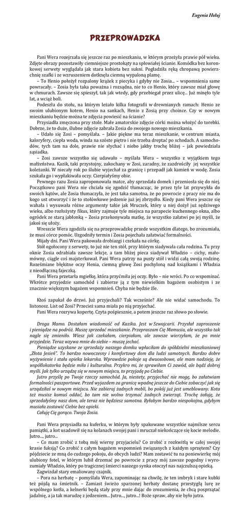 Eugenia Hołuj PRZEPROWADZKA Pani Wera rozejrzała się jeszcze raz po mieszkaniu, w którym przeżyła prawie pół wieku. Zdjęte obrazy pozostawiły ciemniejsze prostokąty na spłowiałej ścianie. Komódka bez koronkowej serwety wyglądała jak stara kobieta bez sukni. Pogładziła ręką chropawą powierzchnię szafki i ze wzruszeniem dotknęła ciemną wypaloną plamę. – To Henio położył rozpalony krążek z piecyka i gdyby nie Zosia... – wspomnienia same powracały. – Zosia była taka poważna i rozsądna, nie to co Henio, który zawsze miał głowę w chmurach. Zawsze się spieszył, tak jak wtedy, gdy przebiegał przez ulicę... Już minęło tyle lat, a wciąż boli. Podeszła do stołu, na którym leżało kilka fotografii w drewnianych ramach: Henio ze swoim ulubionym kotem, Henio na sankach, Henio z Zosią przy choince. Czy w nowym mieszkaniu będzie można te zdjęcia powiesić na ścianie? Przysiadła zmęczona przy stole. Małe amatorskie zdjęcie córki można włożyć do torebki. Dobrze, że to duże, ślubne zdjęcie zabrała Zosia do swojego nowego mieszkania. – Udało się Zosi – pomyślała. – Jakie piękne ma teraz mieszkanie, w centrum miasta, kaloryfery, ciepła woda, winda na szóste piętro i nie trzeba dreptać po schodach. A samochodów, tych tam na dole, prawie nie słychać i niebo jakby trochę bliżej – jak powiedziała sąsiadka. – Zosi zawsze wszystko się udawało – myślała Wera – wszystko z wyjątkiem tego małżeństwa. Kazik, taki przystojny, zakochany w Zosi, zaradny, że zazdrościły jej wszystkie koleżanki. W niecały rok po ślubie wyjechał za granicę i przepadł jak kamień w wodę. Zosia szukała go i wypłakiwała oczy. Cierpiałyśmy obie. Pewnego razu Zosia zaproponowała matce, aby sprzedała domek i przeniosła się do niej. Początkowo pani Wera nie chciała się zgodzić tłumacząc, że przez tyle lat przywykła do swoich kątów, ale Zosia tłumaczyła, że jest taka samotna, że po powrocie z pracy nie ma do kogo ust otworzyć i że to stołówkowe jedzenie już jej zbrzydło. Kiedy pani Wera jeszcze się wahała i wysuwała różne argumenty takie jak Mruczek, który u niej dożył już sędziwego wieku, albo rozłożysty fikus, który zajmuje tyle miejsca na parapecie kuchennego okna, albo ogródek ze starą jabłonką – Zosia przekonywała matkę, że wszystko załatwi po jej myśli, że jakoś się ułoży. Wreszcie Wera zgodziła się na przeprowadzkę przede wszystkim dlatego, bo zrozumiała, że musi córce pomóc. Uzgodniły termin i Zosia pojechała załatwiać formalności. Mijały dni. Pani Wera pakowała drobiazgi i czekała na córkę. Stół ogołocony z serwety, to już nie ten stół, przy którym siadywała cała rodzina. Tu przy oknie Zosia odrabiała zawsze lekcje, a tam bliżej pieca siadywał Władzio – cichy, małomówny, ciągle coś majsterkował. Pani Wera patrzy na pusty stół i widzi całą swoją rodzinę. Roześmiane błękitne oczy Henia, ciemną głowę Zosi pochyloną nad książkami i Władzia z nieodłączną fajeczką. Pani Wera przetarła mgiełkę, która przyćmiła jej oczy. Było – nie wróci. Po co wspominać. Wkrótce przyjedzie samochód i zabierze ją z tym niewielkim bagażem osobistym i ze znacznie większym bagażem wspomnień. Chyba nie będzie źle. Ktoś zapukał do drzwi. Już przyjechali? Tak wcześnie? Ale nie widać samochodu. To listonosz. List od Zosi? Przecież sama miała po nią przyjechać. Pani Wera rozrywa kopertę. Czyta pośpiesznie, a potem jeszcze raz słowo po słowie. Droga Mamo. Dostałam wiadomość od Kazika. Jest w Szwajcarii. Przysłał zaproszenie i pieniądze na podróż. Muszę sprzedać mieszkanie. Przepraszam Cię Mamusiu, ale wszystko tak nagle się zmieniło. Wiesz jak czekałam, cierpiałam, ale zawsze wierzyłam, że po mnie przyjedzie. Teraz wzywa mnie do siebie – muszę jechać. Pieniądze uzyskane ze sprzedaży naszego domku wpłaciłam do spółdzielni mieszkaniowej „Złota Jesień”. To bardzo nowoczesny i komfortowy dom dla ludzi samotnych. Bardzo dobre wyżywienie i stała opieka lekarska. Wprawdzie pokoje są dwuosobowe, ale mam nadzieję, że współlokatorka będzie miła i kulturalna. Przykro mi, że sprawiłam Ci zawód, ale bądź dobrej myśli. Jak tylko urządzę się w nowym miejscu, to przyjadę po Ciebie. Jutro przyślę po Twoje rzeczy samochód. Ja, niestety, przyjechać nie mogę, bo załatwiam formalności paszportowe. Przed wyjazdem za granicę wpadnę jeszcze do Ciebie zobaczyć jak się urządziłaś w nowym miejscu. Nie zabieraj żadnych mebli, bo pokój już jest umeblowany. Kota też musisz komuś oddać, bo tam nie wolno trzymać żadnych zwierząt. Trochę żałuję, że sprzedałyśmy nasz dom, ale teraz nie będziesz samotna. Byłabym bardzo niespokojna, gdybym musiała zostawić Ciebie bez opieki. Całuję Cię gorąco. Twoja Zosia. Pani Wera przysiadła na kuferku, w którym były spakowane wszystkie najmilsze sercu pamiątki, a kot usadowił się na kolanach swojej pani i mruczał niekończące się kocie melodie. Jutro..., jutro... – Co mam zrobić z tobą mój wierny przyjacielu? Co zrobić z rozkwitłą w całej swojej krasie fuksją? Co zrobić z całym bagażem wspomnień związanych z każdym sprzętem? Czy pójdziecie ze mną do cudzego pokoju, do obcych ludzi? Mam zostawić tu na poniewierkę mój ulubiony fotel, w którym lubił drzemać po powrocie z pracy mój zawsze pogodny i wyrozumiały Władzio, który po tragicznej śmierci naszego synka otoczył nas najczulszą opieką. Zagwizdał stary emaliowany czajnik. – Pora na herbatę – pomyślała Wera, zapominając na chwilę, że ten imbryk i stare kubki też pójdą na śmietnik. – Zamiast świeżo sparzonej herbaty dostanę przestygłą lurę ze wspólnego kotła, a kelnerki będą stały przy mnie dając do zrozumienia, że chcą posprzątać jadalnię, a ja tak marudzę z jedzeniem... Jutro..., jutro...!
