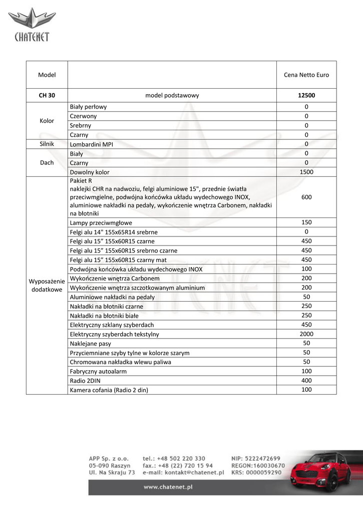 Model CH 30 Cena Netto Euro model podstawowy Biały perłowy Czerwony Kolor Srebrny Czarny Silnik Lombardini MPI Biały Dach Czarny Dowolny kolor Pakiet R naklejki CHR na nadwoziu, felgi aluminiowe 15", przednie światła przeciwmgielne, podwójna końcówka układu wydechowego INOX, aluminiowe nakładki na pedały, wykończenie wnętrza Carbonem, nakładki na błotniki Lampy przeciwmgłowe Felgi alu 14" 155x65R14 srebrne Felgi alu 15” 155x60R15 czarne Felgi alu 15” 155x60R15 srebrno czarne Felgi alu 15” 155x60R15 czarny mat Podwójna końcówka układu wydechowego INOX Wyposażenie Wykończenie wnętrza Carbonem dodatkowe Wykończenie wnętrza szczotkowanym aluminium Aluminiowe nakładki na pedały Nakładki na błotniki czarne Nakładki na błotniki białe Elektryczny szklany szyberdach Elektryczny szyberdach tekstylny Naklejane pasy Przyciemniane szyby tylne w kolorze szarym Chromowana nakładka wlewu paliwa Fabryczny autoalarm Radio 2DIN Kamera cofania (Radio 2 din) 12500 0 0 0 0 0 0 0 1500 600 150 0 450 450 450 100 200 200 50 250 250 450 2000 50 50 50 100 400 100