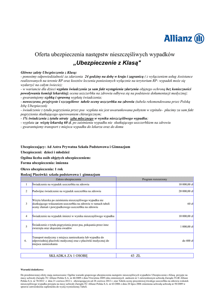 Oferta ubezpieczenia następstw nieszczęśliwych wypadków „Ubezpieczenie z Klasą" Główne zalety Ubezpieczenia z Klasą: - ponosimy odpowiedzialność za zdarzenia 24 godziny na dobę w kraju i zagranicą ( z wyłączeniem usług Assistance realizowanych na terenie RP oraz kosztów leczenia poniesionych wyłącznie na terytorium RP- wypadek może się wydarzyć na całym świecie); - w wariancie dla dzieci wypłata świadczenia za sam fakt wystąpienia zdarzenia objętego ochroną bez konieczności powoływania komisji lekarskiej; ocena uszczerbku na zdrowiu odbywa się na podstawie dokumentacji medycznej; - gwarantujemy szybką i sprawną wypłatę świadczenia; - nowoczesne, przejrzyste i szczegółowe tabele oceny uszczerbku na zdrowiu (tabela rekomendowana przez Polską Izbę Ubezpieczeń) - świadczenie z tytułu pogryzienia przez psa wypłata nie jest uwarunkowana pobytem w szpitalu- płacimy za sam fakt pogryzienia skutkującego operowaniem chirurgicznym; - 1% świadczenia z tytułu utraty zęba mlecznego w wyniku nieszczęśliwego wypadku; - wypłata za wizytę lekarską 60 zł, po zaistnieniu wypadku nie skutkującego uszczerbkiem na zdrowiu - gwarantujemy transport z miejsca wypadku do lekarza oraz do domu Ubezpieczający: Ad Astra Prywatna Szkoła Podstawowa i Gimnazjum Ubezpieczeni: dzieci i młodzież Ogólna liczba osób objętych ubezpieczeniem: Forma ubezpieczenia: imienna Okres ubezpieczenia: 1 rok Rodzaj Placówki: szkoła podstawowa i gimnazjum Zakres ubezpieczenia Program rozszerzony 1 Świadczenie na wypadek uszczerbku na zdrowiu 10 000,00 zł 2 Podwójne świadczenie na wypadek uszczerbku na zdrowiu 20 000,00 zł 3 Wizyta lekarska po zaistnieniu nieszczęśliwego wypadku nie skutkującego wskazaniem uszczerbku na zdrowiu w ramach tabeli oceny złamań i powypadkowego uszczerbku na zdrowiu 4 Świadczenie na wypadek śmierci w wyniku nieszczęśliwego wypadku 5 Świadczenie z tytułu pogryzienia przez psa, pokąsania przez inne zwierzęta oraz ukąszenia owadów 1 000,00 zł 6. Transport medyczny z miejsca zamieszkania lub wypadku do odpowiedniej placówki medycznej oraz z placówki medycznej do miejsca zamieszkania do 400 zł SKŁADKA ZA 1 OSOBĘ 60 zł 10 000,00 zł 43 ZŁ Warunki dodatkowe: Do przedstawionej oferty mają zastosowanie: Ogólne warunki grupowego ubezpieczenia następstw nieszczęśliwych wypadków Ubezpieczenie z Klasą przyjęte na mocy uchwały Zarządu TU Allianz Polska S.A. nr 46/2009 z dnia 9 kwietnia 2009 roku zmienionych aneksem nr 1 zatwierdzonym uchwałą Zarządu TUiR Allianz Polska S.A. nr 78/2012 z dnia 21 czerwca 2012 r. obowiązującym od 28 czerwca 2012 r. oraz Tabela oceny procentowej trwałego uszczerbku na zdrowiu wskutek nieszczęśliwego wypadku przyjęta na mocy uchwały Zarządu TU Allianz Polska S.A. nr 63/2006 z dnia 28 lipca 2006 zmieniona uchwałą uchwałą nr 50/2009 w sprawie zatwierdzenia suplementu do wyżej wymienionej Tabeli. KONTAKT Renata KASPRZYKOWSKA 606 300 890 Oferta ubezpieczenia następstw nieszczęśliwych wypadków „Ubezpieczenie z Klasą" Główne zalety Ubezpieczenia z Klasą: - ponosimy odpowiedzialność za zdarzenia 24 godziny na dobę w kraju i zagranicą ( z wyłączeniem usług Assistance realizowanych na terenie RP oraz kosztów leczenia poniesionych wyłącznie na terytorium RP- wypadek może się wydarzyć na całym świecie); - w wariancie dla dzieci wypłata świadczenia za sam fakt wystąpienia zdarzenia objętego ochroną bez konieczności powoływania komisji lekarskiej; ocena uszczerbku na zdrowiu odbywa się na podstawie dokumentacji medycznej; - gwarantujemy szybką i sprawną wypłatę świadczenia; - nowoczesne, przejrzyste i szczegółowe tabele oceny uszczerbku na zdrowiu (tabela rekomendowana przez Polską Izbę Ubezpieczeń) - świadczenie z tytułu pogryzienia przez psa wypłata nie jest uwarunkowana pobytem w szpitalu- płacimy za sam fakt pogryzienia skutkującego operowaniem chirurgicznym; - 1% świadczenia z tytułu utraty zęba mlecznego w wyniku nieszczęśliwego wypadku; - wypłata za wizytę lekarską 60 zł, po zaistnieniu wypadku nie skutkującego uszczerbkiem na zdrowiu - gwarantujemy transport z miejsca wypadku do lekarza oraz do domu Ubezpieczający: Ad Astra Prywatna Szkoła Podstawowa i Gimnazjum Ubezpieczeni: dzieci i młodzież Ogólna liczba osób objętych ubezpieczeniem: Forma ubezpieczenia: imienna Okres ubezpieczenia: 1 rok Rodzaj Placówki: szkoła podstawowa i gimnazjum Zakres ubezpieczenia Program rozszerzony 1 Świadczenie na wypadek uszczerbku na zdrowiu 10 000,00 zł 2 Podwójne świadczenie na wypadek uszczerbku na zdrowiu 20 000,00 zł 3 Wizyta lekarska po zaistnieniu nieszczęśliwego wypadku nie skutkującego wskazaniem uszczerbku na zdrowiu w ramach tabeli oceny złamań i powypadkowego uszczerbku na zdrowiu 4 Świadczenie na wypadek śmierci w wyniku nieszczęśliwego wypadku 5 Świadczenie z tytułu pogryzienia przez psa, pokąsania przez inne zwierzęta oraz ukąszenia owadów 1 000,00 zł 6. Zasiłek szpitalny w wyniku nieszczęśliwego wypadku ( świadczenie za każdy dzień pobytu w szpitalu) 20 zł 7. Zasiłek szpitalny w wyniku zatrucia ( świadczenie za każdy dzień pobytu) 20zł 60 zł 10 000,00 zł 8. Poważne zachorowania; nowotwory złośliwe z białaczkami i chłoniakami , krańcowa niewydolność nerek, zapalenie mózgu, schyłkowa niewydolność wątroby, cukrzyca,dystrofia nerkowa, guzy śródczaszkowe, śpiączka, posocznica( sepsa) , przeszczep. 9. Transport medyczny z miejsca zamieszkania lub wypadku do odpowiedniej placówki medycznej oraz z placówki medycznej do miejsca zamieszkania 5000zł do 400 zł Świadczenia opiekuńcze: 1 wizyta pielęgniarki w miejscu pobytu Ubezpieczonego 2 dostarczenie do miejsca pobytu Ubezpieczonego leków przepisanych przez lekarza 3 organizacja w miejscu zamieszkania dzieci i młodzieży szkolnej prywatnych lekcji w przypadku przebywania Ubezpieczonego na zwolnieniu lekarskim powyżej 7 d