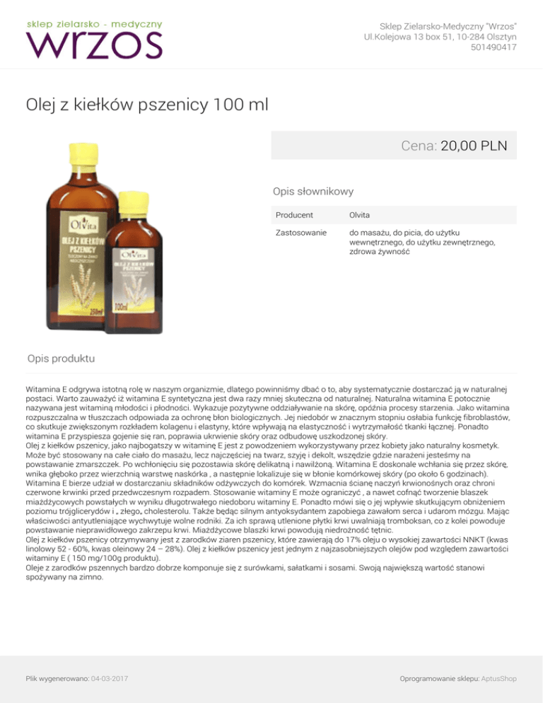 Sklep Zielarsko-Medyczny "Wrzos" Ul.Kolejowa 13 box 51, 10-284 Olsztyn 501490417 Olej z kiełków pszenicy 100 ml Cena: 20,00 PLN Opis słownikowy Producent Olvita Zastosowanie do masażu, do picia, do użytku wewnętrznego, do użytku zewnętrznego, zdrowa żywność Opis produktu Witamina E odgrywa istotną rolę w naszym organizmie, dlatego powinniśmy dbać o to, aby systematycznie dostarczać ją w naturalnej postaci. Warto zauważyć iż witamina E syntetyczna jest dwa razy mniej skuteczna od naturalnej. Naturalna witamina E potocznie nazywana jest witaminą młodości i płodności. Wykazuje pozytywne oddziaływanie na skórę, opóźnia procesy starzenia. Jako witamina rozpuszczalna w tłuszczach odpowiada za ochronę błon biologicznych. Jej niedobór w znacznym stopniu osłabia funkcję fibroblastów, co skutkuje zwiększonym rozkładem kolagenu i elastyny, które wpływają na elastyczność i wytrzymałość tkanki łącznej. Ponadto witamina E przyspiesza gojenie się ran, poprawia ukrwienie skóry oraz odbudowę uszkodzonej skóry. Olej z kiełków pszenicy, jako najbogatszy w witaminę E jest z powodzeniem wykorzystywany przez kobiety jako naturalny kosmetyk. Może być stosowany na całe ciało do masażu, lecz najczęściej na twarz, szyję i dekolt, wszędzie gdzie narażeni jesteśmy na powstawanie zmarszczek. Po wchłonięciu się pozostawia skórę delikatną i nawilżoną. Witamina E doskonale wchłania się przez skórę, wnika głęboko przez wierzchnią warstwę naskórka , a następnie lokalizuje się w błonie komórkowej skóry (po około 6 godzinach). Witamina E bierze udział w dostarczaniu składników odżywczych do komórek. Wzmacnia ścianę naczyń krwionośnych oraz chroni czerwone krwinki przed przedwczesnym rozpadem. Stosowanie witaminy E może ograniczyć , a nawet cofnąć tworzenie blaszek miażdżycowych powstałych w wyniku długotrwałego niedoboru witaminy E. Ponadto mówi się o jej wpływie skutkującym obniżeniem poziomu trójglicerydów i „ złego„ cholesterolu. Także będąc silnym antyoksydantem zapobiega zawałom serca i udarom mózgu. Mając właściwości antyutleniające wychwytuje wolne rodniki. Za ich sprawą utlenione płytki krwi uwalniają tromboksan, co z kolei powoduje powstawanie nieprawidłowego zakrzepu krwi. Miażdżycowe blaszki krwi powodują niedrożność tętnic. Olej z kiełków pszenicy otrzymywany jest z zarodków ziaren pszenicy, które zawierają do 17% oleju o wysokiej zawartości NNKT (kwas linolowy 52 - 60%, kwas oleinowy 24 – 28%). Olej z kiełków pszenicy jest jednym z najzasobniejszych olejów pod względem zawartości witaminy E ( 150 mg/100g produktu). Oleje z zarodków pszennych bardzo dobrze komponuje się z surówkami, sałatkami i sosami. Swoją największą wartość stanowi spożywany na zimno. Plik wygenerowano: 04-03-2017 Powered by TCPDF (www.tcpdf.org) Oprogramowanie sklepu: AptusShop