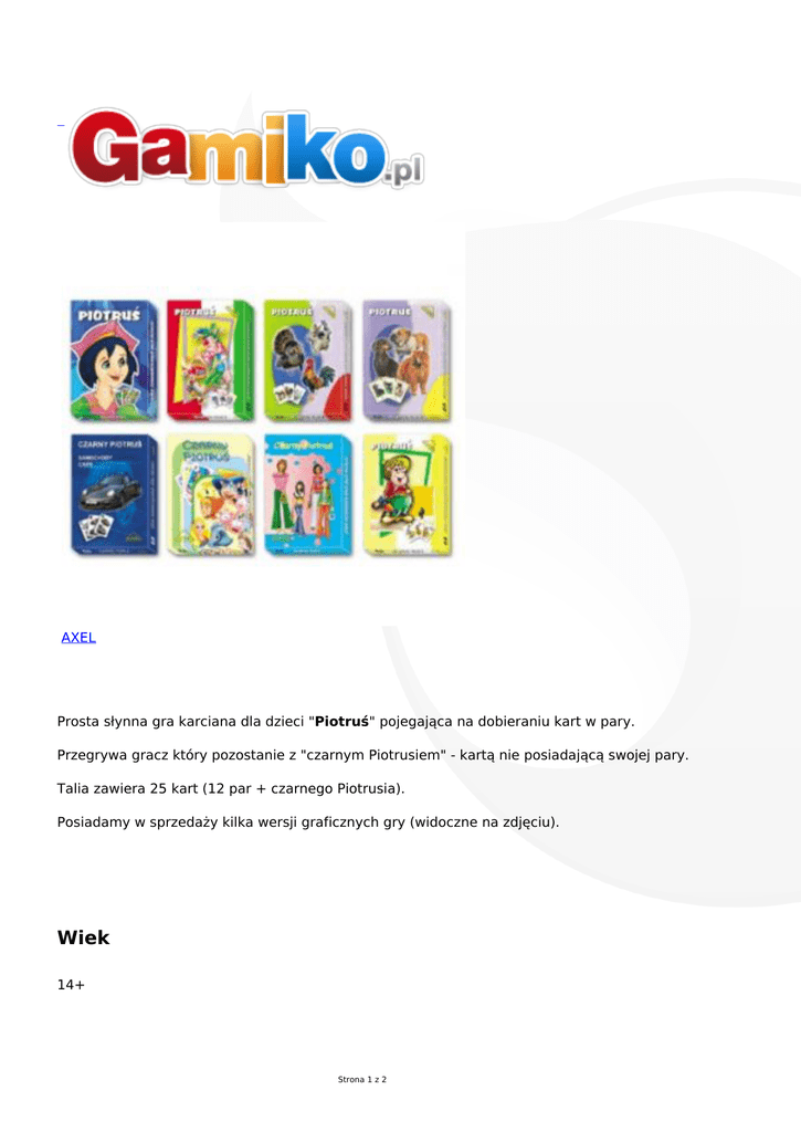 AXEL Prosta słynna gra karciana dla dzieci "Piotruś" pojegająca na dobieraniu kart w pary. Przegrywa gracz który pozostanie z "czarnym Piotrusiem" - kartą nie posiadającą swojej pary. Talia zawiera 25 kart (12 par + czarnego Piotrusia). Posiadamy w sprzedaży kilka wersji graficznych gry (widoczne na zdjęciu). Wiek 14+ Strona 1 z 2 Liczba graczy 2-5 graczy Instrukcja polska Wydanie polskie Producent AXEL Strona 2 z 2