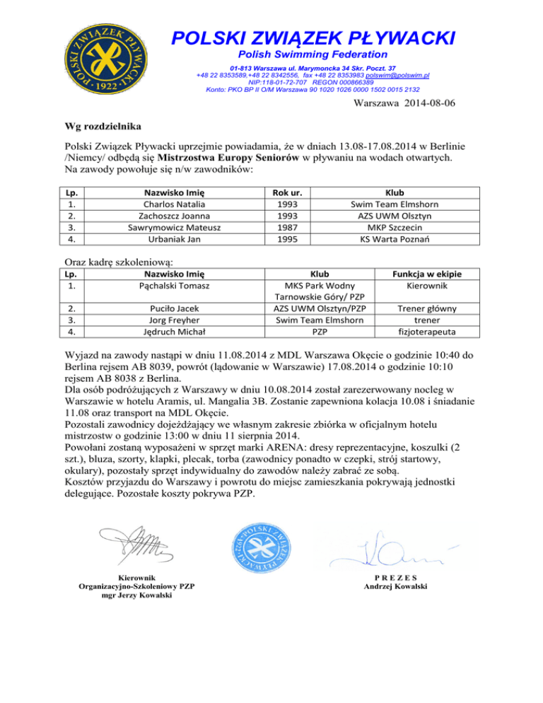 POLSKI ZWIĄZEK PŁYWACKI Polish Swimming Federation 01-813 Warszawa ul. Marymoncka 34 Skr. Poczt. 37 +48 22 8353589,+48 22 8342556, fax +48 22 8353983 [email protected] NIP:118-01-72-707 REGON 000866389 Konto: PKO BP II O/M Warszawa 90 1020 1026 0000 1502 0015 2132 Warszawa 2014-08-06 Wg rozdzielnika Polski Związek Pływacki uprzejmie powiadamia, że w dniach 13.08-17.08.2014 w Berlinie /Niemcy/ odbędą się Mistrzostwa Europy Seniorów w pływaniu na wodach otwartych. Na zawody powołuje się n/w zawodników: Lp. 1. 2. 3. 4. Nazwisko Imię Charlos Natalia Zachoszcz Joanna Sawrymowicz Mateusz Urbaniak Jan Rok ur. 1993 1993 1987 1995 Klub Swim Team Elmshorn AZS UWM Olsztyn MKP Szczecin KS Warta Poznań Oraz kadrę szkoleniową: Lp. 1. Nazwisko Imię Pąchalski Tomasz 2. 3. 4. Puciło Jacek Jorg Freyher Jędruch Michał Klub MKS Park Wodny Tarnowskie Góry/ PZP AZS UWM Olsztyn/PZP Swim Team Elmshorn PZP Funkcja w ekipie Kierownik Trener główny trener fizjoterapeuta Wyjazd na zawody nastąpi w dniu 11.08.2014 z MDL Warszawa Okęcie o godzinie 10:40 do Berlina rejsem AB 8039, powrót (lądowanie w Warszawie) 17.08.2014 o godzinie 10:10 rejsem AB 8038 z Berlina. Dla osób podróżujących z Warszawy w dniu 10.08.2014 został zarezerwowany nocleg w Warszawie w hotelu Aramis, ul. Mangalia 3B. Zostanie zapewniona kolacja 10.08 i śniadanie 11.08 oraz transport na MDL Okęcie. Pozostali zawodnicy dojeżdżający we własnym zakresie zbiórka w oficjalnym hotelu mistrzostw o godzinie 13:00 w dniu 11 sierpnia 2014. Powołani zostaną wyposażeni w sprzęt marki ARENA: dresy reprezentacyjne, koszulki (2 szt.), bluza, szorty, klapki, plecak, torba (zawodnicy ponadto w czepki, strój startowy, okulary), pozostały sprzęt indywidualny do zawodów należy zabrać ze sobą. Kosztów przyjazdu do Warszawy i powrotu do miejsc zamieszkania pokrywają jednostki delegujące. Pozostałe koszty pokrywa PZP. Kierownik Organizacyjno-Szkoleniowy PZP mgr Jerzy Kowalski PREZES Andrzej Kowalski