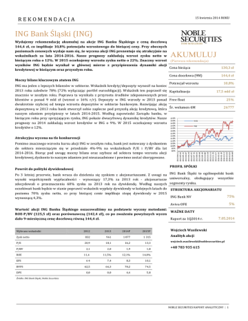 15 kwietnia 2014 ROKU REKOMENDACJA ING Bank Śląski (ING) Wydajemy rekomendację akumuluj na akcje ING Banku Śląskiego z ceną docelową 144,4 zł, co implikuje 10,8% potencjału wzrostowego do bieżącej ceny. Przy obecnych poziomach cenowych wydaje nam się, że wycena akcji ING prezentuje się atrakcyjnie na wskaźnikach za lata 2014-2016. Nasze prognozy zakładają wzrost zysku netto w bieżącym roku o 12%. W 2015 oczekujemy wzrostu zysku netto o 22%. Znaczny wzrost (Pierwsza rekomendacja) wyników ING będzie wynikał w głównej mierze z przyśpieszenia dynamiki akcji Cena bieżąca kredytowej w bieżącym oraz przyszłym roku. AKUMULUJ Cena docelowa (9M) 130,3 zł 144,4 zł Mocny bilans kluczowym atutem ING Potencjał wzrostu ING ma jeden z lepszych bilansów w sektorze. Wskaźnik kredyty/depozyty wynosił na koniec 2013 roku zaledwie 78% (72% wyłączając portfel euroobligacji). Wskaźnik ten poprawił się Kapitalizacja znacznie w zeszłym roku. Poprawa ta wynikała z przyrostu środków zdeponowanych przez klientów o ponad 9 mld zł (wzrost o 16% r/r). Depozyty w ING wzrosły w 2013 ponad Free float dwukrotnie szybciej od tempa wzrostu depozytów w sektorze bankowym. Rozwijając akcję depozytową w 2013 roku bank stworzył sobie zaplecze pod przyszłą akcję kredytową, która Śr. wolumen 6M naszym zdaniem przyśpieszy w latach 2014-2015. Według zapowiedzi Zarządu banku, w bieżącym roku przy sprzyjającym rynku, ING pokaże dwucyfrową dynamikę kredytów. Nasze prognozy na 2014 zakładają wzrost kredytów w ING o 9%. W 2015 oczekujemy wzrostu kredytów o 12%. 10,8% 17,5 mld zł 25% 26777 Atrakcyjna wycena na tle konkurencji Pomimo znacznego wzrostu kursu akcji ING w zeszłym roku, bank jest notowany z dyskontem do sektora mieszczącym się w przedziale 4%-9% na wskaźnikach P/E i P/BV dla lat 2014-2016. Biorąc pod uwagę mocny bilans oraz szybsze od sektora tempo wzrostu akcji kredytowej, dyskonto to naszym zdaniem jest nieuzasadnione i powinno zostać skorygowane. PROFIL SPÓŁKI Powrót do polityki dywidendowej Po 3 letniej przerwie, bank wraca do dzielenia się zyskiem z akcjonariuszami. Z uwagi na wysoki współczynnik wypłacalności - wynoszący 17,3% za 2013 rok - akcjonariusze zdecydowali o przeznaczeniu 60% zysku za 2013 rok na dywidendę. Według naszych oczekiwań bank będzie w stanie poprawić wskaźnik wypłaty dywidendy w kolejnych latach do poziomu 70% zysku netto, co przy bieżącej cenie implikuje stopę dywidendy w 2015 wynoszącą 4,3%. ING Bank Śląski to ogólnopolski bank uniwersalny, obsługujący wszystkie segmenty rynku. STRUKTURA AKCJONARIATU 75% ING Bank NV 5% Aviva OFE Wartość akcji ING Banku Śląskiego oszacowaliśmy na podstawie wyceny metodami: WAŻNE DATY ROE-P/BV (125,5 zł) oraz porównawczą (142,4 zł), co po zważeniu powyższych wycen dało 9-miesięczną cenę docelową równą 144,4 zł. Raport za 1Q2014 r. Wybrane wskaźniki 2012 2013 2014P 2015P Zysk netto 832 961 1 077 1 315 P/E 20,9 18,1 16,2 13,3 2,1 2,0 1,9 1,8 ROE 11,4 11,5% 12,1% 14,0% EPS 64 7,4 8,3 10,1 BVPS 62,5 66,3 70,2 74,5 DPS 0,0 0,0 4,4 5,8 P/BV 7.05.2014 Wojciech Wasilewski Analityk akcji [email protected] +48 783 935 615 Źródło: ING Bank Sląski, Noble Securities NOBLE SECURITIES RAPORT ANALITYCZNY | 1 REKOMENDACJA OBJAŚNIENIE TERMINOLOGII FACHOWEJ W TEGO TYPU RAPORTACH, OPRACOWANIACH I REKOMENDACJACH PRZEKAZYWANYCH PRZEZ NOBLE SECURITIES S.A. BV – wartość księgowa EV – wycena rynkowa spółki powiększona o wartość długu odsetkowego netto EBIT – zysk operacyjny NOPAT – zysk operacyjny pomniejszony o hipotetyczny podatek od tego zysku EBITDA – zysk operacyjny powiększony o amortyzację EPS – zysk netto przypadający na 1 akcję DPS – dywidenda przypadająca na 1 akcję P/E – stosunek ceny akcji do zysku netto przypadającego na 1 akcję P/EBIT – stosunek ceny akcji do zysku operacyjnego przypadającego na 1 akcję P/EBITDA – stosunek ceny akcji do zysku operacyjnego powiększonego o amortyzację przypadającą na 1 akcję P/BV – stosunek ceny akcji do wartości księgowej przypadającej na 1 akcję MC/S – stosunek kapitalizacji spółki do przychodów spółki EV/EBIT – stosunek wyceny rynkowej spółki powiększonej o dług netto do zysku operacyjnego EV/EBITDA – stosunek wyceny rynkowej spółki powiększonej o dług netto do zysku operacyjnego powiększonego o amortyzację ROE – stopa zwrotu z kapitału własnego ROA – stopa zwrotu z aktywów WACC – średni ważony koszt kapitału FCFF – wolne przepływy pieniężne dla właścicieli kapitału własnego i wierzycieli Beta – współczynnik uwzględniający zależność zmiany ceny akcji danej spółki od zmiany wartości indeksu CAGR – jest to średni wskaźnik rocznego wzrostu w badanym okresie, przy założeniu, że roczne wzrosty są dodawane do wartości bazy następnego okresu. SG&A – suma kosztów ogólnego zarządu i sprzedaży PODSTAWOWE ZASADY WYDAWANIA RAPORTÓW ANALITYCZNYCH Niniejszy raport analityczny, zwany dalej „Raportem”, wyraża wyłącznie wiedzę oraz poglądy autora (autorów) Raportu, według stanu na dzień jego sporządzenia. Podstawą do opracowania Raportu były wszelkie publicznie dostępne informacje znane jego autorowi (autorom) na dzień sporządzenia Raportu, w szczególności informacje przekazane przez Emitenta w raportach bieżących i okresowych sporządzanych w ramach wykonywania obowiązków informacyjnych. Przedstawione w Raporcie prognozy oraz elementy ocenne, jak również zalecenia i sugestie zachowań inwestycyjnych, oparte są wyłącznie o analizę przeprowadzoną przez autora (autorów) rekomendacji, bez uzgodnień z Emitentem ani z innymi podmiotami i opierają się na szeregu założeń, które w przyszłości mogą okazać się nietrafne. Noble Securities S.A. ani autor (autorzy) Raportu nie udzielają żadnego zapewnienia, że podane prognozy sprawdzą się. Raport ma charakter jednorazowy, al
