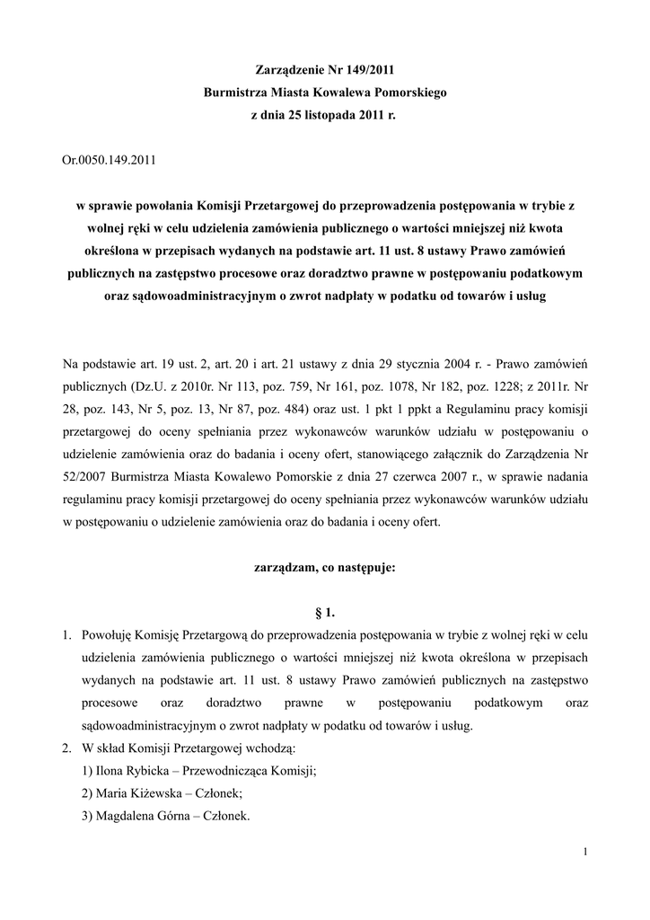Zarządzenie Nr 149/2011 Burmistrza Miasta Kowalewa