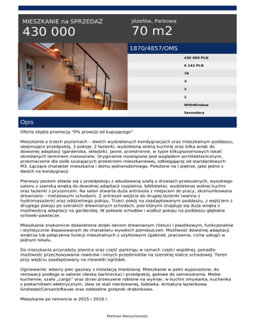 Józefów, Parkowa MIESZKANIE na SPRZEDAŻ 70 m2 430 000 1870/4857/OMS 430 000 PLN 6 143 PLN 70 3 1 1 WithWindow Secondary Opis Oferta objęta promocją "0% prowizji od kupującego" Mieszkanie o trzech poziomach – dwóch wydzielonych kondygnacjach oraz mieszkalnym poddaszu, obejmujące przedpokój, 3 pokoje, 2 łazienki, wydzieloną widną kuchnię oraz kilka wnęk do dowolnej adaptacji (garderoba, składzik). Jasne, przestronne, w typie kilkupoziomowych lokali określanych terminem maissonete. Oryginalnie rozwiązane pod względem architektonicznym, przeznaczone dla osób szukających przestrzeni mieszkaniowej, odbiegającej od standardowych M3. Łączące charakter mieszkania i domu jednorodzinnego. Położone na I piętrze, jako jedno z dwóch na kondygnacji. Pierwszy poziom składa się z przedpokoju z wbudowaną szafą o drzwiach przesuwnych, wysokiego salonu z szeroką wnęką do dowolnej adaptacji (sypialnia, biblioteka), wydzielonej widnej kuchni oraz łazienki z prysznicem. Na salon otwarta duża antresola z miejscem do pracy, skomunikowana drewniano – metalowymi schodami. Z antresoli wejście do drugiej łazienki (wanna z hydromasażem) oraz oddzielnego pokoju. Trzeci pokój na zaadaptowanym poddaszu, z wejściem z drugiego pokoju po szerokich drewnianych schodach, pod którymi znajduje się duża wnęka z możliwością adaptacji na garderobę. W połowie schodów i wzdłuż pokoju na poddaszu głębokie schowki-pawlacze. Mieszkanie znakomicie doświetlone dzięki oknom drewnianym (Velux) i plastikowym, funkcjonalnie i stylistycznie dopasowanym do charakteru wysokich pomieszczeń. Możliwość dowolnej adaptacji wnętrza lub połączenia funkcji mieszkalnych z użytkowymi (gabinet, pracownia, ciche usługi) w jednym lokalu. Do mieszkania przynależy piwnica oraz część parkingu w ramach części wspólnej, ponadto możliwość przechowywania rowerów i innych przedmiotów na szerokiej klatce schodowej. Teren przy wejściu zaadaptowany na niewielki ogródek. Ogrzewanie: własny piec gazowy z instalacją miedzianą. Mieszkanie w pełni wyposażone, do renowacji podłoga w salonie (deska barlinecka) i przedpokój, gotowe do zamieszkania. Meble kuchenne, szafa „cargo” oraz drzwi przesuwne robione na wymiar, w kuchni zmywarka, kuchenka z piekarnikiem elektrycznym, zlew ze stali nierdzewnej, lodówka. Armatura łazienkowa Grohedal/Cersanit/Ravak oraz oddzielne grzejniki drabinkowe. Mieszkanie po remoncie w 2015 i 2016 r. Portman Nieruchomości Wymiary pomieszczeń po obrysie podłogi, w nawiasach powierzchnia użytkowa pow. 1,80 m. wys. 1. przedpokój 3,84 m2 (3,84 m2) 2. salon 18,03 m2 (22,34 m2) 3. kuchnia 5,87 m2 (6,83 m2) 4. łazienka 3,71 m2 (3,71 m2) 5. antresola 6,02 m2 (7,00 m2) 6. łazienka 2,72 m2 (2,72 m2) 7. pokój 11,41 m2 (17,57 m2) 8. pokój 6,21 m2 (6,21 m2) Razem 57,81 m2 (70,222) Piwnica 5,20 m2 (5,20 m2) Koszty stałe (zaliczka na wodę, fundusz remontowy, zarządzanie wspólnotą) – 400 zł/mies. Budynek po remoncie dachu i elewacji w 2016 roku, znajdujący się w centralnej części Józefowa. W bezpośrednim sąsiedztwie Urząd Miejski, komisariat policji, ośrodek zdrowia, sklepy, restauracje, usługi, przedszkole państwowe, szkoła. Do przystanku autobusowego i kolejowego 5 minut dogodny dojazd do centrum Warszawy. W okolicy rzeka Świder, Wisła, lasy i tereny Mazowieckiego Parku Krajobrazowego. Gorąco polecam i serdecznie zapraszam do oglądania. Łukasz Trzaskowski Portman Nieruchomości tel. 510 445 018 [email protected] Łukasz Trzaskowski tel. 510 445 018 email: [email protected] Portman Nieruchomości Powered by TCPDF (www.tcpdf.org)