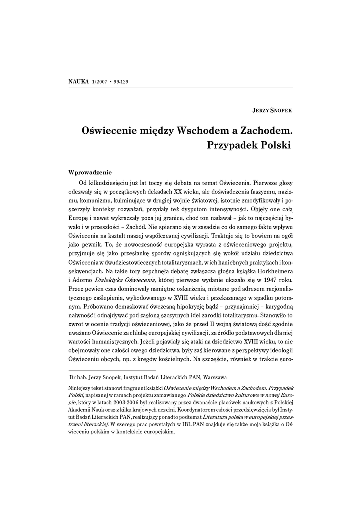 NAUKA 1/2007 • 99-129 JERZY SNOPEK Oświecenie między Wschodem a Zachodem. Przypadek Polski Wprowadzenie Od kilkudziesięciu już lat toczy się debata na temat Oświecenia. Pierwsze głosy odezwały się w początkowych dekadach XX wieku, ale doświadczenia faszyzmu, nazizmu, komunizmu, kulminujące w drugiej wojnie światowej, istotnie zmodyfikowały i poszerzyły kontekst rozważań, przydały też dysputom intensywności. Objęły one całą Europę i nawet wykraczały poza jej granice, choć ton nadawał – jak to najczęściej bywało i w przeszłości – Zachód. Nie spierano się w zasadzie co do samego faktu wpływu Oświecenia na kształt naszej współczesnej cywilizacji. Traktuje się to bowiem na ogół jako pewnik. To, że nowoczesność europejska wyrasta z oświeceniowego projektu, przyjmuje się jako przesłankę sporów ogniskujących się wokół udziału dziedzictwa Oświecenia w dwudziestowiecznych totalitaryzmach, w ich haniebnych praktykach i konsekwencjach. Na takie tory zepchnęła debatę zwłaszcza głośna książka Horkheimera i Adorno Dialektyka Oświecenia, której pierwsze wydanie ukazało się w 1947 roku. Przez pewien czas dominowały namiętne oskarżenia, miotane pod adresem racjonalistycznego zaślepienia, wyhodowanego w XVIII wieku i przekazanego w spadku potomnym. Próbowano demaskować ówczesną hipokryzję bądź – przynajmniej – karygodną naiwność i odnajdywać pod zasłoną szczytnych idei zarodki totalitaryzmu. Stanowiło to zwrot w ocenie tradycji oświeceniowej, jako że przed II wojną światową dość zgodnie uważano Oświecenie za chlubę europejskiej cywilizacji, za źródło podstawowych dla niej wartości humanistycznych. Jeżeli pojawiały się ataki na dziedzictwo XVIII wieku, to nie obejmowały one całości owego dziedzictwa, były zaś kierowane z perspektywy ideologii Oświeceniu obcych, np. z kręgów kościelnych. Na szczęście, również w trakcie suroDr hab. Jerzy Snopek, Instytut Badań Literackich PAN, Warszawa Niniejszy tekst stanowi fragment książki Oświecenie między Wschodem a Zachodem. Przypadek Polski, napisanej w ramach projektu zamawianego Polskie dziedzictwo kulturowe w nowej Europie, który w latach 2003-2006 był realizowany przez dwanaście placówek naukowych z Polskiej Akademii Nauk oraz z kilku krajowych uczelni. Koordynatorem całości przedsięwzięcia był Instytut Badań Literackich PAN, realizujący ponadto podtemat Literatura polska w europejskiej przestrzeni literackiej. W szeregu prac powstałych w IBL PAN znajduje się także moja książka o Oświeceniu polskim w kontekście europejskim. 100 Jerzy Snopek wego sądu nad Oświeceniem, który dokonywał się w minionym półwieczu, zaczęły z wolna liczyć się – dzięki autorytetowi takich myślicieli jak Foucault i Habermas – opinie bardziej wyważone, wskazujące zarówno ciemne, jak i jasne strony Oświecenia. Spór o Oświecenie znalazł osobliwy finał w sporze o konstytucję europejską. Zachód nie zawahał się wskazać w niej dziedzictwa oświeceniowego jako wspólnego dobra kontynentu, kwestionując zarazem potrzebę odwoływania się do wartości chrześcijańskich. Pogląd, iż Oświecenie stanowi punkt przesilenia w dziejach naszej cywilizacji, że otwiera drogę ku nowoczesności, w jakiej dzisiaj funkcjonujemy, nie jest już raczej podważany. Przyjmuje się zarazem, że jest ono swoistą wizytówką Europy. Wyznaczywszy specyficzny dla niej kierunek rozwoju, oparłszy go na podstawach ugruntowanych w takich ideach i wartościach, jak liberalizm, kapitalizm, sekularyzacja, racjonalizm, demokratyzm, humanizm, kosmopolityzm, europocentryzm etc., określiło tym samym europejską tożsamość kulturową. Utwierdziwszy się w niej, Europa cywilizacyjna (włączając jej mutacje zaoceaniczne, Australię i przede wszystkim Amerykę Północną) stara się narzucać wzory i idee o rodowodzie oświeceniowym całemu światu. Napotyka to w wielu miejscach opór, przede wszystkim w świecie islamu. Opór świata muzułmańskiego, niekiedy gwałtowny, aczkolwiek jest artykułowany w sferze ideologii splecionej z religią, zwraca się nie tyle przeciw chrześcijaństwu, ile przeciwko zsekularyzowanemu, neopogańskiemu ładowi postoświeceniowemu. Tak więc ów konflikt dwóch światów czy – jak to określają niektórzy historycy – dwóch cywilizacji, towarzyszący dziejom Europy od średniowiecza i szczególnie dotykający jej wschodnich rubieży, przekształcił się z kontrowersji stricte religijnej w starcie kulturowe. Stoją naprzeciw siebie dwa różne modele społeczeństwa, dwie odmienne hierarchie wartości, nieprzystające do siebie światopoglądy i style życia. Tyle że koncepcja wschodnia wciąż jest determinowana przez doktrynę i tradycję religijną, podczas gdy zachodnia – przez dziedzictwo Oświecenia. To właśnie ideały oświeceniowe wydają się w swej europejskiej postaci nieprzyswajalne przez świat islamu. Znajdujemy wśród nich cały pakiet idei wolnościowych od wolności myśli i słowa, wolności ciała, wolności i równości społecznej, prawa człowieka i prawa narodów etc. Nie do przyjęcia okazuje się również autonomiczna – oddzielona od religii – etyka, świecka koncepcja tolerancji wykraczająca poza sferę zjawisk religijnych i obejmująca rozmaite wymiary inności. Podobnie rzecz się ma z charakterystycznym dla tradycji oświeceniowej duchem swobodnej krytyki, łączącym się zresztą z wolnością myśli i słowa, nie respektującym obszarów tabu. Jak wiadomo, także chrześcijaństwo stawiało długotrwały opór przynajmniej niektórym spośród wymienionych wyżej idei, zwłaszcza w ich radykalnej wersji. Po batalii, która rozpoczęła się u schyłku renesansu, obfitującej zarówno we frontalne starcia (to już w czasach Oświecenia), jak w potyczki podjazdowe, chrześcijaństwo nękane przez libertynów, napierane przez filozofów i rewolucjonistów, osłabione