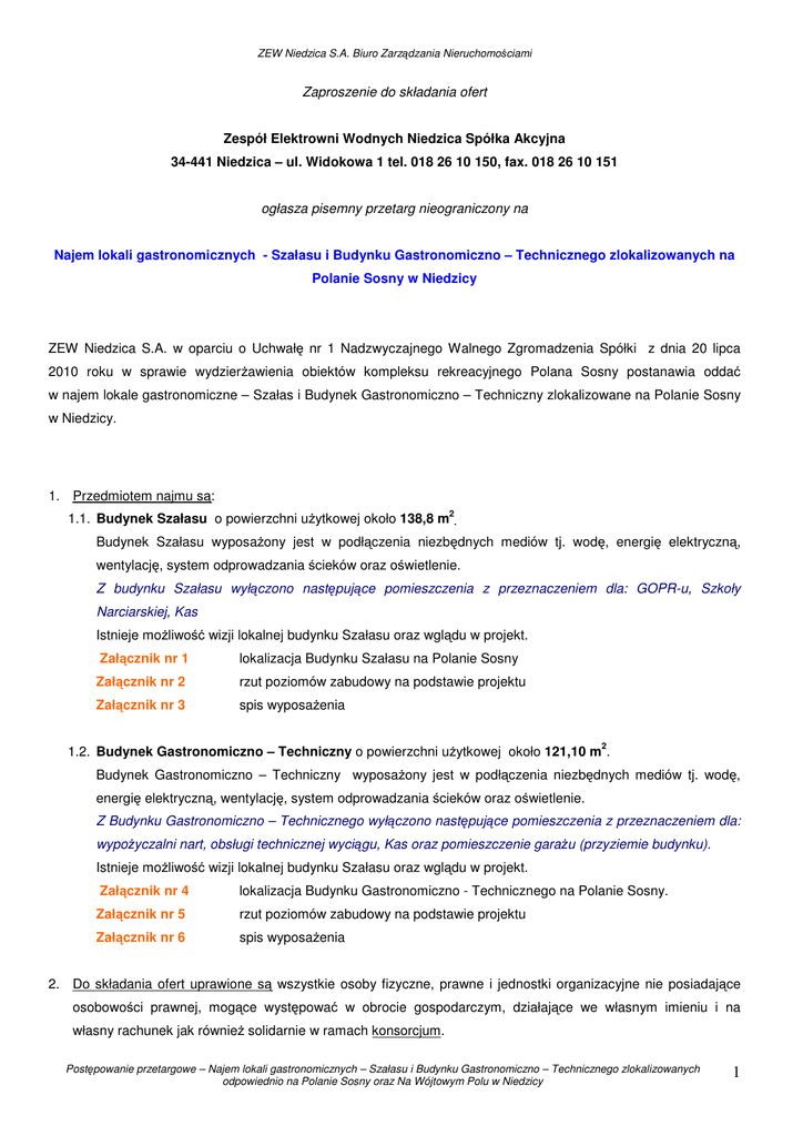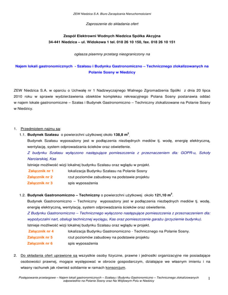 ZEW Niedzica S.A. Biuro Zarządzania Nieruchomościami Zaproszenie do składania ofert Zespół Elektrowni Wodnych Niedzica Spółka Akcyjna 34-441 Niedzica – ul. Widokowa 1 tel. 018 26 10 150, fax. 018 26 10 151 ogłasza pisemny przetarg nieograniczony na Najem lokali gastronomicznych - Szałasu i Budynku Gastronomiczno – Technicznego zlokalizowanych na Polanie Sosny w Niedzicy ZEW Niedzica S.A. w oparciu o Uchwałę nr 1 Nadzwyczajnego Walnego Zgromadzenia Spółki z dnia 20 lipca 2010 roku w sprawie wydzierżawienia obiektów kompleksu rekreacyjnego Polana Sosny postanawia oddać w najem lokale gastronomiczne – Szałas i Budynek Gastronomiczno – Techniczny zlokalizowane na Polanie Sosny w Niedzicy. 1. Przedmiotem najmu są: 1.1. Budynek Szałasu o powierzchni użytkowej około 138,8 m 2 . Budynek Szałasu wyposażony jest w podłączenia niezbędnych mediów tj. wodę, energię elektryczną, wentylację, system odprowadzania ścieków oraz oświetlenie. Z budynku Szałasu wyłączono następujące pomieszczenia z przeznaczeniem dla: GOPR-u, Szkoły Narciarskiej, Kas Istnieje możliwość wizji lokalnej budynku Szałasu oraz wglądu w projekt. Załącznik nr 1 lokalizacja Budynku Szałasu na Polanie Sosny Załącznik nr 2 rzut poziomów zabudowy na podstawie projektu Załącznik nr 3 spis wyposażenia 2 1.2. Budynek Gastronomiczno – Techniczny o powierzchni użytkowej około 121,10 m . Budynek Gastronomiczno – Techniczny wyposażony jest w podłączenia niezbędnych mediów tj. wodę, energię elektryczną, wentylację, system odprowadzania ścieków oraz oświetlenie. Z Budynku Gastronomiczno – Technicznego wyłączono następujące pomieszczenia z przeznaczeniem dla: wypożyczalni nart, obsługi technicznej wyciągu, Kas oraz pomieszczenie garażu (przyziemie budynku). Istnieje możliwość wizji lokalnej budynku Szałasu oraz wglądu w projekt. Załącznik nr 4 lokalizacja Budynku Gastronomiczno - Technicznego na Polanie Sosny. Załącznik nr 5 rzut poziomów zabudowy na podstawie projektu Załącznik nr 6 spis wyposażenia 2. Do składania ofert uprawione są wszystkie osoby fizyczne, prawne i jednostki organizacyjne nie posiadające osobowości prawnej, mogące występować w obrocie gospodarczym, działające we własnym imieniu i na własny rachunek jak również solidarnie w ramach konsorcjum. Postępowanie przetargowe – Najem lokali gastronomicznych – Szałasu i Budynku Gastronomiczno – Technicznego zlokalizowanych odpowiednio na Polanie Sosny oraz Na Wójtowym Polu w Niedzicy 1 ZEW Niedzica S.A. Biuro Zarządzania Nieruchomościami 2.1. Przez konsorcjum rozumie się współdziałanie na podstawie umowy konsorcyjnej dwóch lub więcej samodzielnych podmiotów dla realizowania wspólnego celu gospodarczego, których odpowiedzialność za zaciągnięte zobowiązania ma charakter solidarny. Konsorcjum reprezentuje wytypowany członek konsorcjum bądź pełnomocnik, na podstawie pisemnego umocowania. W przypadku wybrania oferty konsorcjum ZEW Niedzica S.A. może żądać umowy konsorcyjnej do wglądu przed zawarciem umowy najmu. 3. Jeden oferent może złożyć oferty na dowolną ilość lokali, przy czym Zamawiający wymaga złożenia odrębnych ofert na każdy lokal i zabezpieczenia każdej oferty wpłatą wadium. 4. Zamawiający dopuszcza prowadzenie w lokalach działalności w zakresie zgodnym z przeznaczeniem, za wyjątkiem: 4.1. sprzedaży materiałów pirotechnicznych i ich pochodnych, 4.2. działalności niezgodnej z prawem. 5. Oferenci powinni spełniać następujące wymagania formalne: 5.1. przedstawią wszystkie dokumenty oraz informacje wymagane zgodnie z punktem 6; 5.2. dokonają wpłaty wadium na każdy lokal w wysokości 2.500,00 złotych (słownie: dwa tysiące pięćset złotych) przelewem na konto Wynajmującego w banku PKO S.A. o/ Nowy Targ nr konta: 26 1240 1574 1111 0000 0790 1812 lub gotówką w kasie ZEW Niedzica S.A. ( np. Oferent, który składa dwie oferty na dwa lokale dokonuje wpłaty wadium w wysokości 2 x 2.500,00 złotych tj. 5.000,00 złotych) 5.2.1. wadium musi być wniesione przed upływem terminu składania ofert. 5.2.2. w przypadku wnoszenia wadium przelewem na rachunek bankowy o terminie jego wniesienia decydować będzie data uznania rachunku bankowego Zamawiającego, a w przypadku wpłaty gotówki – termin wpłaty gotówki do kasy Wynajmującego. 5.2.3.wpłata musi zawierać wyraźne zaznaczenie, że dotyczy przedmiotowego postępowania, 5.3. wpłata wadium przepada na rzecz ZEW Niedzica S.A. w razie: 5.3.1. uchylania się przez Oferenta, który został wybrany w postępowaniu przetargowym, od podpisania umowy zgodnej z „Wzorem umowy najmu” w terminie określonym przez ZEW Niedzica S.A., 5.3.2. przedstawienia w ofercie nieprawdziwych danych, 5.3.3. gdy zawarcie umowy stało się niemożliwe z winy Oferenta, Uprzejmie informujemy, że gotówkowej wpłaty wadium można dokonać w godzinach od 8.00 do 15.00 w kasie ZEW Niedzica S.A. znajdującej się w Hotelu Pieniny (adres: 34 – 441 Niedzica, ul. Kanada 38). 5.4. nie wszczęto wobec nich postępowania upadłościowego, nie ogłoszono ich upadłości ani też nie wszczęto wobec nich likwidacji, na dowód czego złożą wraz z ofertą stosowne oświadczenie (Formularz ofertowy załącznik nr 7); Postępowanie przetargowe – Najem lokali gastronomicznych – Szałasu i Budynku Gastronomiczno – Technicznego zlokalizowanych odpowiednio na Polanie Sosny oraz Na Wójtowym Polu w Niedzicy 2 ZEW Niedzica S.A. Biuro Zarządzania Nieruchomościami 5.5. nie zalegają z uiszczeniem podatków, opłat lub innych zobowiązań, które są zobowiązani na mocy obowiązujących przepisów prawa i stosownych umów uiszczać, w tym również dla ZEW Niedzica S.A (Formularz ofertowy - załącznik nr 7); 5.6. posiadają wszelkie wymagane prawem dokumenty potrzebne do prowadzenia działalności (Formularz ofertowy - załącznik nr 7); 5.7. złożą oświadczenie, że Oferent uważa si
