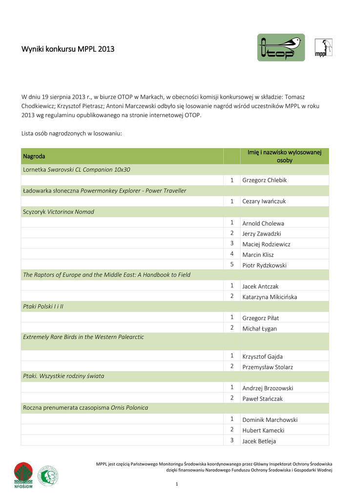Wyniki konkursu MPPL 2013 W dniu 19 sierpnia 2013 r., w biurze OTOP w Markach, w obecności komisji konkursowej w składzie: Tomasz Chodkiewicz; Krzysztof Pietrasz; Antoni Marczewski odbyło się losowanie nagród wśród uczestników MPPL w roku 2013 wg regulaminu opublikowanego na stronie internetowej OTOP. Lista osób nagrodzonych w losowaniu: Imię i nazwisko wylosowanej osoby Nagroda Lornetka Swarovski CL Companion 10x30 1 Grzegorz Chlebik 1 Cezary Iwańczuk 1 Arnold Cholewa 2 Jerzy Zawadzki 3 Maciej Rodziewicz 4 Marcin Klisz 5 Piotr Rydzkowski 1 Jacek Antczak 2 Katarzyna Mikicińska 1 Grzegorz Piłat 2 Michał Łygan 1 Krzysztof Gajda 2 Przemysław Stolarz 1 Andrzej Brzozowski 2 Paweł Stańczak 1 Dominik Marchowski 2 Hubert Kamecki 3 Jacek Betleja Ładowarka słoneczna Powermonkey Explorer - Power Traveller Scyzoryk Victorinox Nomad The Raptors of Europe and the Middle East: A Handbook to Field Ptaki Polski I i II Extremely Rare Birds in the Western Palearctic Ptaki. Wszystkie rodziny świata Roczna prenumerata czasopisma Ornis Polonica MPPL jest częścią Państwowego Monitoringu Środowiska koordynowanego przez Główny Inspektorat Ochrony Środowiska dzięki finansowaniu Narodowego Funduszu Ochrony Środowiska i Gospodarki Wodnej 1 4 Jacek Dymitrowicz 5 Jakub Marciniak 6 Karol Sieczak 7 Łukasz Kurkowski 8 Marcin Urban 9 Michał Radziszewski 10 Stanisław Burdziej 1 Marek Grzybowski 2 Michał Jasiński 3 Paweł Butkiewicz 4 Rafał Salach 5 Sławomir Chmielewski 1 Aleksandra Krogulec 2 Andrzej Dylik 3 Arkadiusz Kudłacik 4 Marcin Sołowiej 5 Mariusz Blank 6 Piotr Kozłowski 7 Piotr Zaborowski 8 Sławomir Jankowski 9 Szymon Łopacki 10 Wojciech Chmielarski 1 Piotr Szypulski 1 Tadeusz Czwałga 1 Julian Lewandowski 1 Dariusz Piechota 2 Leszek Kokoszka 3 Michał Barcz 4 Paweł Marczakowski 5 Rafał Wiktorowski 6 Roman Łygan Latarka czołowa Outdoor Pro HLS-K4 - MacTronic Krzesiwo turystyczne FireSteel 2.0 Scout - Light My Fire Nagrody ufundowane przez Przyrodnicze.pl Album Sowy Polski Czasopismo Ptaki Śląska (po 1 ezg. z nr 12-19) Ptaki krukowate Polski Kubek ornitologiczny MPPL jest częścią Państwowego Monitoringu Środowiska koordynowanego przez Główny Inspektorat Ochrony Środowiska dzięki finansowaniu Narodowego Funduszu Ochrony Środowiska i Gospodarki Wodnej 2 7 Sławomir Michoń 8 Sylwester Aftyka 1 Paweł Antoniewicz 2 Sabina Kaszak 1 Jarosław Sułek Nagrody ufundowane przez TROPIKER.pl Bandana antykomarowa, antykleszczowa Insect Shield Czapka z daszkiem i fartuchami przeciwsłonecznymi, filtr UV Travel Cap Ganges UPF40+ - Care Plus 2 Paweł Cieśluk Mini apteczka - Care Plus + żel antybakteryjny - Care Plus lub mydło biodegradowalne - Care Plus 1 Paweł Mielczarek 2 Łukasz Matyjasiak 3 Michał Przystański Serdecznie dziękujemy wszystkim obserwatorom, gratulujemy nagrodzonym i życzymy szczęścia w przyszłorocznym losowaniu! MPPL jest częścią Państwowego Monitoringu Środowiska koordynowanego przez Główny Inspektorat Ochrony Środowiska dzięki finansowaniu Narodowego Funduszu Ochrony Środowiska i Gospodarki Wodnej 3