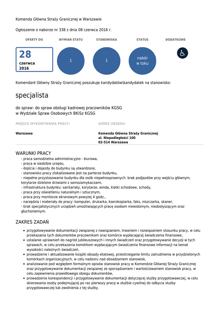 Komenda Główna Straży Granicznej w Warszawie Ogłoszenie o naborze nr 338 z dnia 08 czerwca 2016 r. OFERTY DO 28 czerwca 2016 WYMIAR ETATU STANOWISKA STATUS 1 1 nabór w toku DODATKOWE Komendant Główny Straży Granicznej poszukuje kandydatów\kandydatek na stanowisko: specjalista do spraw: do spraw obsługi kadrowej pracowników KGSG w Wydziale Spraw Osobowych BKiSz KGSG MIEJSCE WYKONYWANIA PRACY: ADRES URZĘDU: Warszawa Komenda Główna Straży Granicznej al. Niepodległości 100 02-514 Warszawa WARUNKI PRACY - praca samodzielna administracyjno - biurowa, - praca w siedzibie urzędu, - dojścia i dojazdy do budynku są utwardzone, - stanowisko pracy zlokalizowane jest na parterze budynku, - niepełne przystosowanie budynku dla osób niepełnosprawnych: brak podjazdów przy wejściu głównym, korytarze dzielone drzwiami z samozamykaczami, - infrastruktura budynku: sanitariaty, korytarze, winda, klatki schodowe, schody, - praca przy oświetleniu naturalnym i sztucznym, - praca przy monitorze ekranowym powyżej 4 godz., - narzędzia i materiały do pracy: komputer, drukarka, kserokopiarka, faks, niszczarka, skaner, - brak specjalistycznych urządzeń umożliwiających pracę osobom niewidomym, niedosłyszącym oraz głuchoniemym. ZAKRES ZADAŃ przygotowywanie dokumentacji związanej z nawiązaniem, trwaniem i rozwiązaniem stosunku pracy, w celu przekazania tych dokumentów pracownikom oraz komórce wypłacającej świadczenia finansowe, ustalanie uprawnień do nagród jubileuszowych i innych świadczeń oraz przygotowywanie decyzji w tych sprawach, w celu przekazania komórkom wypłacającym świadczenia finansowe informacji na temat wysokości należnych świadczeń, prowadzenie i aktualizowanie książki obsady etatowej, przestrzeganie limitu zatrudnienia w przydzielonych komórkach organizacyjnych, w celu nadzoru nad obsadzaniem stanowisk, analizowanie pod względem formalnym opisów stanowisk pracy w Komendzie Głównej Straży Granicznej oraz przygotowywanie dokumentacji związanej ze sporządzaniem i wartościowaniem stanowisk pracy, w celu zapewnienia prawidłowego obiegu dokumentów, prowadzenie korespondencji i przygotowywanie dokumentacji dotyczącej służby przygotowawczej, w celu skierowania osoby podejmującej po raz pierwszy pracę w służbie cywilnej do odbycia służby przygotowawczej lub zwolnienia z tej służby, zakładanie i prowadzenie teczek akt osobowych pracowników przydzielonych komórek organizacyjnych, w celu przechowywania dokumentacji pracowniczej, prowadzenie kart urlopowych i absencji pracowników w przydzielonych komórkach organizacyjnych, w celu dostarczenia aktualnych informacji, przygotowywanie i kompletowanie dokumentacji w sprawach emerytalno-rentowych, w celu przekazania jej do Zakładu Ubezpieczeń Społecznych. WYMAGANIA NIEZBĘDNE Wykształcenie: wyższe doświadczenie zawodowe: 1 rok w obsłudze kadrowej pracowników pozytywne przejście procedury sprawdzającej, w celu uzyskania poświadczenia bezpieczeństwa osobowego uprawniającego do dostępu do informacji niejawnych, znajomość przepisów prawa pracy oraz systemu ubezpieczeń społecznych, znajomość ustawy o służbie cywilnej, umiejętność stosowania przepisów prawa w praktyce, obsługa komputera, komunikatywność, terminowość, skrupulatność. Posiadanie obywatelstwa polskiego Korzystanie z pełni praw publicznych Nieskazanie prawomocnym wyrokiem za umyślne przestępstwo lub umyśle przestępstwo skarbowe WYMAGANIA DODATKOWE Wykształcenie: wyższe Profil wykształcenia: prawnicze, administracyjne lub pokrewne. DOKUMENTY I OŚWIADCZENIA NIEZBĘDNE Życiorys/CV i list motywacyjny Kopie dokumentów potwierdzających spełnienie wymagania niezbędnego w zakresie wykształcenia Kopie dokumentów potwierdzających spełnienie wymagania niezbędnego w zakresie doświadczenia zawodowego / stażu pracy Oświadczenie o posiadaniu obywatelstwa polskiego albo kopia dokumentu potwierdzającego posiadanie polskiego obywatelstwa Oświadczenie o wyrażeniu zgody na przetwarzanie danych osobowych do celów naboru Oświadczenie o korzystaniu z pełni praw publicznych Oświadczenie o nieskazaniu prawomocnym wyrokiem za umyślne przestępstwo lub umyślne przestępstwo skarbowe DOKUMENTY I OŚWIADCZENIA DODATKOWE kopia dokumentu potwierdzającego niepełnosprawność - w przypadku kandydatek/kandydatów, zamierzających skorzystać z pierwszeństwa w zatrudnieniu w przypadku, gdy znajdą się w gronie najlepszych kandydatek/kandydatów Kopie dokumentów potwierdzających spełnienie wymagania dodatkowego w zakresie wykształcenia kopie innych dokumentów potwierdzających posiadane kwalifikacje. TERMINY I MIEJSCE SKŁADANIA DOKUMENTÓW Dokumenty należy złożyć do: 28 czerwca 2016 r. Decyduje data: stempla pocztowego / osobistego dostarczenia oferty do urzędu Miejsce składania dokumentów: Biuro Kadr i Szkolenia Komendy Głównej Straży Granicznej Al. Niepodległości 100 02-514 Warszawa z dopiskiem "oferta pracy – specjalista BKiSz KGSG oraz numer ogłoszenia" INNE INFORMACJE: W miesiącu poprzedzającym datę upublicznienia ogłoszenia wskaźnik zatrudnienia osób niepełnosprawnych w urzędzie, w rozumieniu przepisów o rehabilitacji zawodowej i społecznej oraz zatrudnianiu osób niepełnosprawnych, nie wynosi co najmniej 6%. - wynagrodzenie na powyższym stanowisku wynosi ok. 2037 zł. netto + dodatek za wysługę lat, - dokumenty należy składać osobiście w siedzibie urzędu lub listownie, - oferty otrzymane po terminie nie będą rozpatrywane – decyduje data przyjęcia oferty w urzędzie lub data stempla pocztowego, - rozpatrzeniu nie będą podlegać oferty niespełniające wymagań określonych w ogłoszeniu a także oferty, które nie zawierają kompletu wymaganych oraz uwiarygodnionych (opatrzonych datą i własnoręcznym podpisem kandydata) dokumentów i oświadczeń, - kandydaci zakwalifikowani będą informowani telefonicznie lub za pośrednictwem poczty elektron