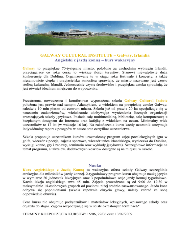 GALWAY CULTURAL INSTITUTE – Galway, Irlandia Angielski z jazdą konną – kurs wakacyjny Galway to przepiękne 70-tysięczne miasto, położone za zachodnim wybrzeżu Irlandii, przyciągające co roku coraz to większe ilości turystów. Stanowi niewątpliwie dużą konkurencję dla Dublina. Organizowane tu w ciągu roku festiwale i koncerty, a także niesamowicie ciepła i przyjacielska atmosfera sprawiają, że miasto nazywane jest często stolicą kulturalną Irlandii. Jednocześnie czyste środowisko i przepiękna zatoka sprawiają, że jest również idealnym miejscem do wypoczynku. Przestronna, nowoczesna i komfortowo wyposażona szkoła Galway Cultural Insiute położona jest prawie nad samym Atlantykiem, z widokiem na przepiękną zatokę Galway, zaledwie 10 min pieszo od centrum miasta. Szkoła już od prawie 20 lat specjalizuje się w nauczaniu cudzoziemców, wielokrotnie zdobywając wyróżnienia licznych organizacji zrzeszających szkoły językowe. Posiada salę multimedialną, bibliotekę, salę komputerową z bezpłatnym dostępem do Internetu oraz kafejkę z widokiem na ocean. Minimalny wiek uczestników to 17 lat (w wakacje 16 lat). Na zakończenie kursu każdy uczestnik otrzymuje indywidualny raport z postępów w nauce oraz certyfikat uczestnictwa. Szkoła proponuje uczestnikom kursów urozmaicony program zajęć pozalekcyjnych (gra w golfa, wieczór z poezją, zajęcia sportowe, wieczór tańca irlandzkiego, wycieczka do Dublina, wyścigi konne, gry i zabawy, seminaria oraz wykłady językowe). Szczegółowe informacje na temat programu, a także ew. dodatkowych kosztów dostępne są na miejscu w szkole. Nauka Kurs Angielskiego z Jazdą Konną to wakacyjna oferta szkoły Galway szczególnie atrakcyjna dla miłośników jazdy konnej. 2-tygodniowy program kursu obejmuje naukę języka w wymiarze 20 jednostek lekcyjnych oraz 3 popołudniowe sesje jazdy konnej tygodniowo. Każda lekcja angielskiego trwa 45 min. Zajęcia prowadzone są od 9:00 do 12:30 w maksymalnie 14-osobowych grupach od poziomu niżej średnio-zaawansowanego. Jazda kona odbywa się popołudniami (szkoła zapewnia okrycia głowy, należy zabrać ze sobą odpowiednie obuwie). Cena kursu nie obejmuje podręczników i materiałów lekcyjnych, wpisowego szkoły oraz dojazdu do stajni. Zajęcia rozpoczynają się w ściśle określonych terminach*. TERMINY ROZPOCZĘCIA KURSÓW: 15/06, 29/06 oraz 13/07/2009 • • Zakwaterowanie rodzina goszcząca: pokój 1-osobowy, wyżywienie HB (śniadanie i obiadokolacja); dostępna opcja z prywatną łazienką, odległość od szkoły 15-20 min jazdy komunikacją miejską (koszty przejazdów pokrywa student) nowoczesne apartamenty: pokoje 1- lub 2-osobowe (dla podróżujących razem), bez wyżywienia, odległość od szkoły to od 15 do 35 min pieszo lub 15 min jazdy komunikacją miejską (koszt dojazdu pokrywa student); na początku pobytu pobierany jest depozyt zwrotny na poczet ewentualnych zniszczeń w wysokości 150 EUR Transfer Szkoła organizuje transfer z i na lotnisko.
