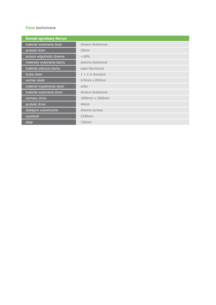 Dane techniczne Domek ogrodowy Narcyz materiał wykonania ścian drewno świerkowe grubość ścian 28mm poziom wilgotności drewna ~18% materiały wykonania dachu drewno świerkowe materiał pokrycia dachu papa bitumiczna liczba okien 1 + 2 w drzwiach wymiar okien 670mm x 850mm materiał wypełnienia okien szkło materiał wykonania drzwi drewno świerkowe wymiary drzwi 1800mm x 1800mm grubość drzwi 40mm dostępne wykończenia drewno surowe wysokość 2340mm okap 150mm
