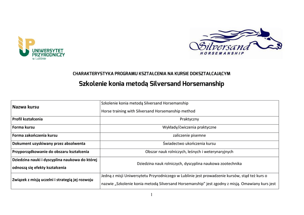 Nazwa kursu Szkolenie konia metodą Silversand Horsemanship Horse training with Silversand Horsemanship method Profil kształcenia Praktyczny Forma kursu Wykłady/ćwiczenia praktyczne Forma zakończenia kursu zaliczenie pisemne Dokument uzyskiwany przez absolwenta Przyporządkowanie do obszaru kształcenia Dziedzina nauki i dyscyplina naukowa do której odnoszą się efekty kształcenia Związek z misją uczelni i strategią jej rozwoju Świadectwo ukończenia kursu Obszar nauk rolniczych, leśnych i weterynaryjnych Dziedzina nauk rolniczych, dyscyplina naukowa zootechnika Jedną z misji Uniwersytetu Przyrodniczego w Lublinie jest prowadzenie kursów, stąd też kurs o nazwie „Szkolenie konia metodą Silversand Horsemanship” jest zgodny z misją. Omawiany kurs jest 1 także powiązany z kierunkowymi celami strategicznymi: w pkt. I. (Działalność dydaktyczna) wymienia się rozwój kształcenia ustawicznego, w pkt. VI (Finanse Uczelni) wyróżnione jest aktywne uczestniczenie wszystkich jednostek w procesie pozyskiwania dodatkowych środków finansowych na działalność dydaktyczną i badawczą, zaś w pkt. VII (Współpraca ze środowiskiem lokalnym) zwraca się uwagę na skorelowanie działalności dydaktycznej z potrzebami regionu lubelskiego i regionów sąsiednich. Ogólne cele kształcenia: poznanie znaczenia jeździectwa naturalnego w procesie szkolenia konia, Ogólne cele kształcenia oraz możliwości zatrudnienia (typowe miejsca pracy) posiadanie wiedzy z zakresu psychiki konia w aspekcie jego użytkowania w zgodzie z naturą gatunku, umiejętność tzw. pracy z ziemi oraz pracy w siodle, w tym odczulania, pracy na kole, cofania, przejść oraz użycia wodzy pośredniej i bezpośredniej, Możliwości zatrudnienia: ośrodki hodowli koni, kluby jeździeckie, ośrodki hipoterapeutyczne Wymagania wstępne i zasady rekrutacji Różnice w stosunku do innych kursów w Uczelni Deklarowane kompetencje z podstaw wiedzy o koniu i jego użytkowaniu. Złożenie kompletu dokumentów w CKU. Decyduje kolejność zgłoszeń. Szkolenie konia metodą Silversand Horsemanship jest jedynym tego typu kursem na Uczelni. Informacja o sposobie wykorzystania wzorców międzynarodowych, sposobie uwzględnienia Szkolenie konia metodą Silversand Horsemanship jest zgodne ze standardami międzynarodowymi i zgodności efektów z potrzebami rynku pracy, stosowane jest na całym świecie. Program konsultowano z pracodawcami w celu uwzględnienia sposobie uwzględnienia wyników zapotrzebowania rynku pracy. Na zakończenie kursu uczestnicy wypełnią ankiety ewaluacyjne. monitorowania karier absolwentów 2 Każda edycja kursu będzie się kończyła wypełnianiem ankiet przez uczestników, w których będą oni Określenie procedury działania zapewniającej w mogli przedstawić swoje uwagi na temat programu kursu. Ewentualne uwagi będą uwzględniane w cyklu rocznym doskonalenie programu kształcenia tworzeniu programów na kolejne edycje kursu. Wykaz zalecanej literatury Program Silversand Natural Horsemanship, 2003. Wyd. Agencja PDM. Von Neumann-Cosel I., 2010. Język koni – język ludzi. Porozumienie jest możliwe. Wyd. Akademia Jeździecka. Skorupski K., 2006. Psychologia treningu koni. Wyd. PWRiL. Miller R., 2009. Jeździectwo naturalne bez tajemnic. Wyd. Agencja PDM. Blendinger W., 2004. Wstęp do psychologii konia. Wyd. JiK. www.cku.up.lublin.pl 3