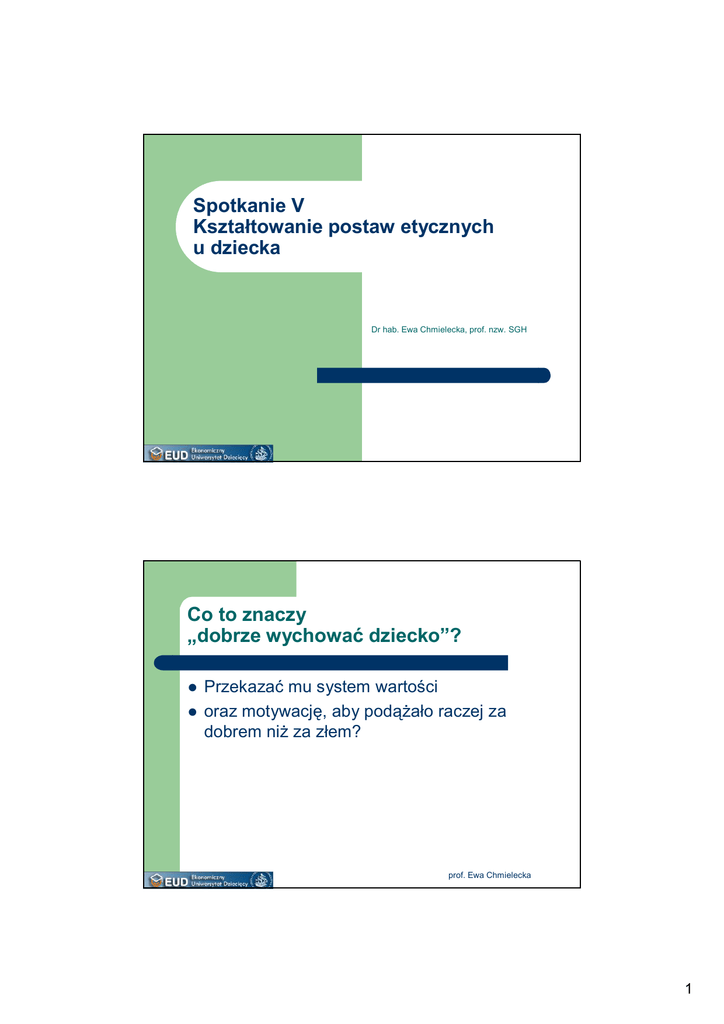 Spotkanie V Kształtowanie postaw etycznych u dziecka Dr hab. Ewa Chmielecka, prof. nzw. SGH Co to znaczy „dobrze wychować dziecko”? Przekazać mu system wartości oraz motywację, aby podążało raczej za dobrem niż za złem? prof. Ewa Chmielecka 1 Co to znaczy „dobrze wychować dziecko”? "Problemem wychowania nie jest to, jak dobrze pokierować człowiekiem, jak skłonić go, aby podążał za najlepszymi rozwiązaniami. Problemem jest to, jak obudzić w nim ducha wolności. Jak sprawić, aby chciał swobodnie, mądrze i odpowiedzialnie stanowić sam o sobie." Józef Tischner prof. Ewa Chmielecka Co się składa na kształcenie? Informacja, wiedza, mądrość a Umiejętności, rozumienie, postawy prof. Ewa Chmielecka 2 Jak kształtujemy postawy? przez naśladownictwo - dobry (lub zły) przykład inspirowane zaangażowanie refleksję humanistyczną prof. Ewa Chmielecka Humanistyka Zagrożenie indoktrynacją? – – Jawną Utajoną Humanistyka jako nauka: – – – – o człowieczeństwie o wartościach bez argumentacji rozstrzygającej z wieloma stanowiskami do wyboru prof. Ewa Chmielecka 3 Indoktrynacja jawna: czy moralność można skodyfikować? Problem etyki bez kodeksu. Akceptacja świata. Nihilizm i konserwatyzm moralny. Potrzeba samorealizacji a potrzeba bezpieczeństwa moralnego a kodeks moralny. Cechy kodeksu: spójność i kompletność vs – – – Asymetria powinności i roszczeń. Niejednorodność wartości. Asymetria powinności i wartości. Skutki „kodyfikacji”: utrata wrażliwości moralnej, nietolerancja, produkcja „świętych”. Dobre strony kodyfikacji: edukacja, kodeksy zawodowe. prof. Ewa Chmielecka Wartości Autoteliczne (samocelowe) a Instrumentalne („interesy”) prof. Ewa Chmielecka 4 Hierarchia dziedzin wartości Wartości typu sacrum (to co święte) Wartości duchowe (kulturowe, np. poznawcze, społeczne, prawne, estetyczne Wartości witalne, np. wartości życia, zdrowia, rozkwitu Wartości utylitarne (użytecznościowe) Wartości hedonistyczne (przyjemnościowe) Istotą dobra moralnego jest respektowanie hierarchii wartości. prof. Ewa Chmielecka Konkluzja Zadania rodziców nie są proste Zadania szkoły też nie są proste. prof. Ewa Chmielecka 5 Konkluzja Czego wymagać od szkoły? „Społeczeństwo otwarte” a w nim: – – – Ograniczenia wolności Sensowna humanistyka Zachęta do działania w imię wartości a nie tylko interesów (życie i tak wymusi „interesy”) prof. Ewa Chmielecka Dziękuję za uwagę! prof. Ewa Chmielecka 6